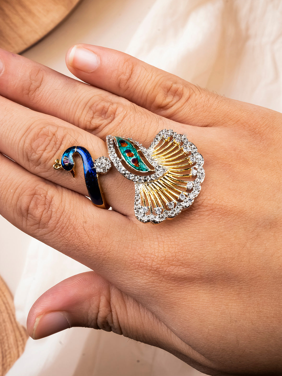 Showcasing artistic charm, this Elegant Enamel AD Peacock Cocktail Ring is a true statement piece. Adorned with sparkling American Diamonds and fine enamel detailing, it captures the beauty of a peacock. With its adjustable fit and bold design, this ring is perfect for parties, festive occasions, or gifting someone special.