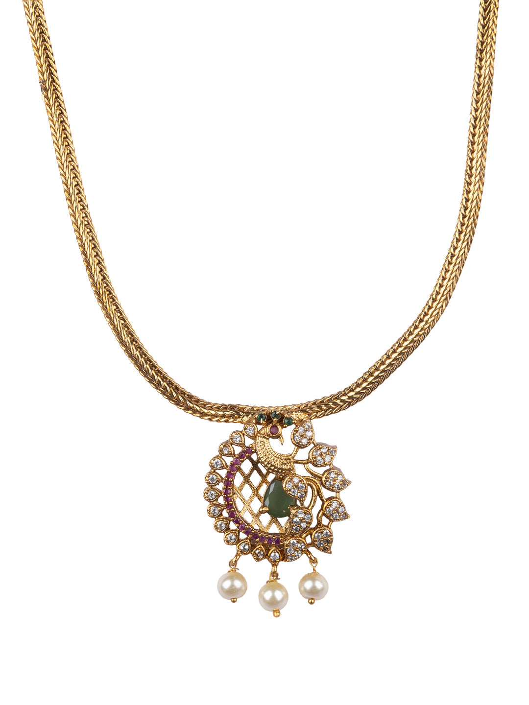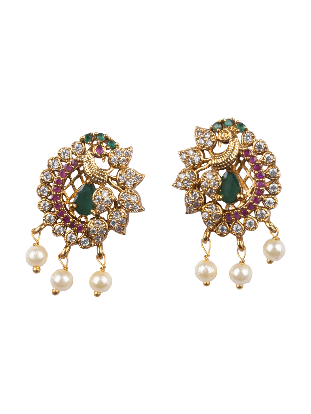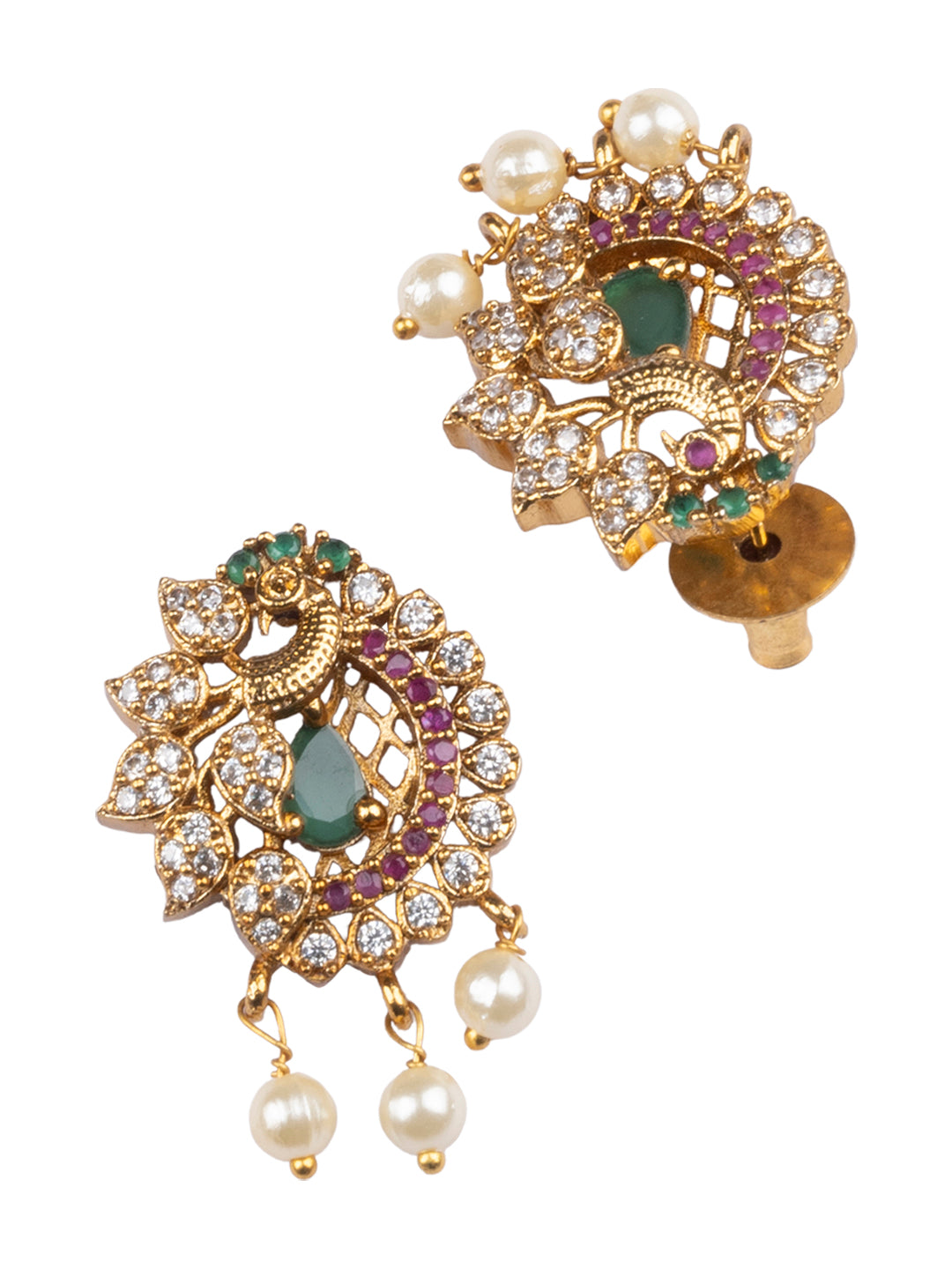 The Elegant Peacock Pendant Set features intricately designed earrings and delicate pearl drops. The graceful peacock motif symbolizes beauty and elegance, making it a perfect choice for special occasions. Crafted to add a refined touch, this set complements both traditional and contemporary outfits with effortless sophistication.