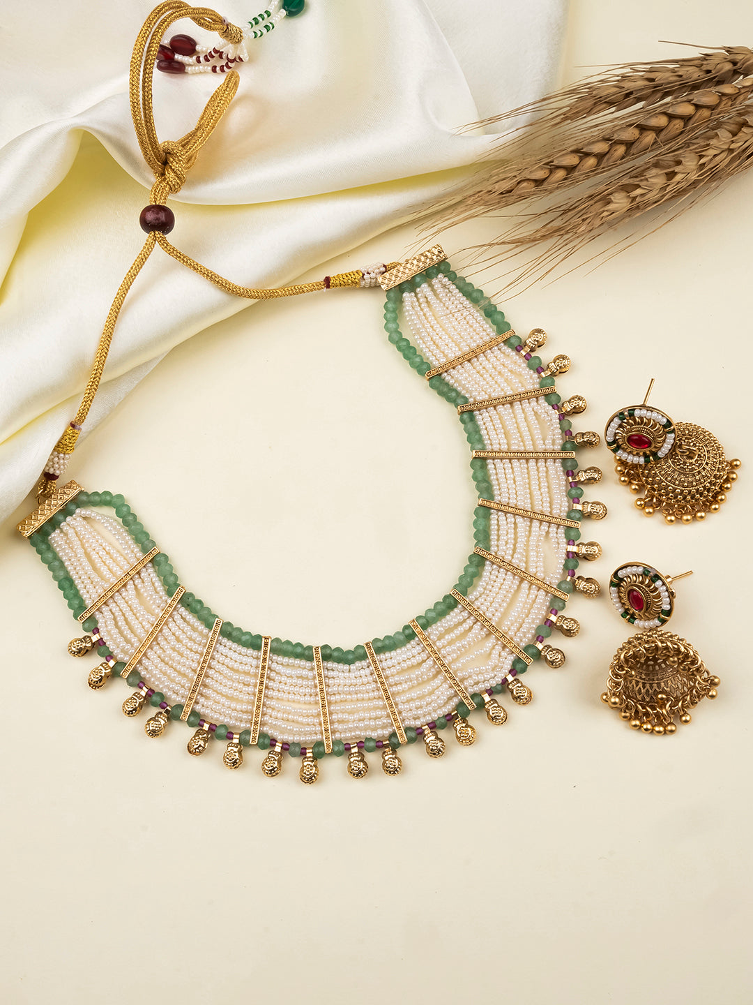This elegant choker-style Kundan Bandhai necklace is a blend of heritage design and modern finesse. Designed for brides and wedding guests, it sits beautifully on the neckline, adding a luxurious sparkle. The exquisite hand-crafted detailing ensures a graceful ethnic look.