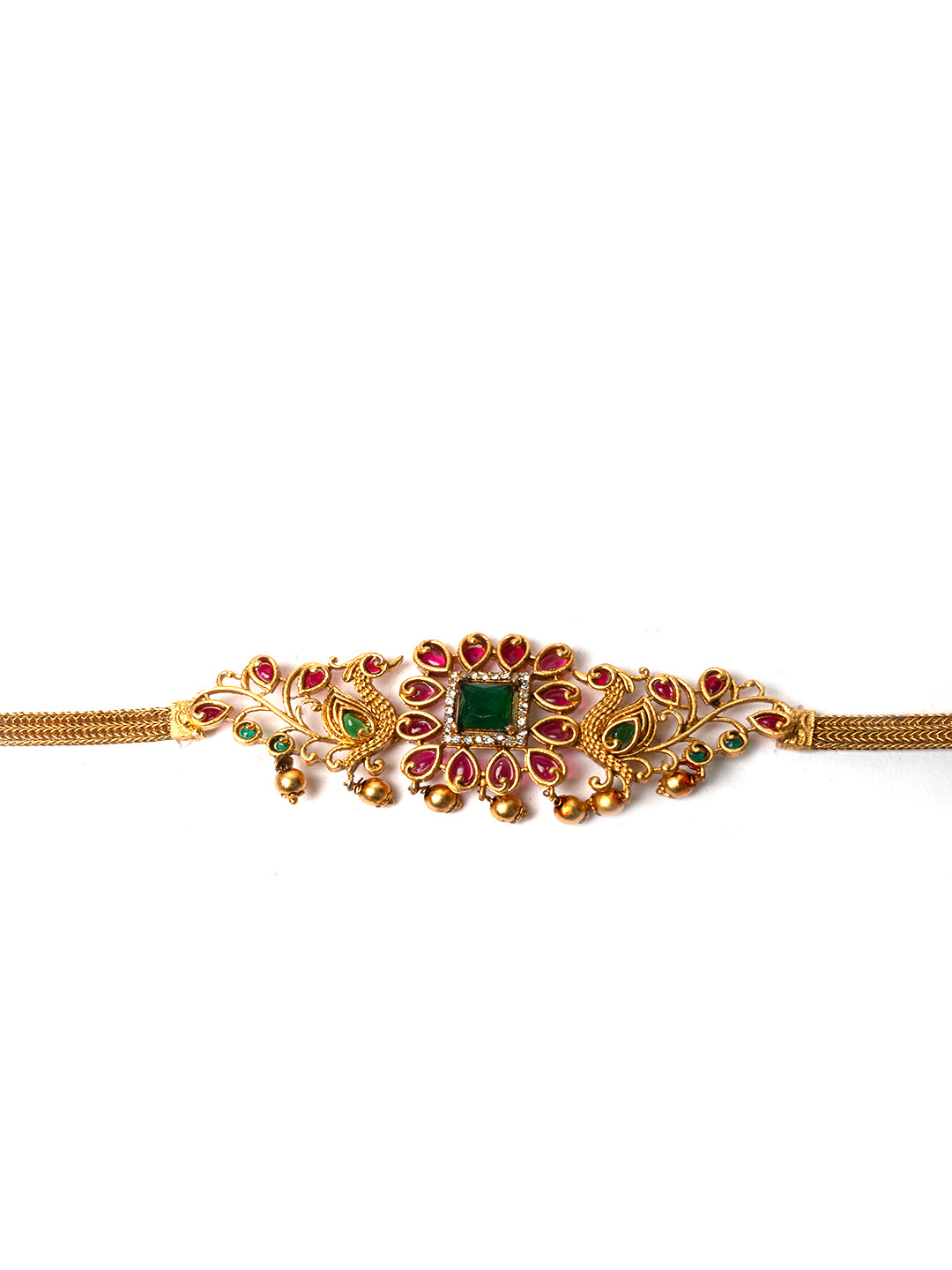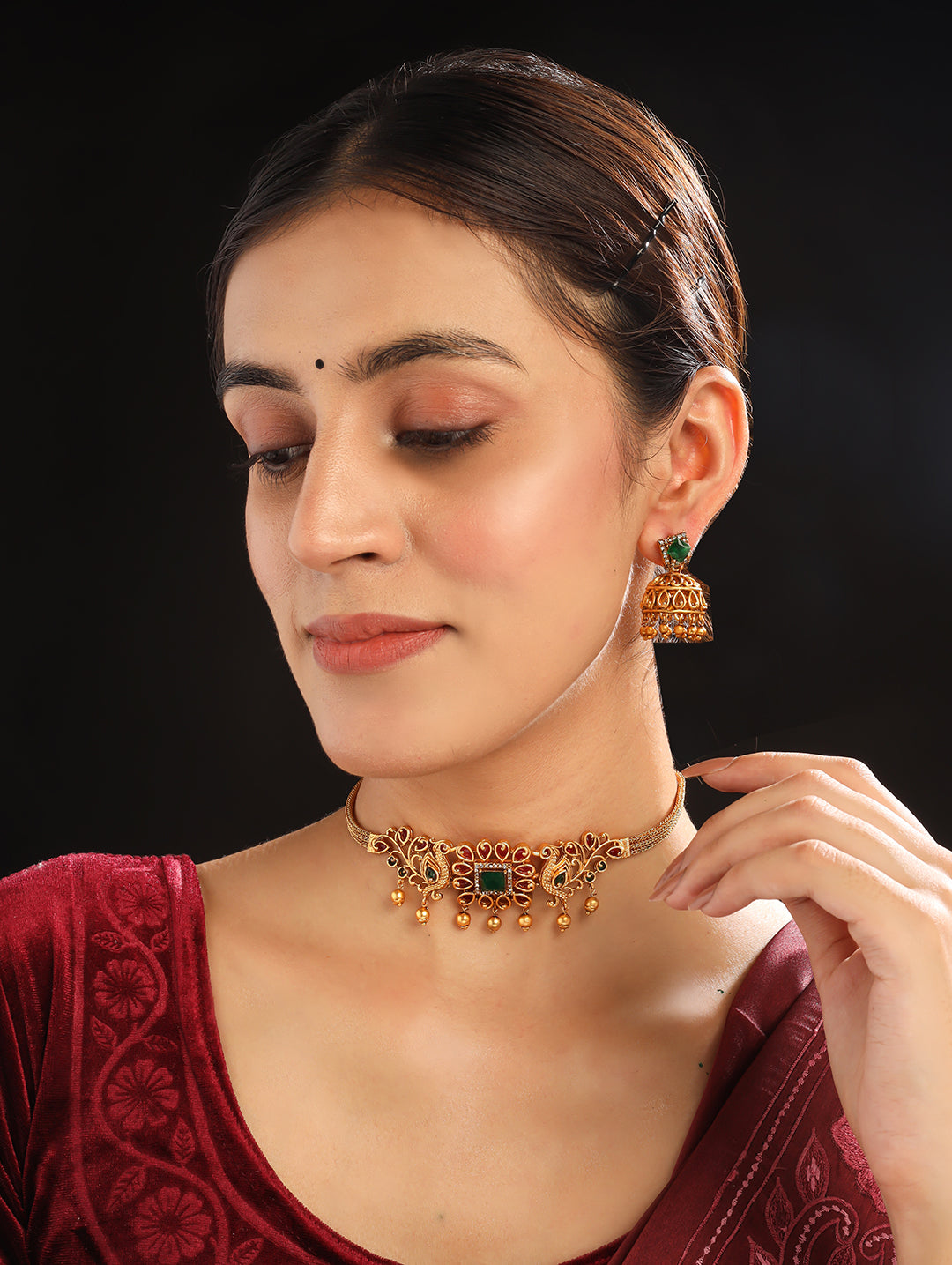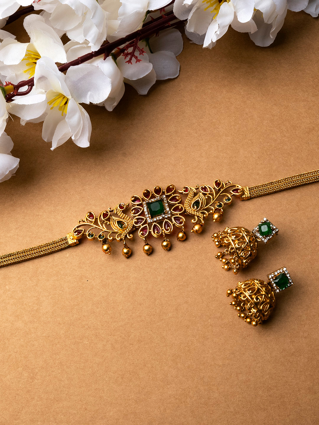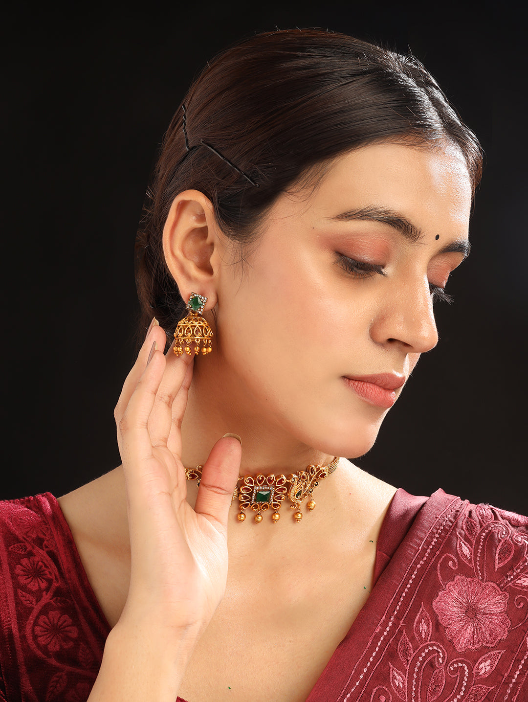 Indulge in luxurious elegance with our Exquisite Gold Plated Leaf Choker Set With Jhumkis. The intricate leaf design and sparkling jhumkis will add a touch of charm and sophistication to any outfit. Feel confident and empowered wearing this stunning piece. Elevate your style today!