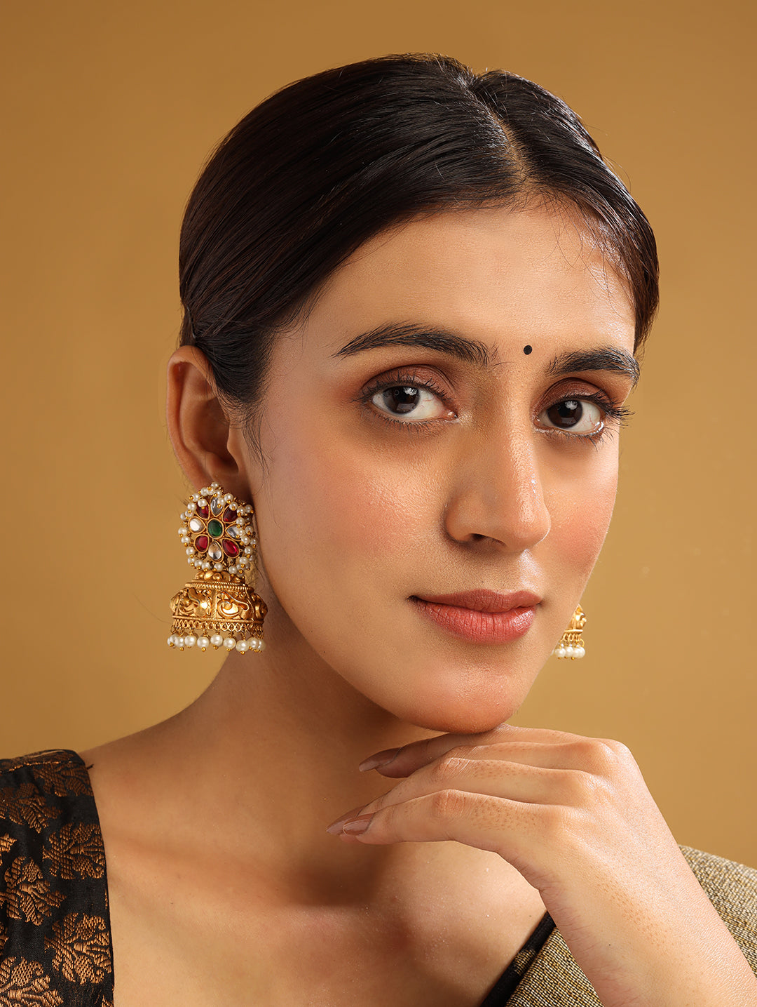 Gold plated Kundan jhumkas are designed with precision and finished with delicate pearl drops. Ideal for festive occasions, these earrings blend elegance with traditional craftsmanship for a stunning ethnic look.