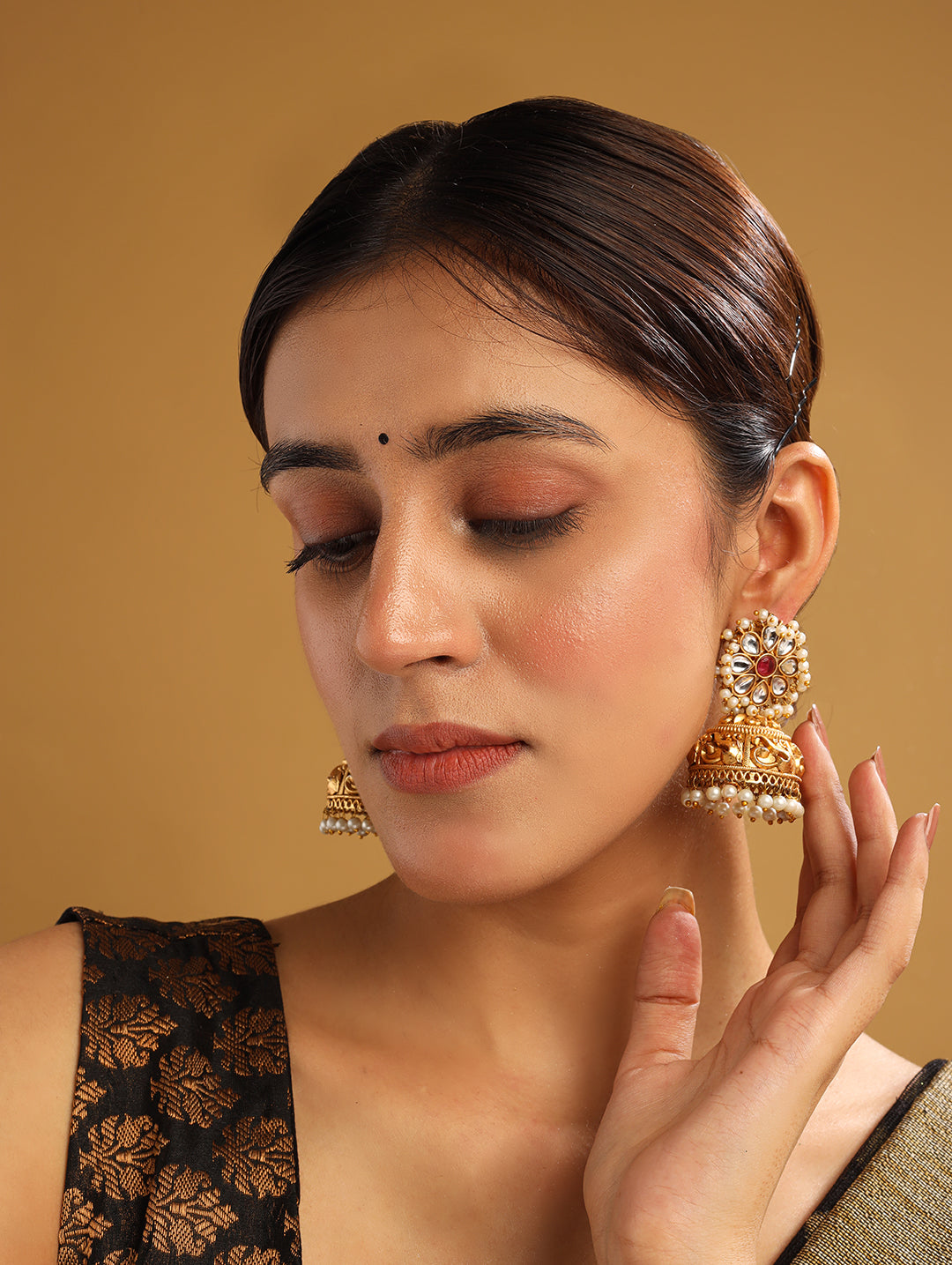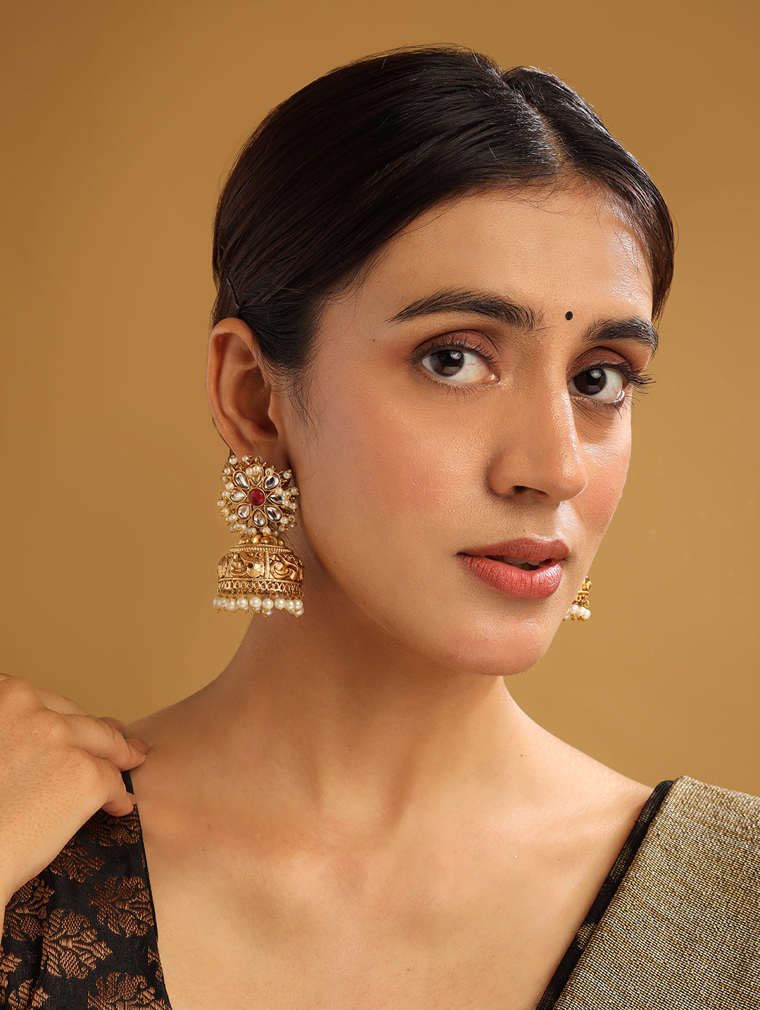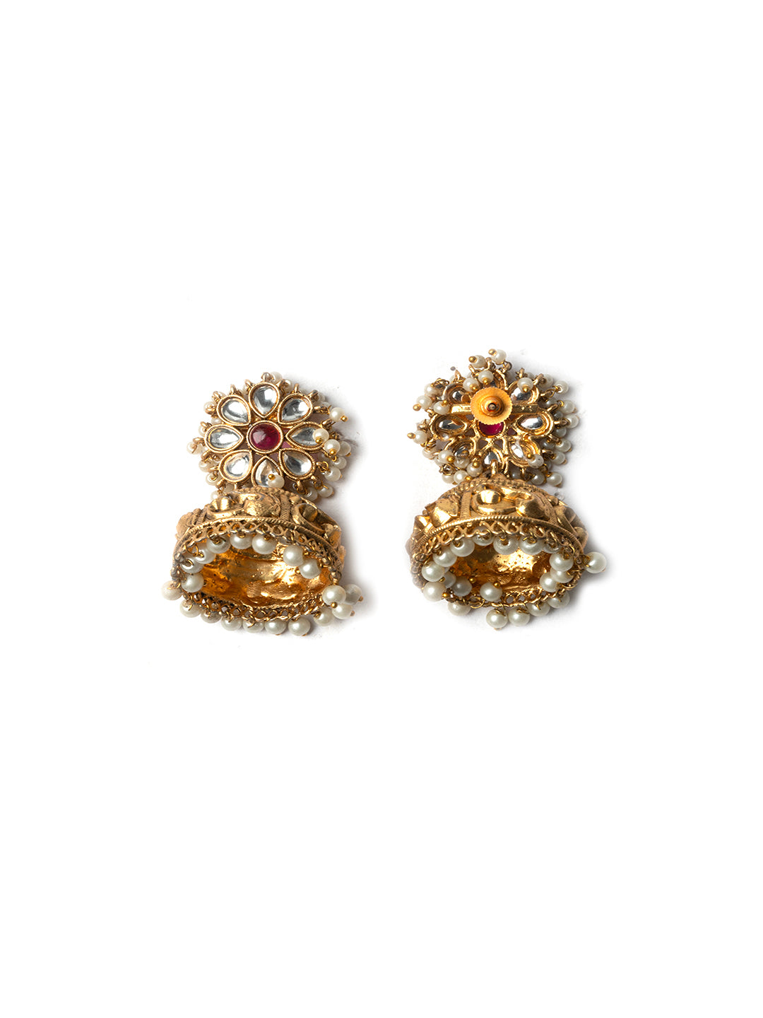 Gold plated Kundan jhumkas are designed with precision and finished with delicate pearl drops. Ideal for festive occasions, these earrings blend elegance with traditional craftsmanship for a stunning ethnic look.
