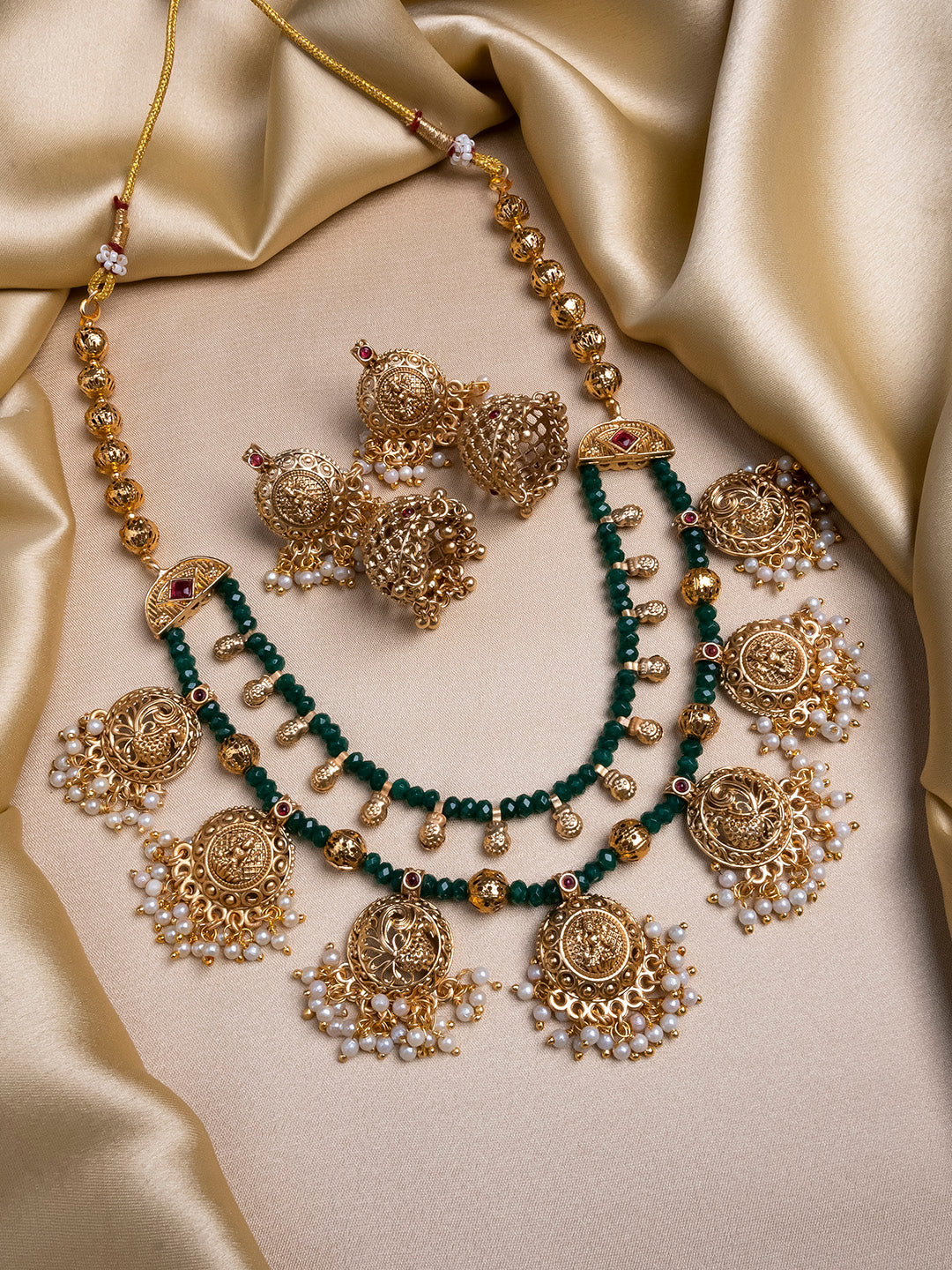 Elevate your style with our stunning Green Beads Double Line Filigree Necklace Set. The intricate filigree design paired with vibrant green beads creates a luxurious statement piece that draws attention. Perfect for special occasions or adding elegance to everyday outfits, this versatile set will become your go-to accessory for an instant style upgrade.