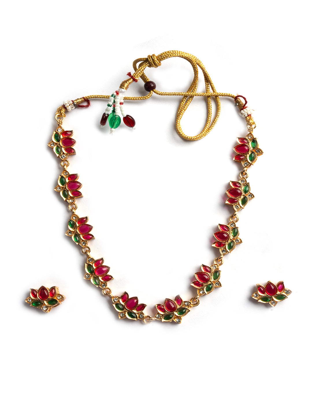 This elegant necklace set features a beautifully crafted lotus motif, adorned with vibrant ruby and green Kemp stones. The antique gold finish and traditional design make it perfect for festivals, weddings, and cultural gatherings.