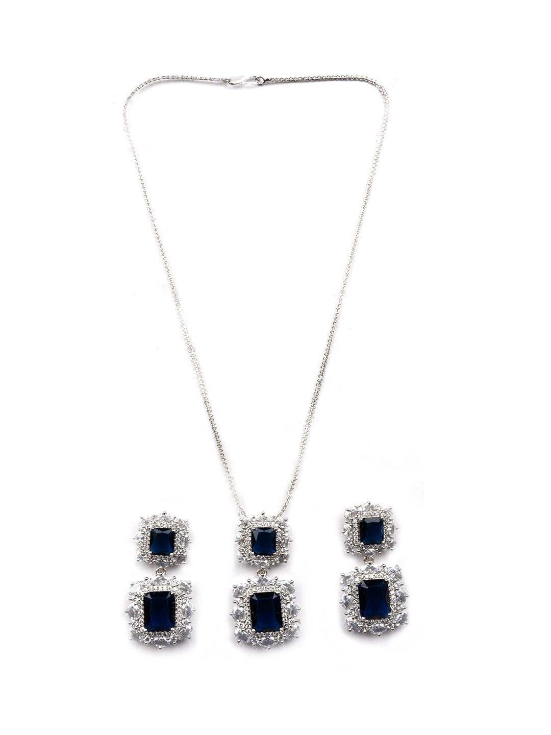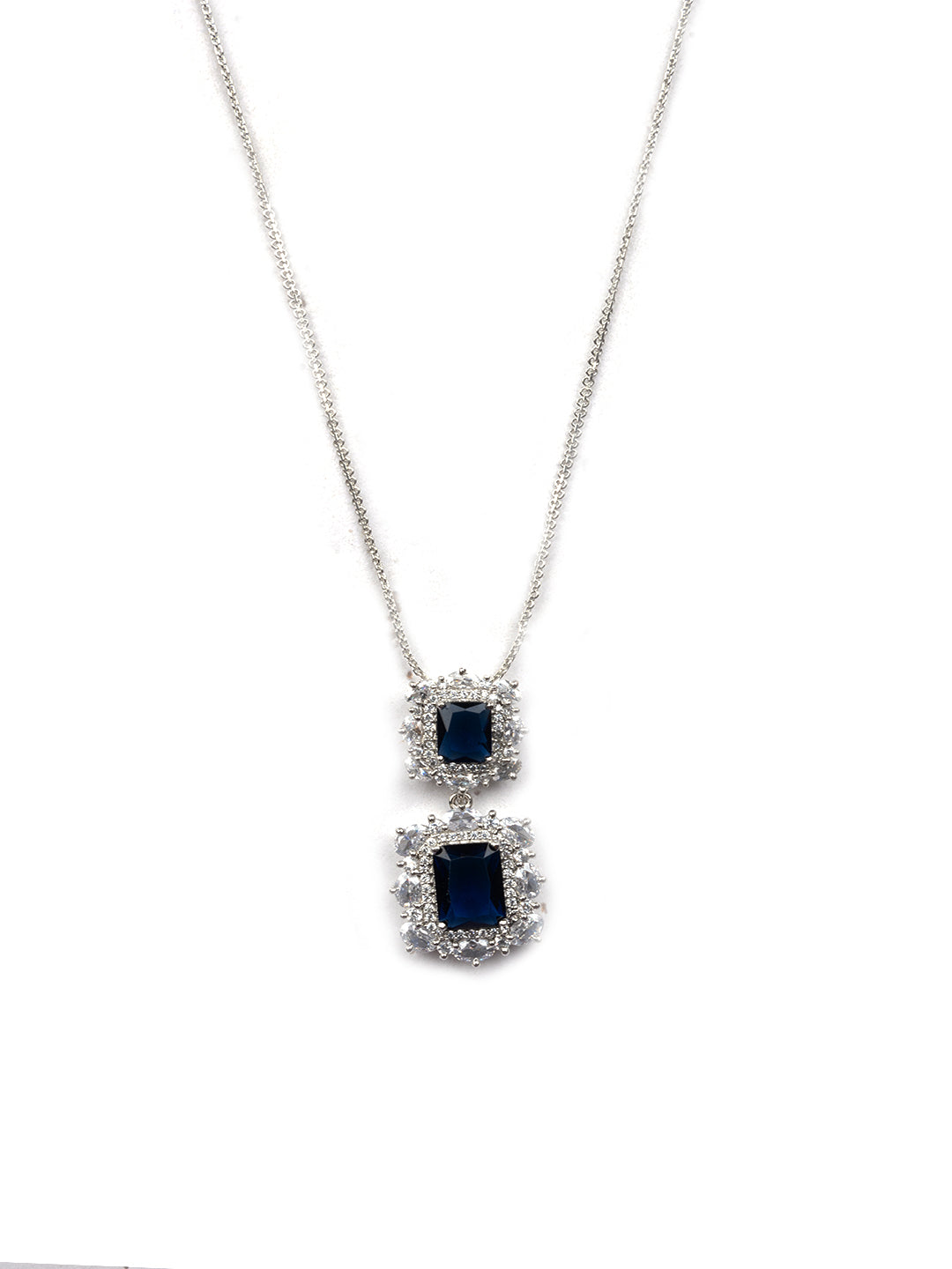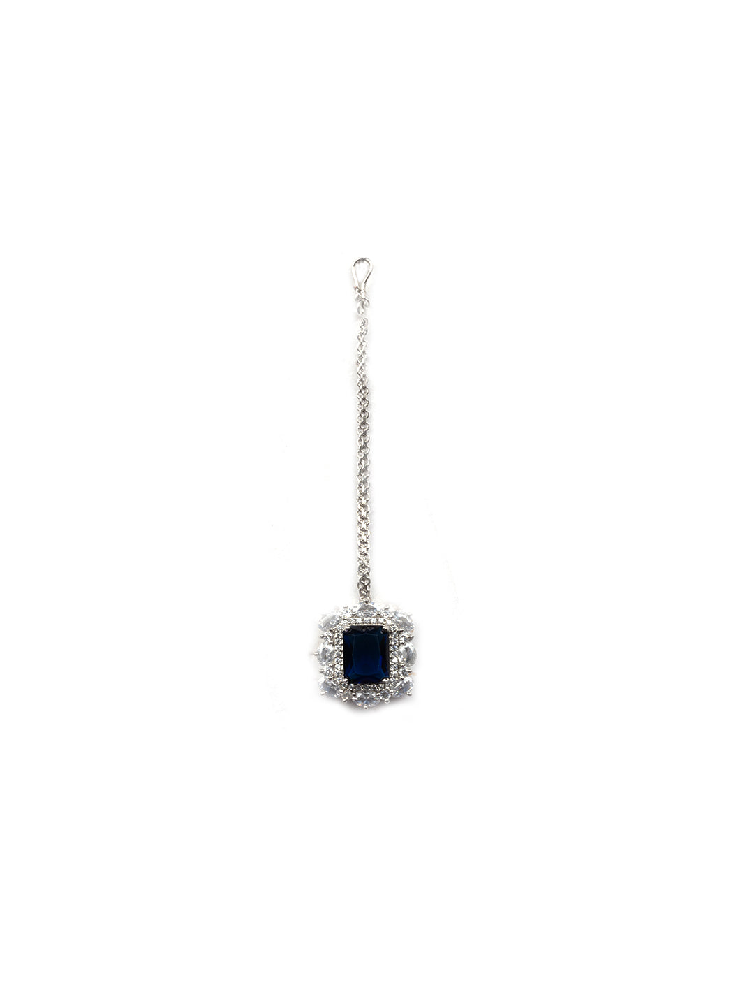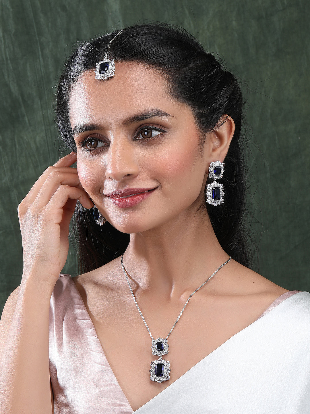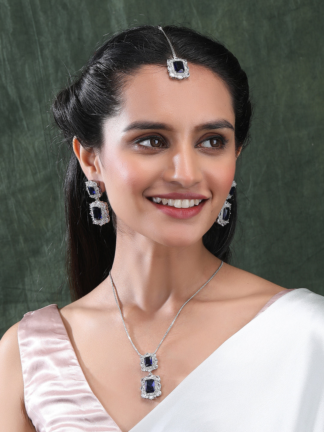 Unleash your inner elegance with our Silver Plated Square CZ Big Pendant Set, complete with matching earrings and maangtika. Crafted with precision and adorned with sparkling cubic zirconia, this set is sure to turn heads and make a statement wherever you go. Elevate your style effortlessly with this stunning jewelry ensemble.