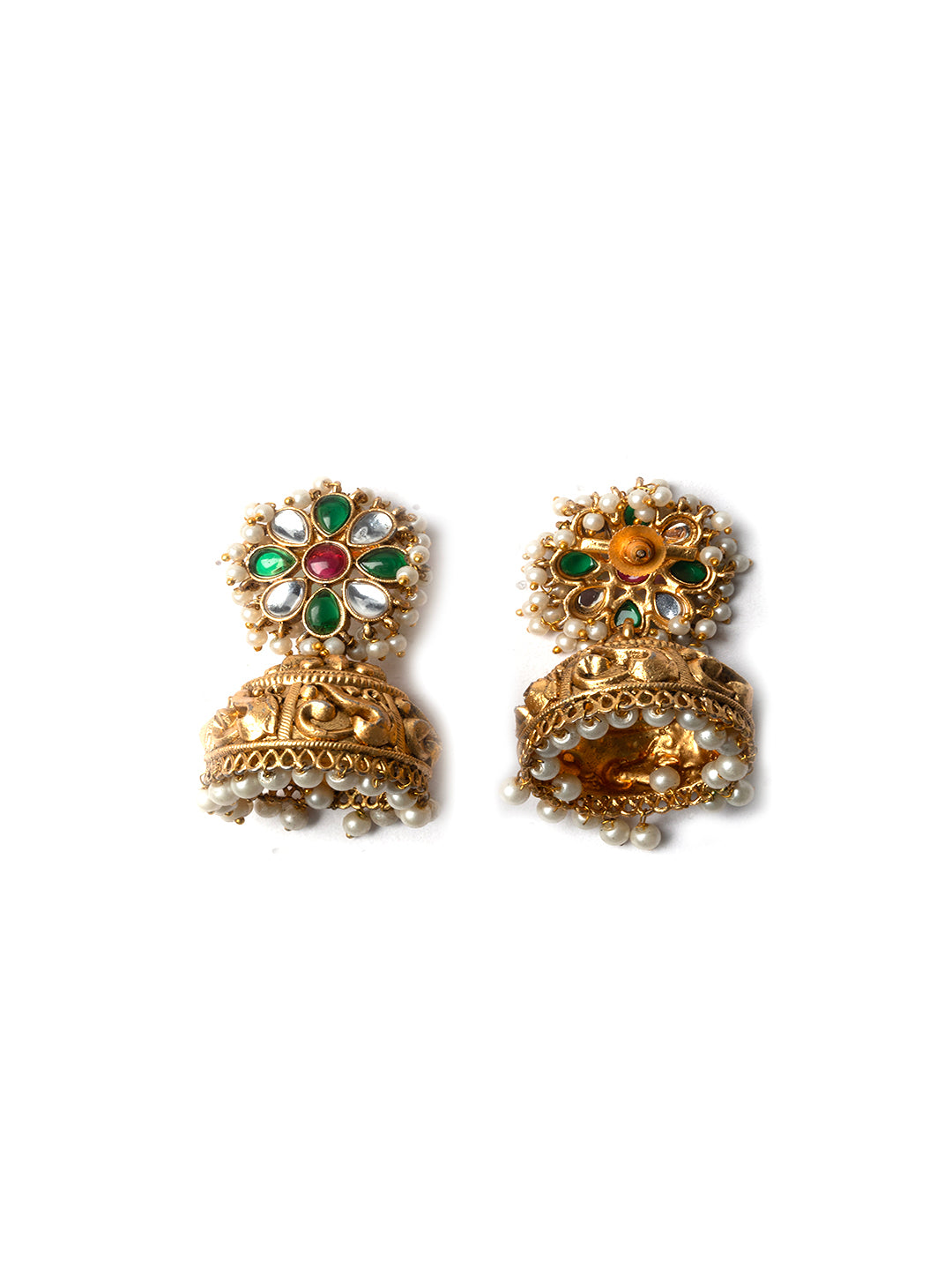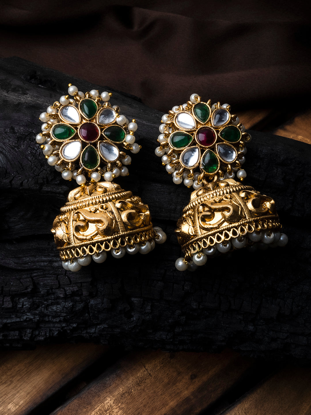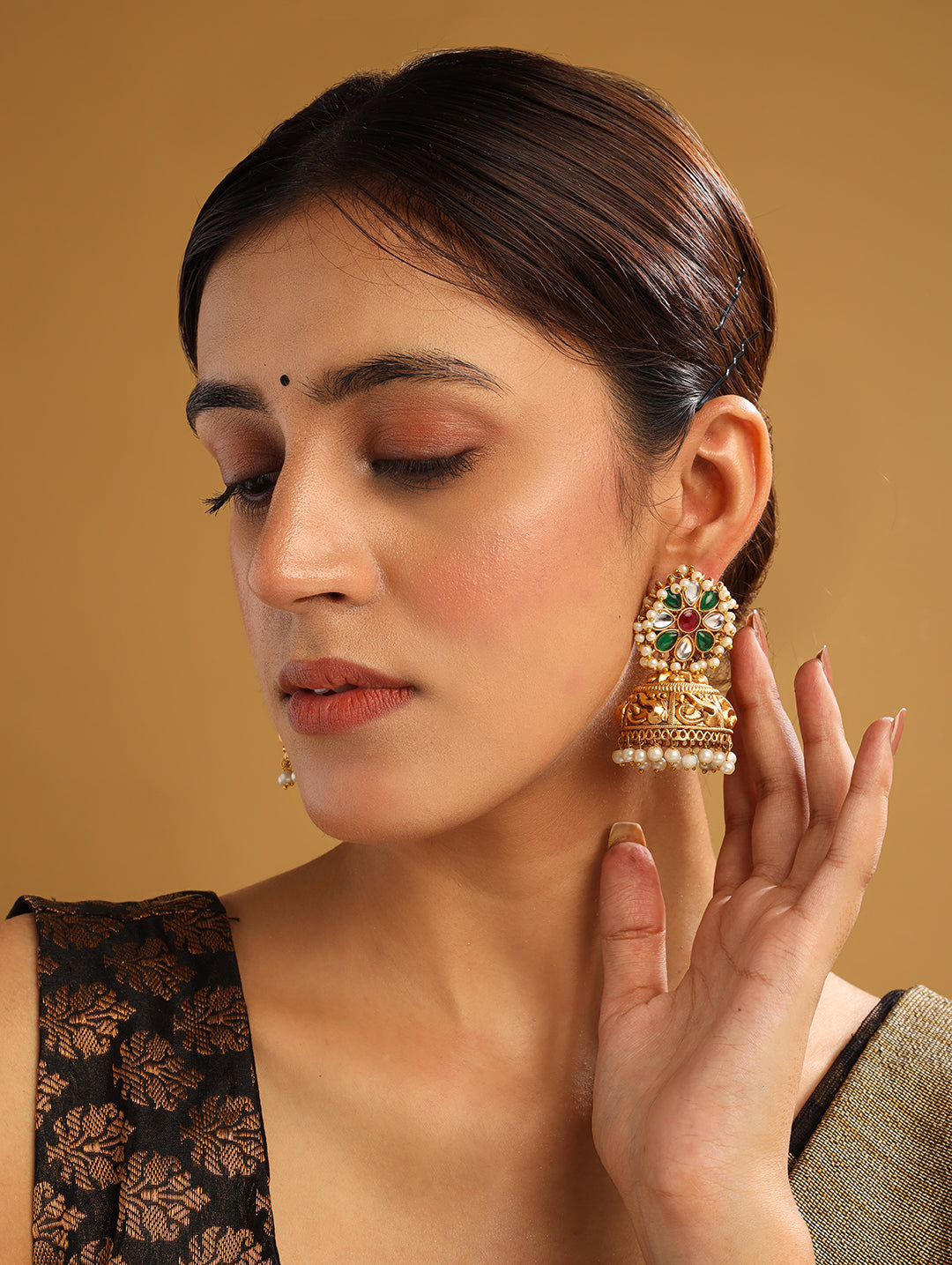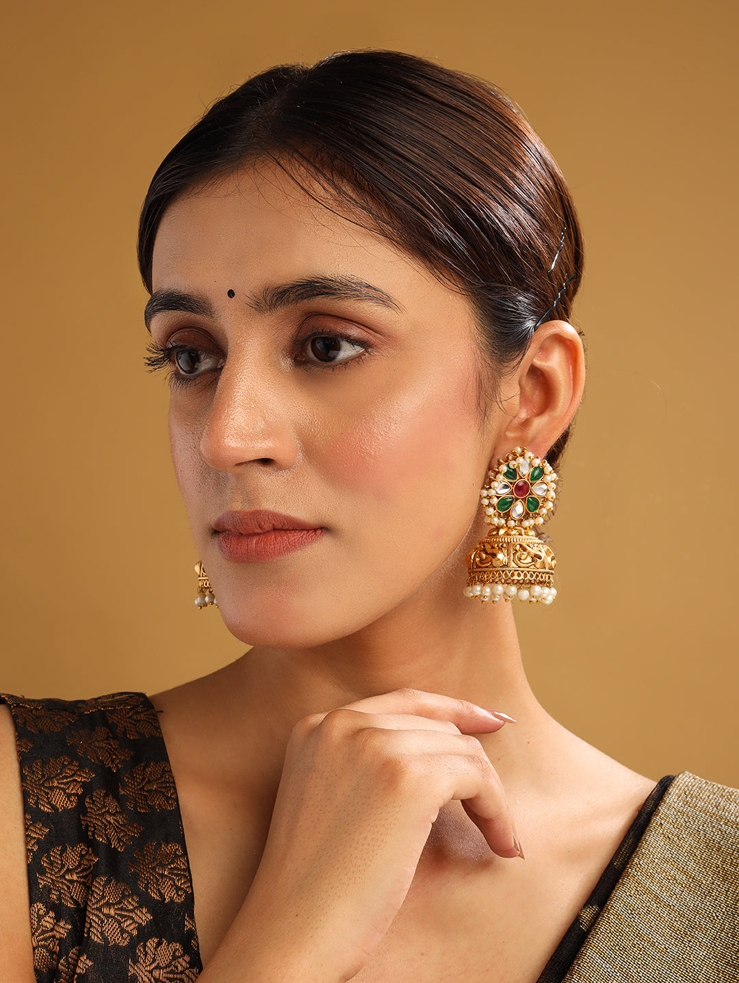 Traditional Gold Finish Kundan Jhumkas with Pearls