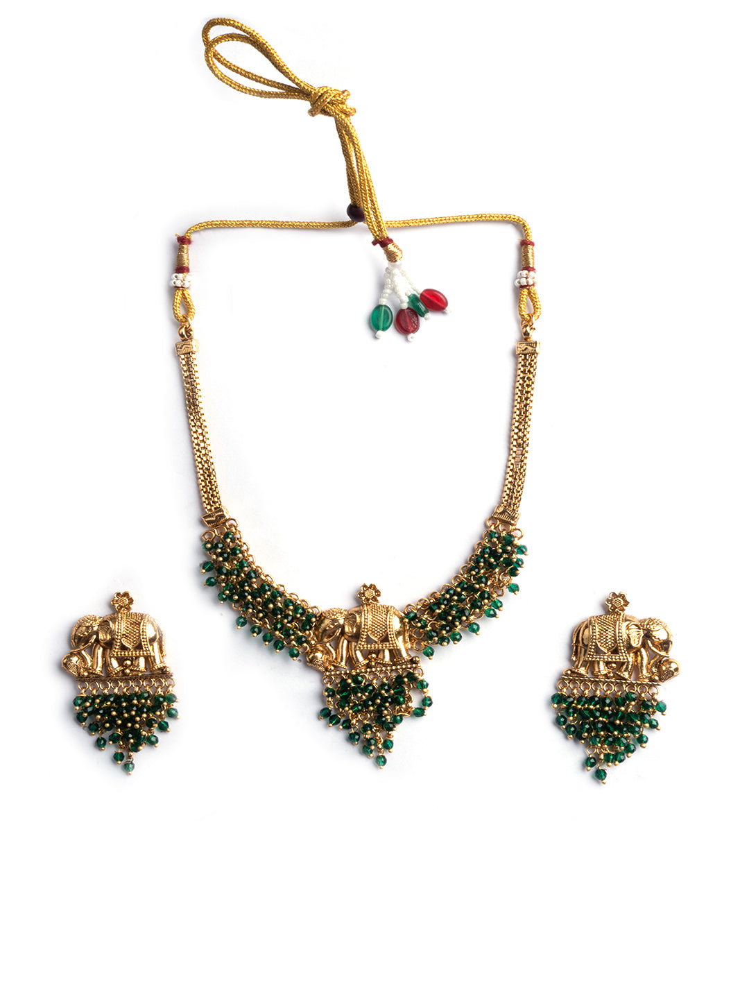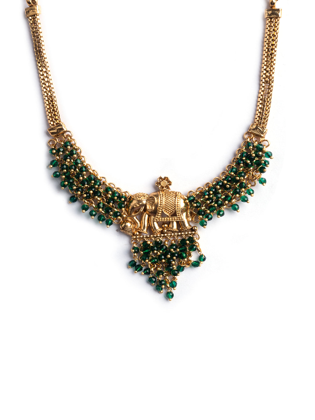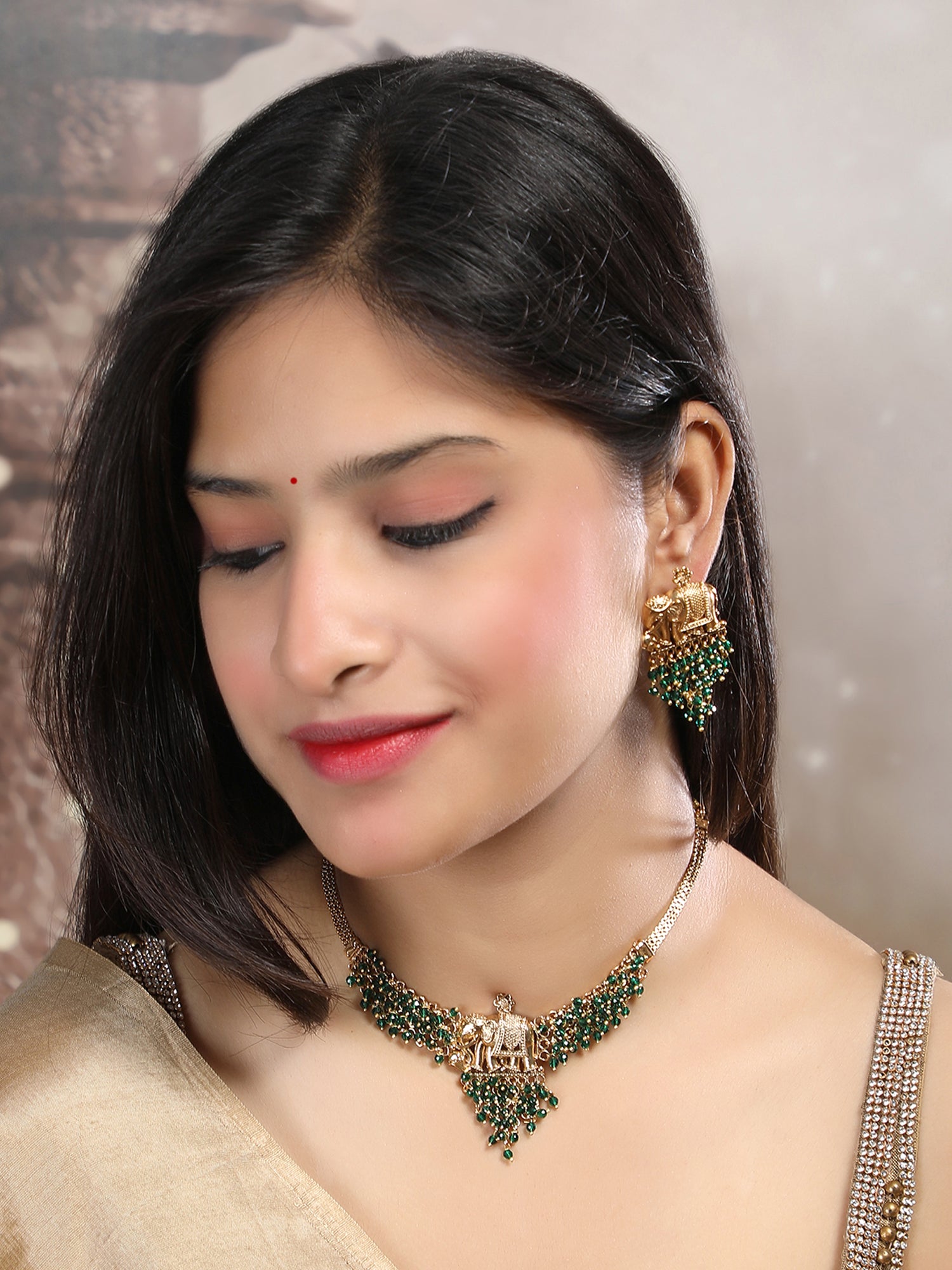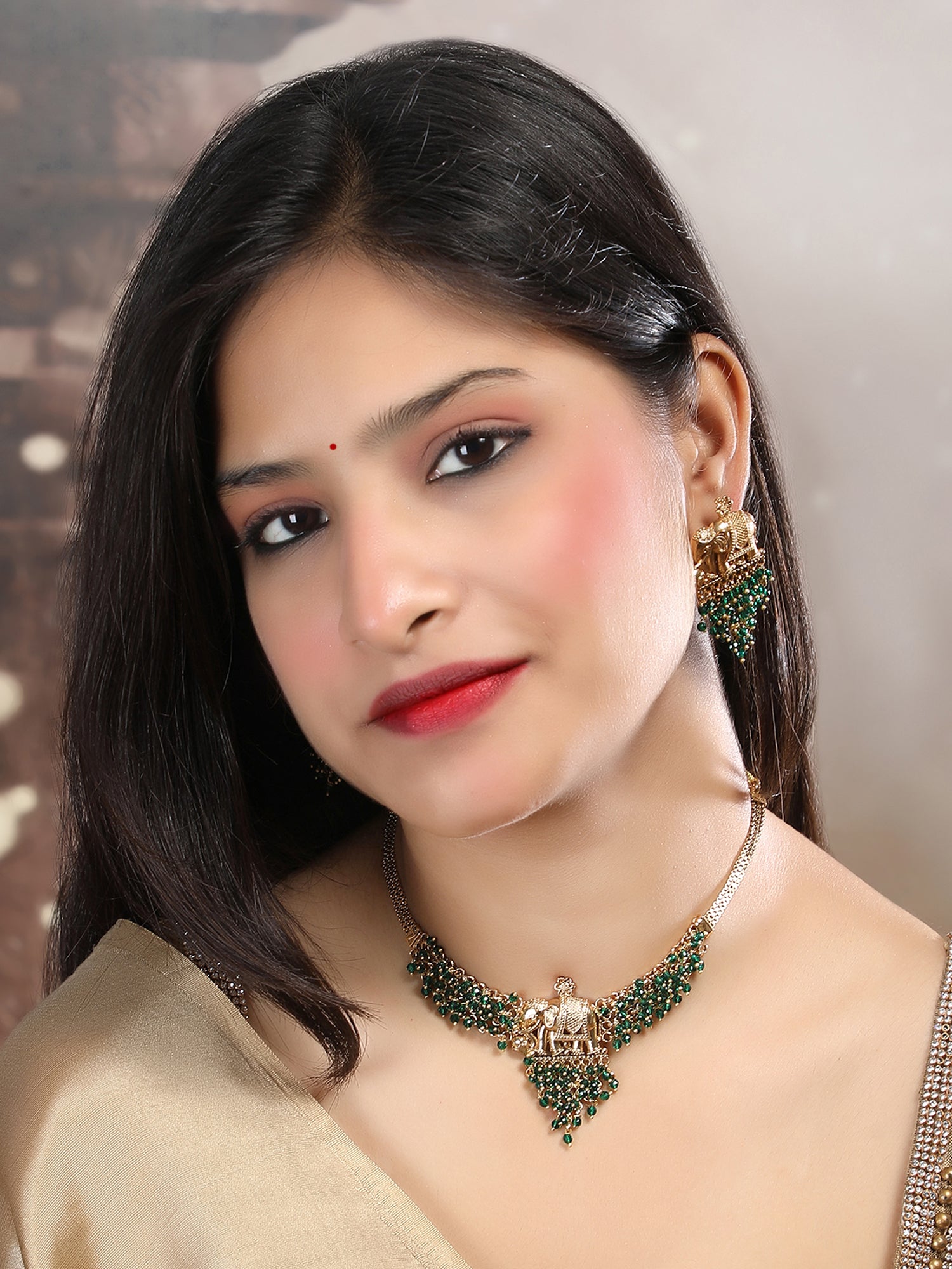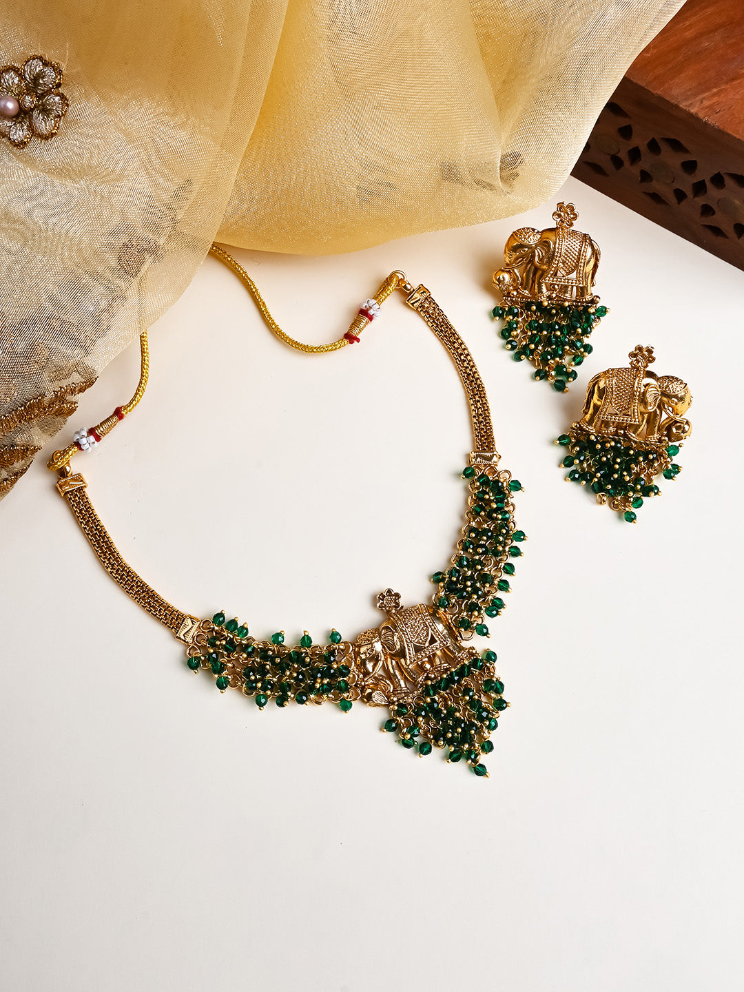 Elevate your elegance with the Unique Green Hydra Beads Gaj Necklace Set. Featuring vibrant green hydra beads intricately arranged for a striking look, this set adds a refreshing splash of color to any outfit. Perfect for special occasions, it combines traditional charm with contemporary style, ensuring you stand out with grace and confidence.