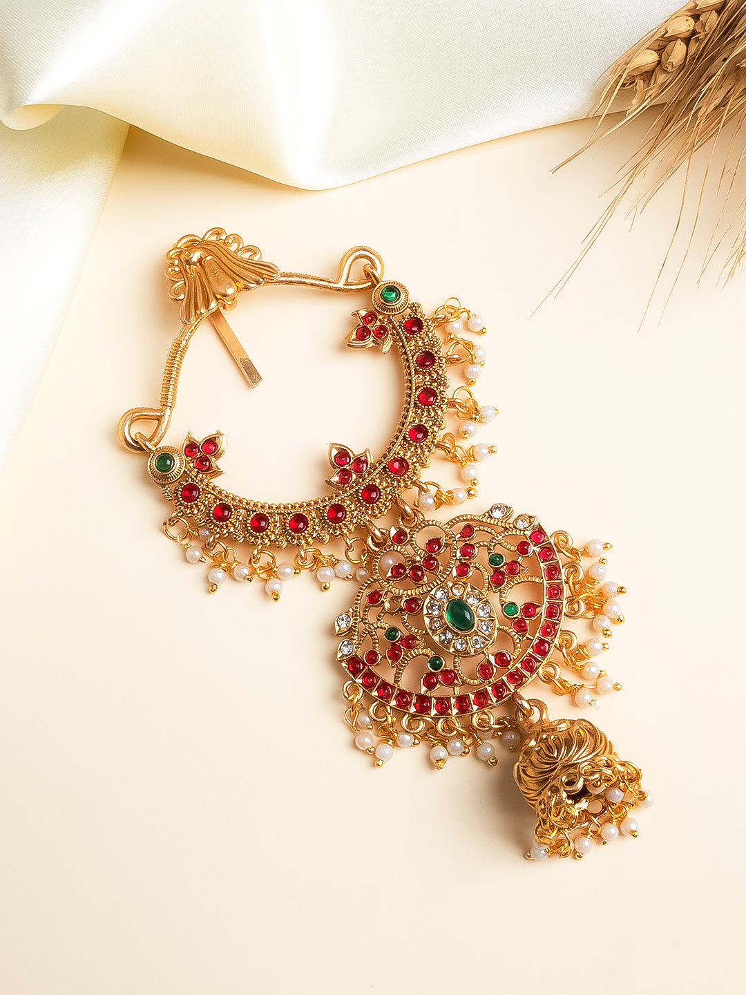 This Ethnic Multicolor Kemp Short Jada Billai adds a vibrant touch to your traditional hairstyles. Crafted with rich kemp stones in lively colors, it enhances your look with authentic ethnic charm. Perfect for weddings, festivals, and special occasions, this lightweight accessory offers intricate detailing that complements any saree or ethnic attire.