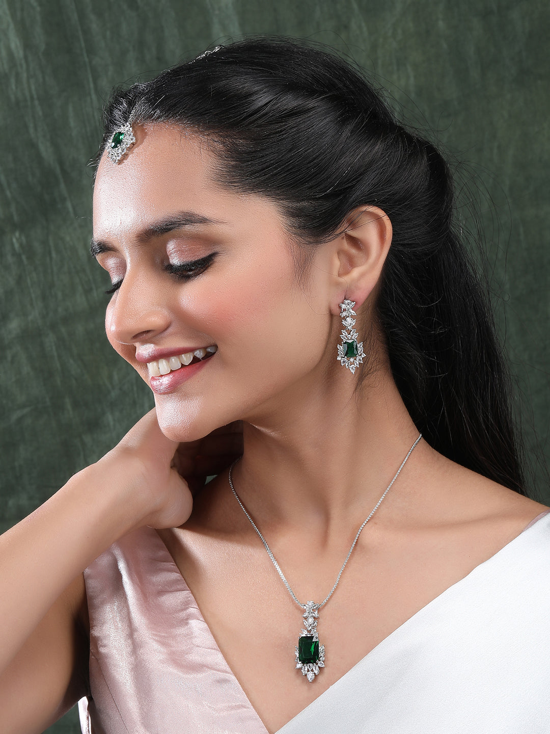 Indulge in elegance with StileAdda's Silver Plated Square AD CZ Studded Leaf Pendant Set, complete with earrings and a maangtika. Crafted with precision and adorned with shimmering cubic zirconia, this set radiates sophistication and grace. Whether it's a special occasion or a casual outing, elevate your look effortlessly with this exquisite jewelry ensemble.