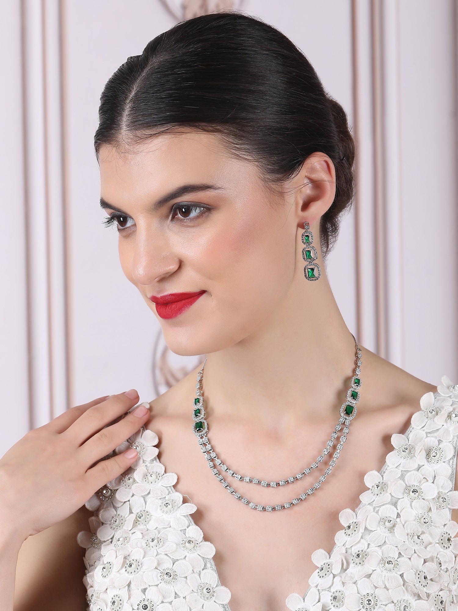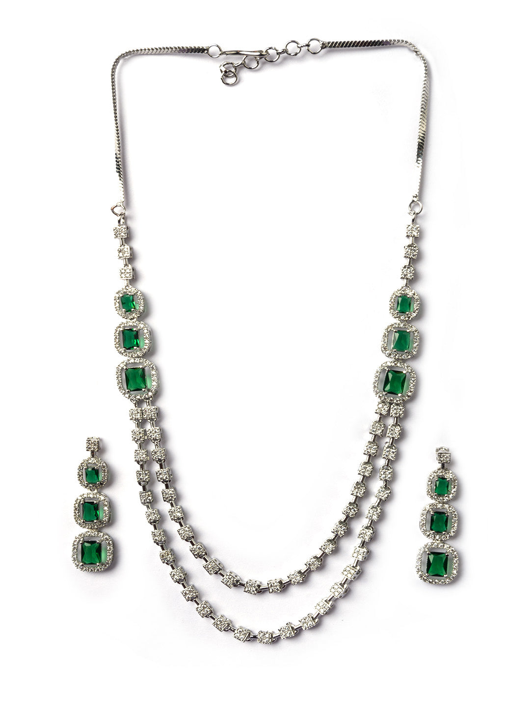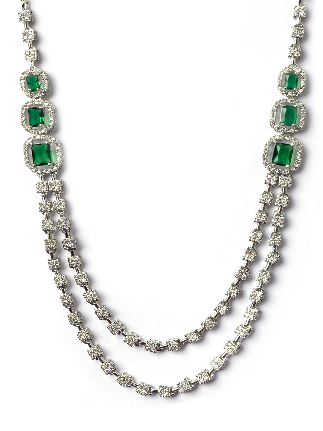 This silver-plated necklace set by StileAdda features a stunning green double line design, adding a touch of elegance to any outfit. Made with high-quality materials, it offers a long-lasting and luxurious addition to your collection. Upgrade your style with this sophisticated accessory.