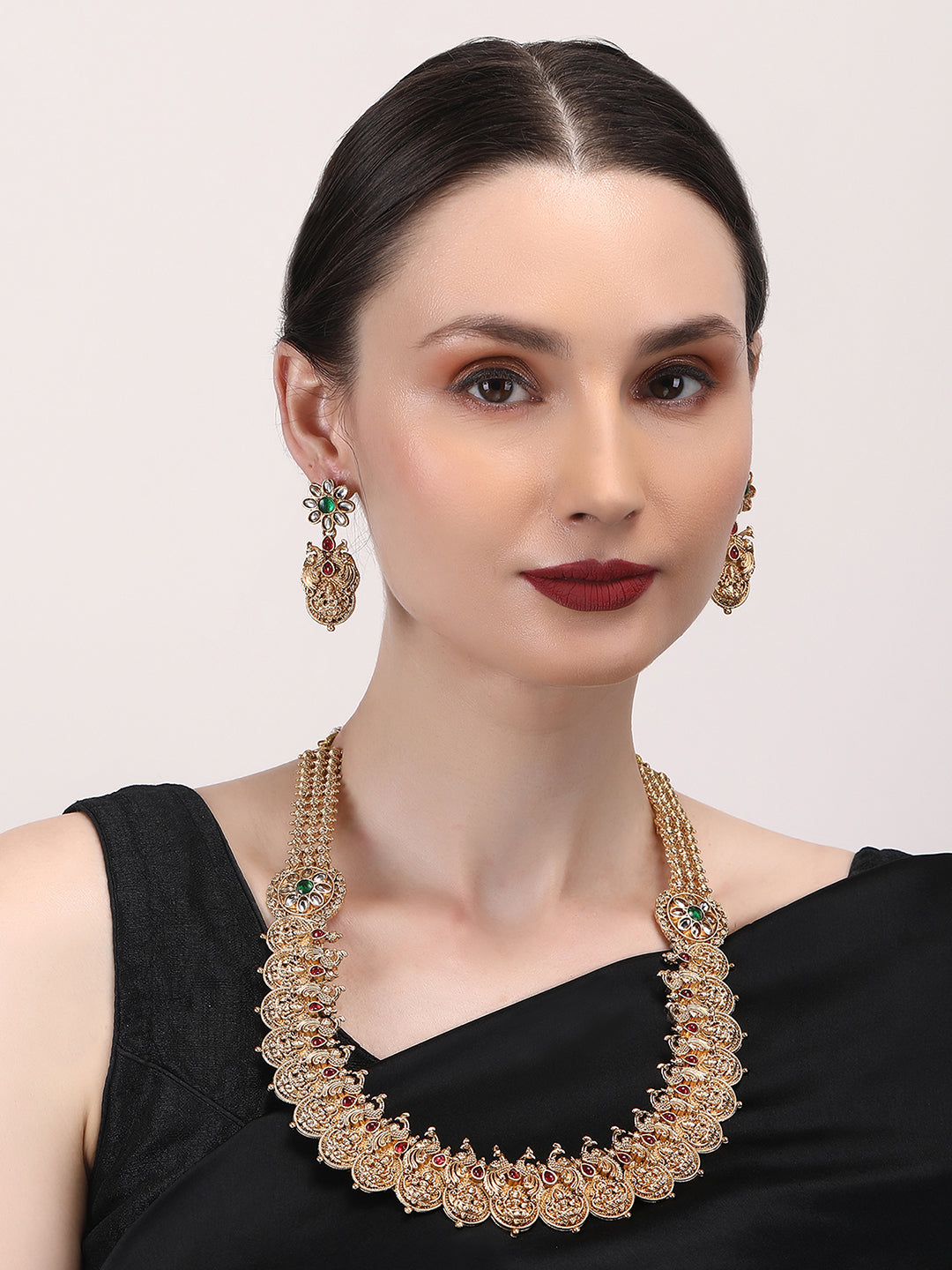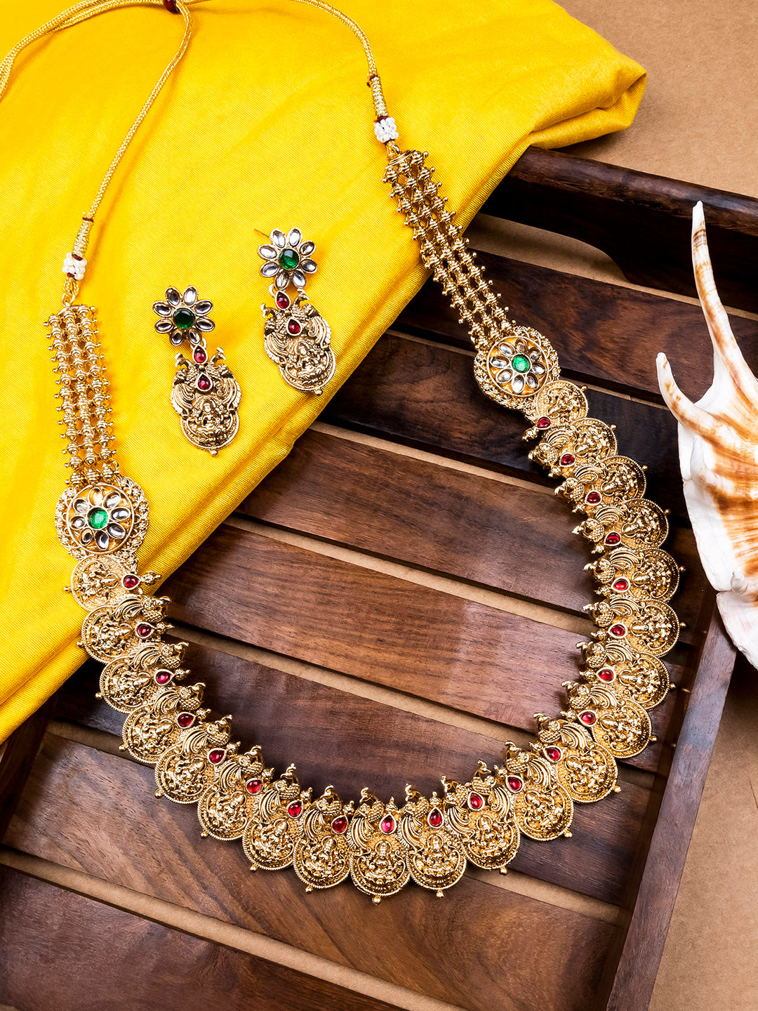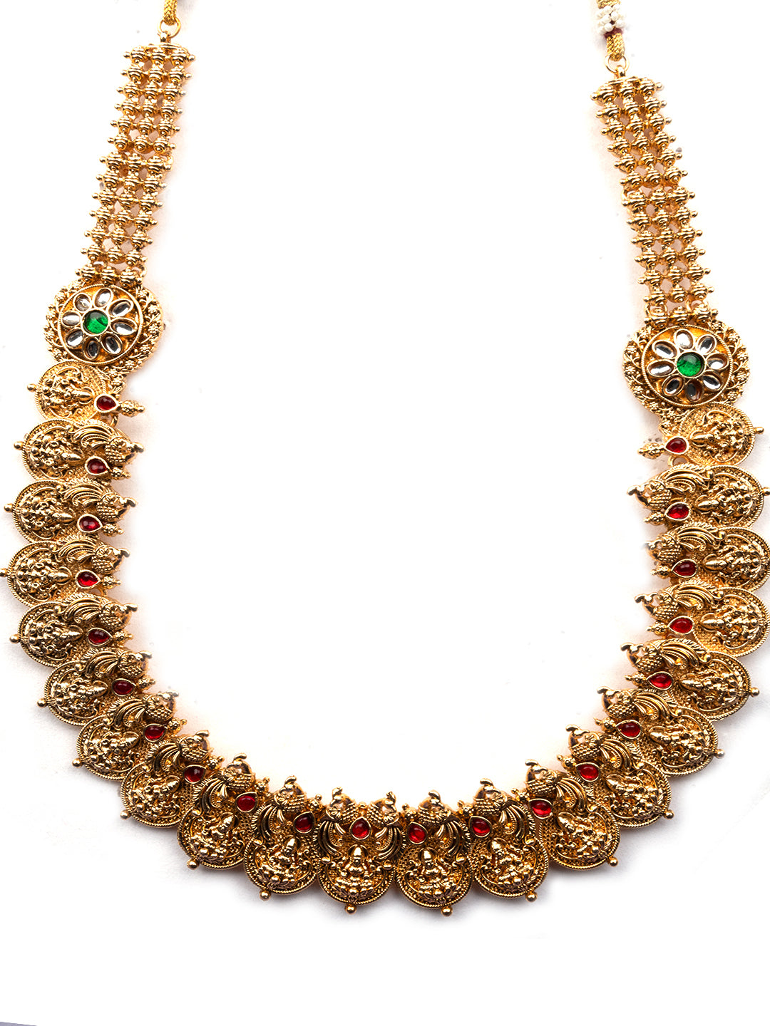 Designer Red-Green Kemp Studded Coin Long Necklace Set