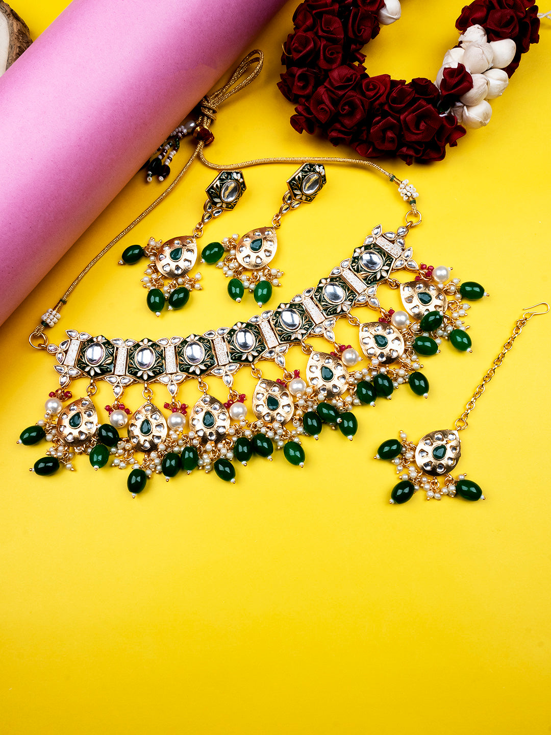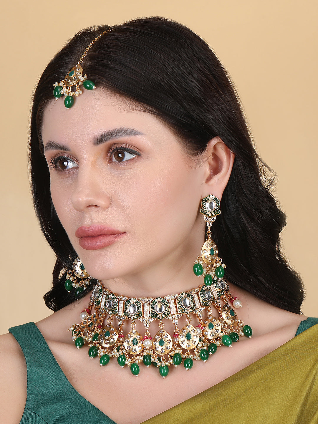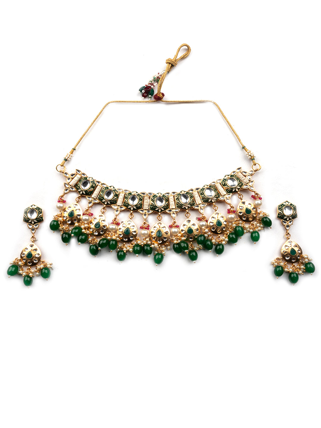 Enamel Coated Green Pearls Beaded Kundan Choker Set