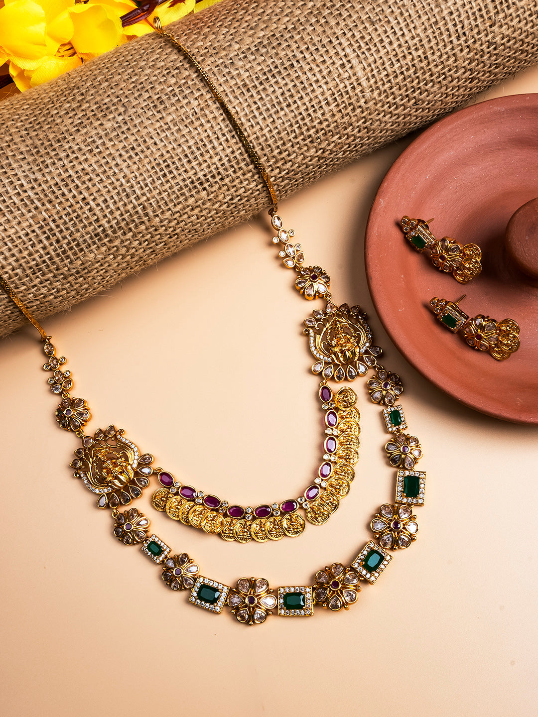 Introducing StileAdda's Gold-Plated Polki Temple Statement Necklace Set. This set is a blend of traditional elegance and modern flair, featuring intricate temple-inspired designs with dazzling polki stones. Perfect for making a bold statement at weddings, parties, or cultural events, this necklace set is sure to elevate your style with its timeless beauty and sophistication.