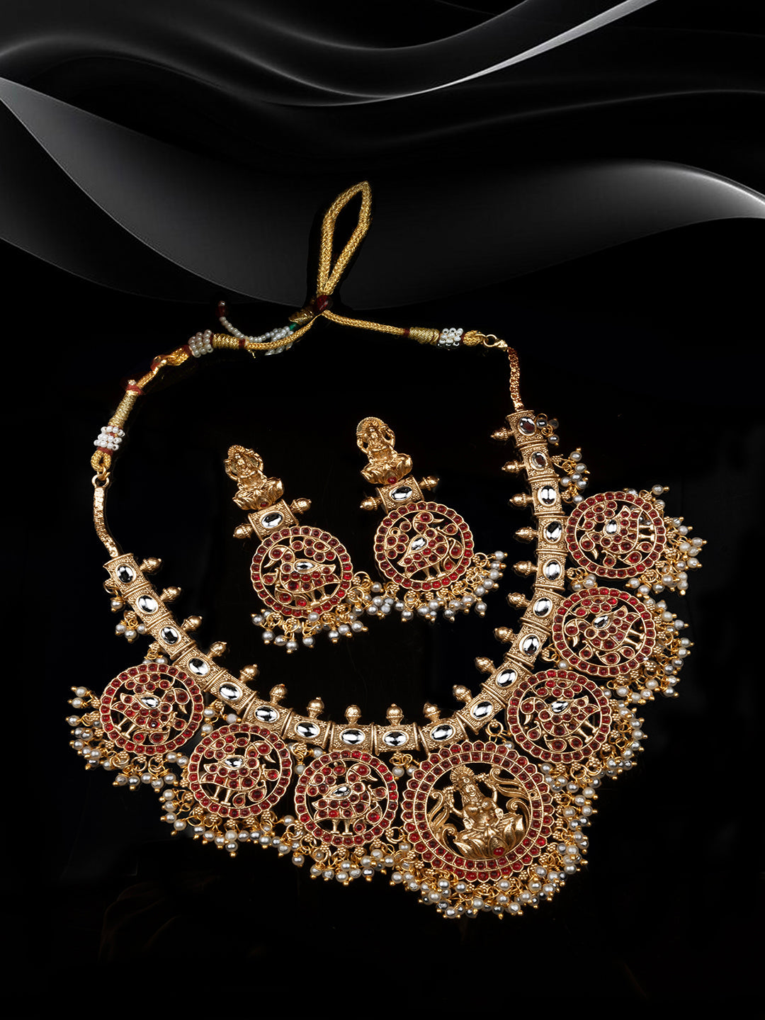This exquisite necklace by StileAdda features intricately crafted Pusa beads in temple jewelry design, elegantly complemented by gold plating. The rich hue of beads adds a touch of traditional charm, while the gold plating enhances its luxurious appeal. Perfect for special occasions or adding a regal touch to your everyday attire, this set is sure to make a statement wherever you go.