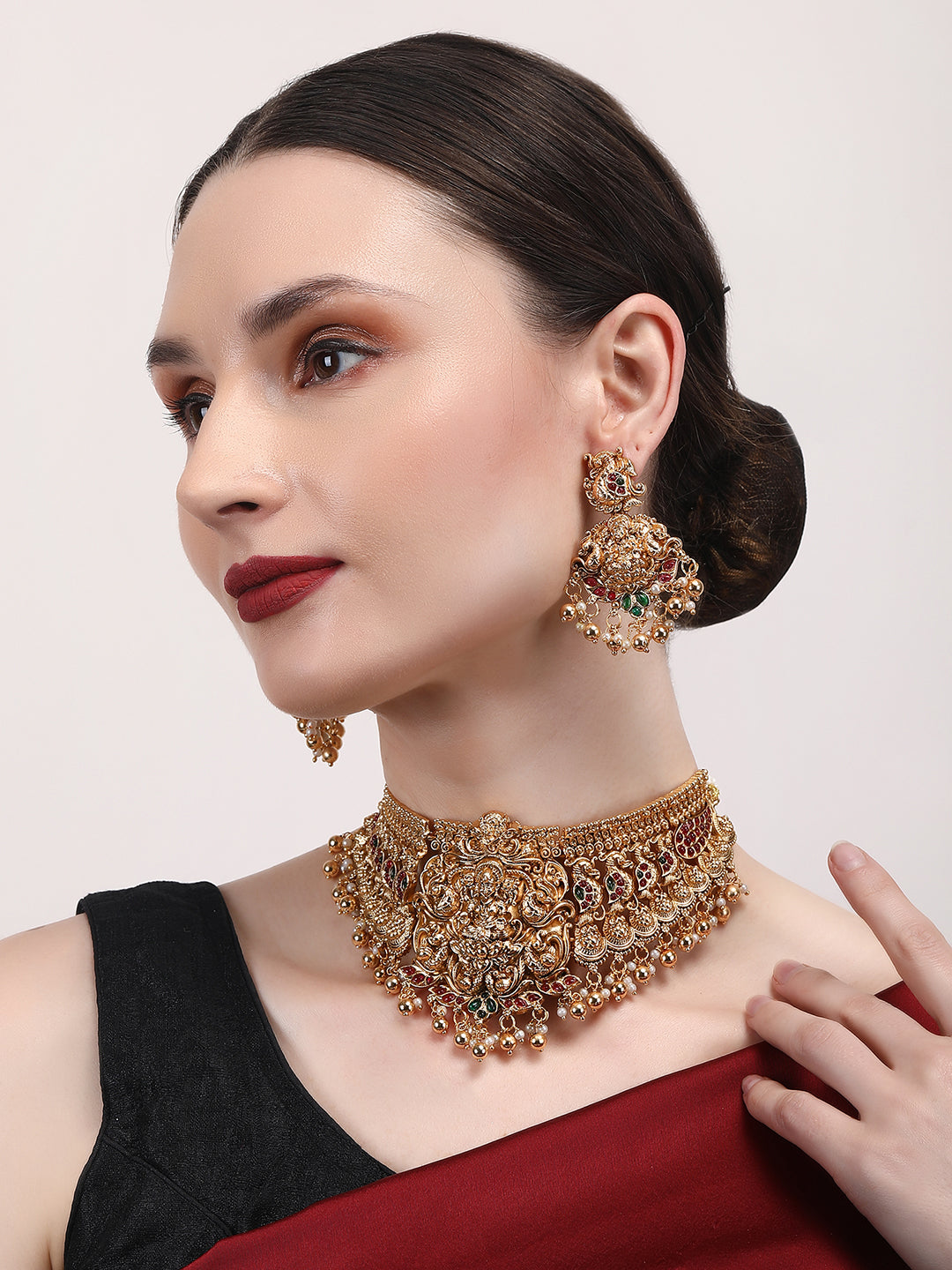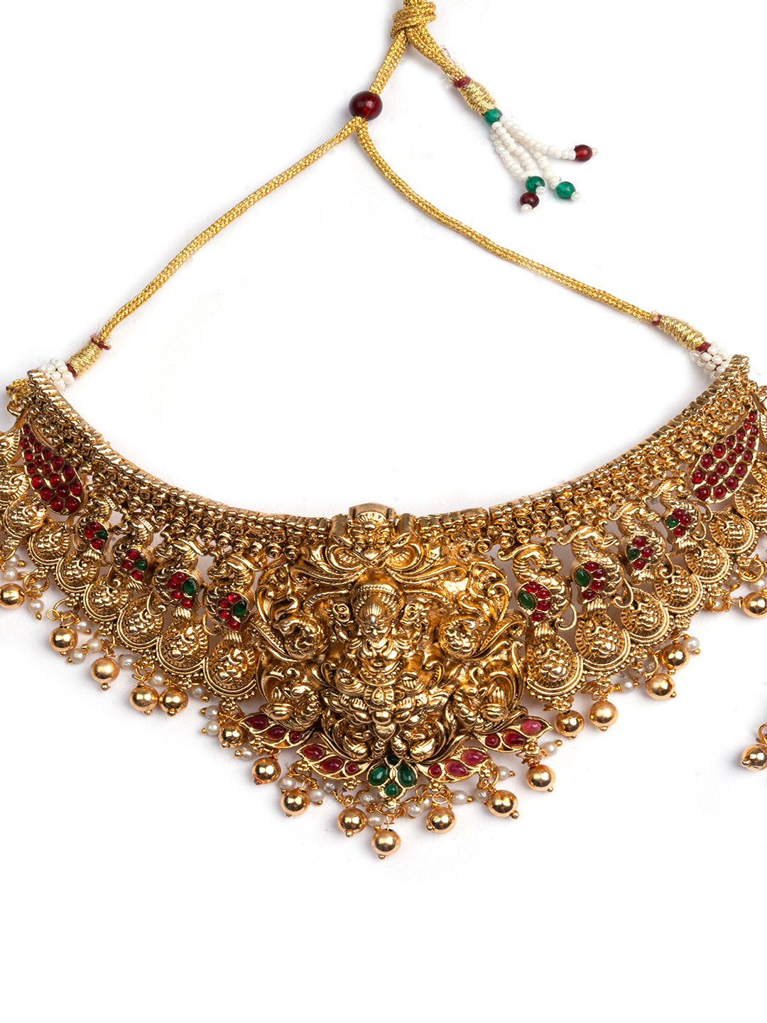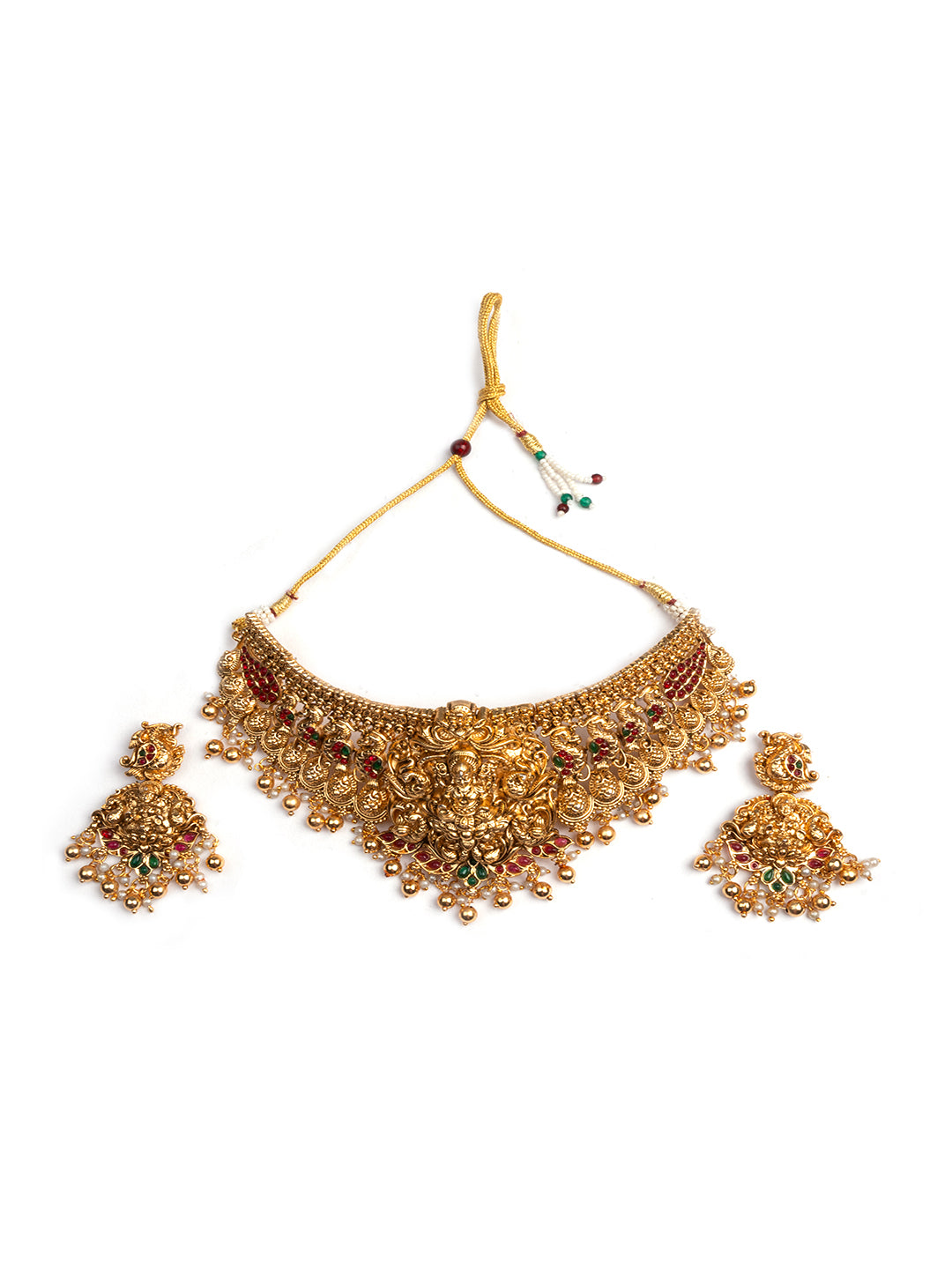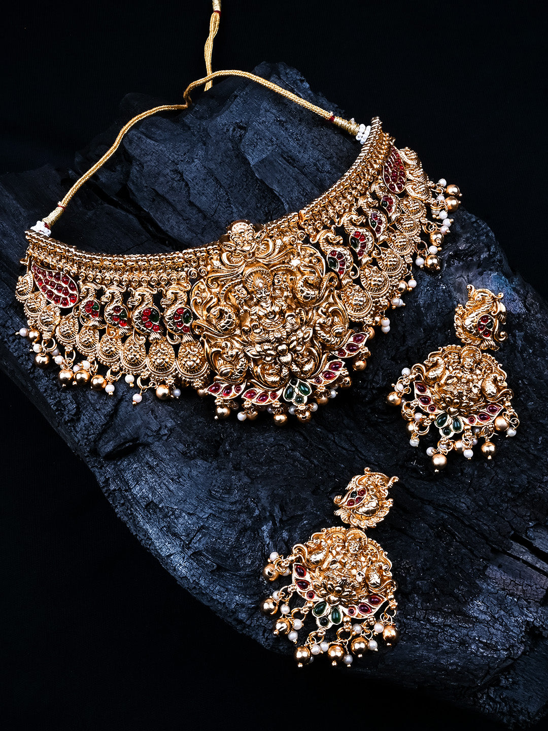 Elevate your ethnic charm with StileAdda's Matte Finish Lakshmi Choker. This stunning piece features a beautifully crafted Lakshmi pendant on a matte finish choker adorned with high quality beads. Perfect for traditional events or adding a touch of grace to your everyday attire, it's a timeless statement of elegance.