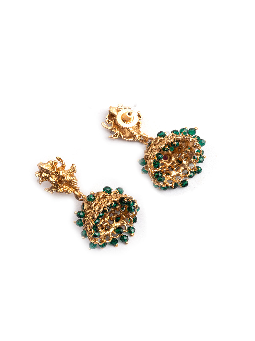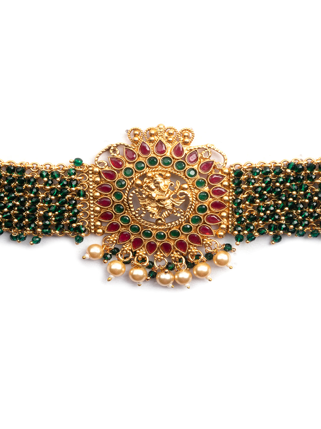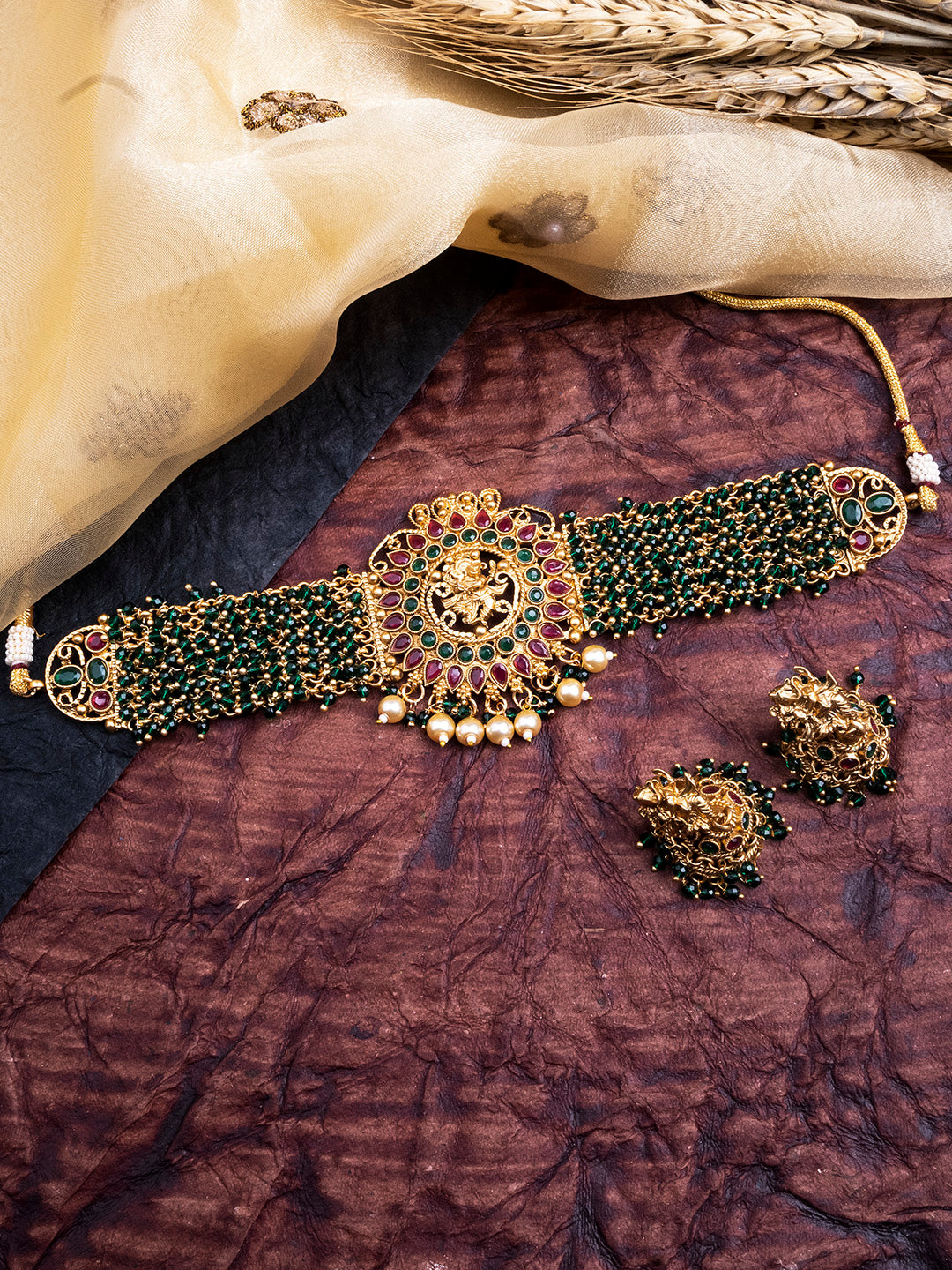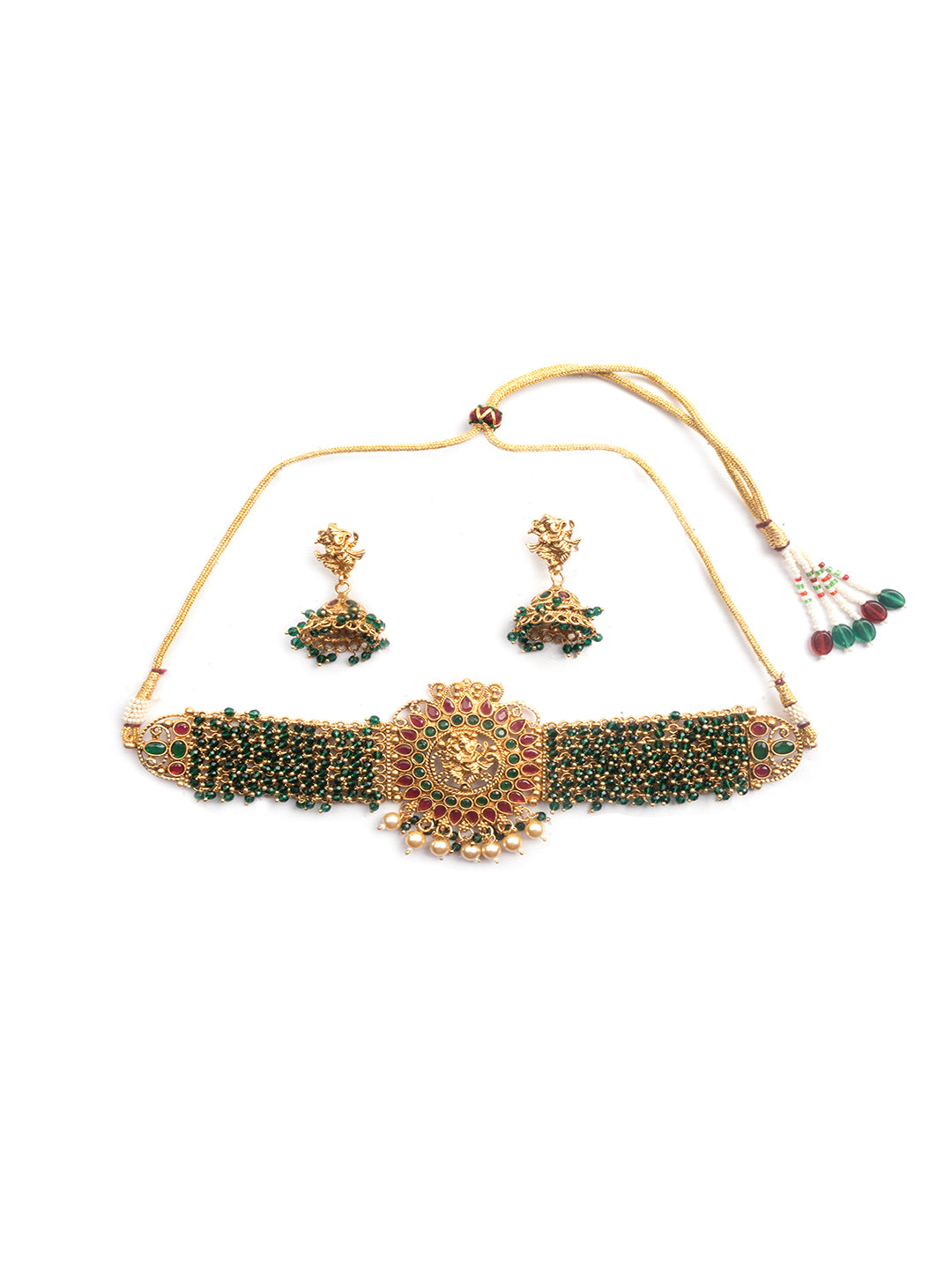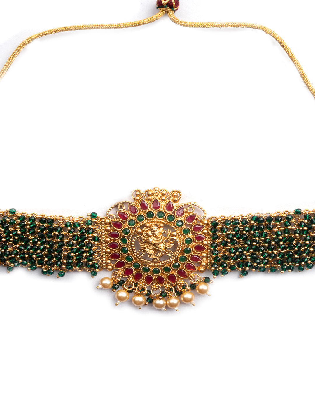Precious Gold Plated Ganapati Green Hydra Beads Necklace Set