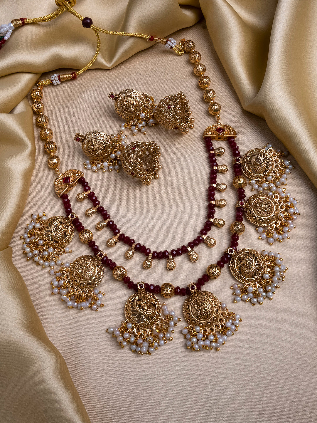 Elevate your elegance with our Red Onyx Beads Double Line Filigree Necklace Set. The rich crimson onyx beads contrast beautifully with intricate filigree detailing, creating a statement piece that demands attention. This dual-strand masterpiece adds royal sophistication to both traditional attire and contemporary ensembles.ย