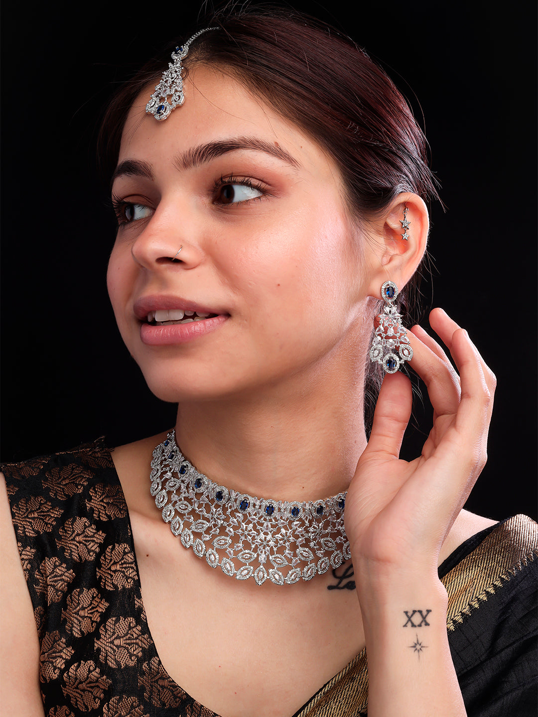 This exquisite wedding jewelry set, by StileAdda, features a stunning silver plated necklace, earrings and maangtika adorned with sparkling cubic zirconia. Add a touch of elegance and sophistication to your special day with this beautiful accessory set. Perfect for weddings and special occasions.