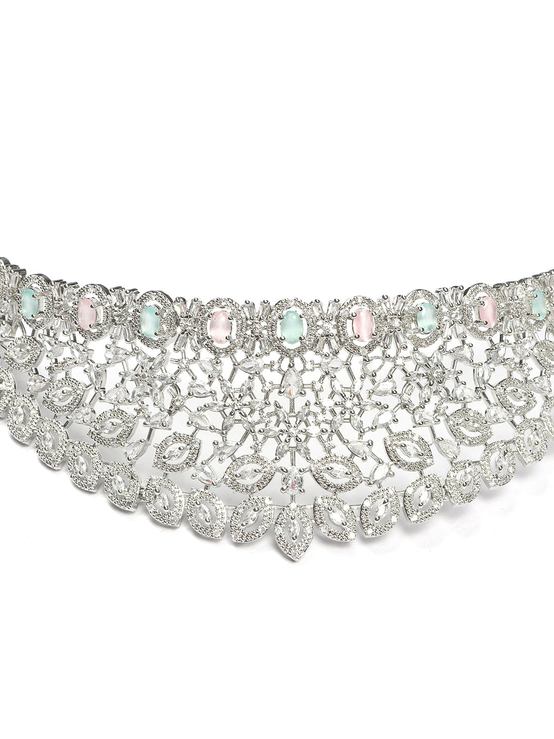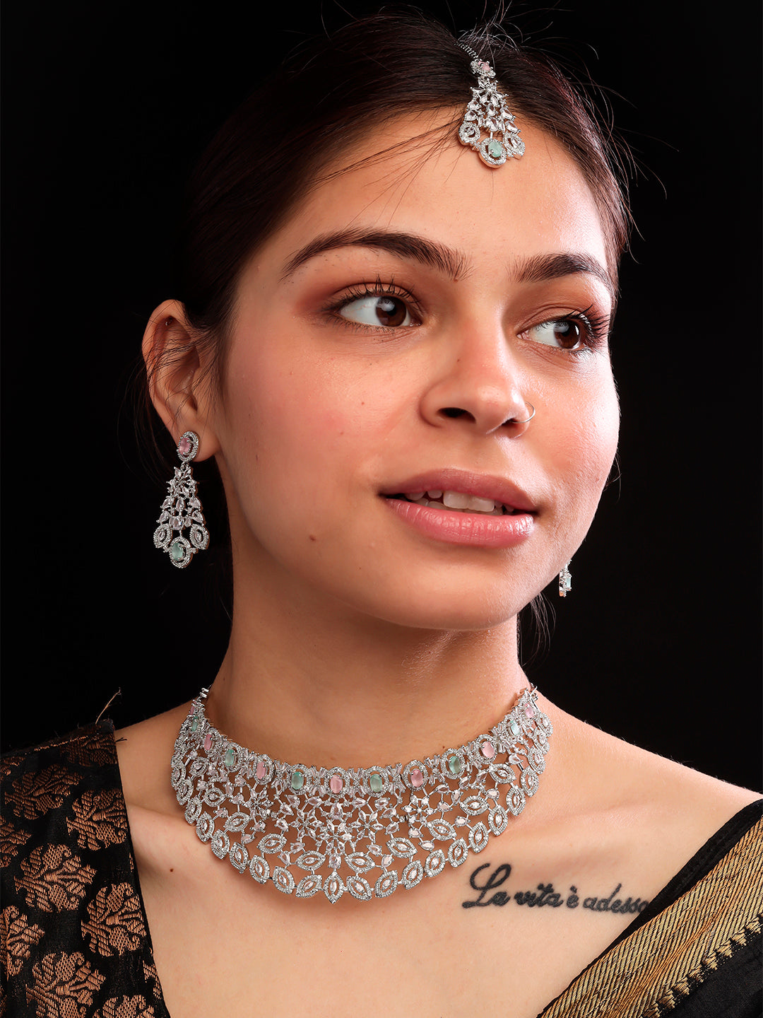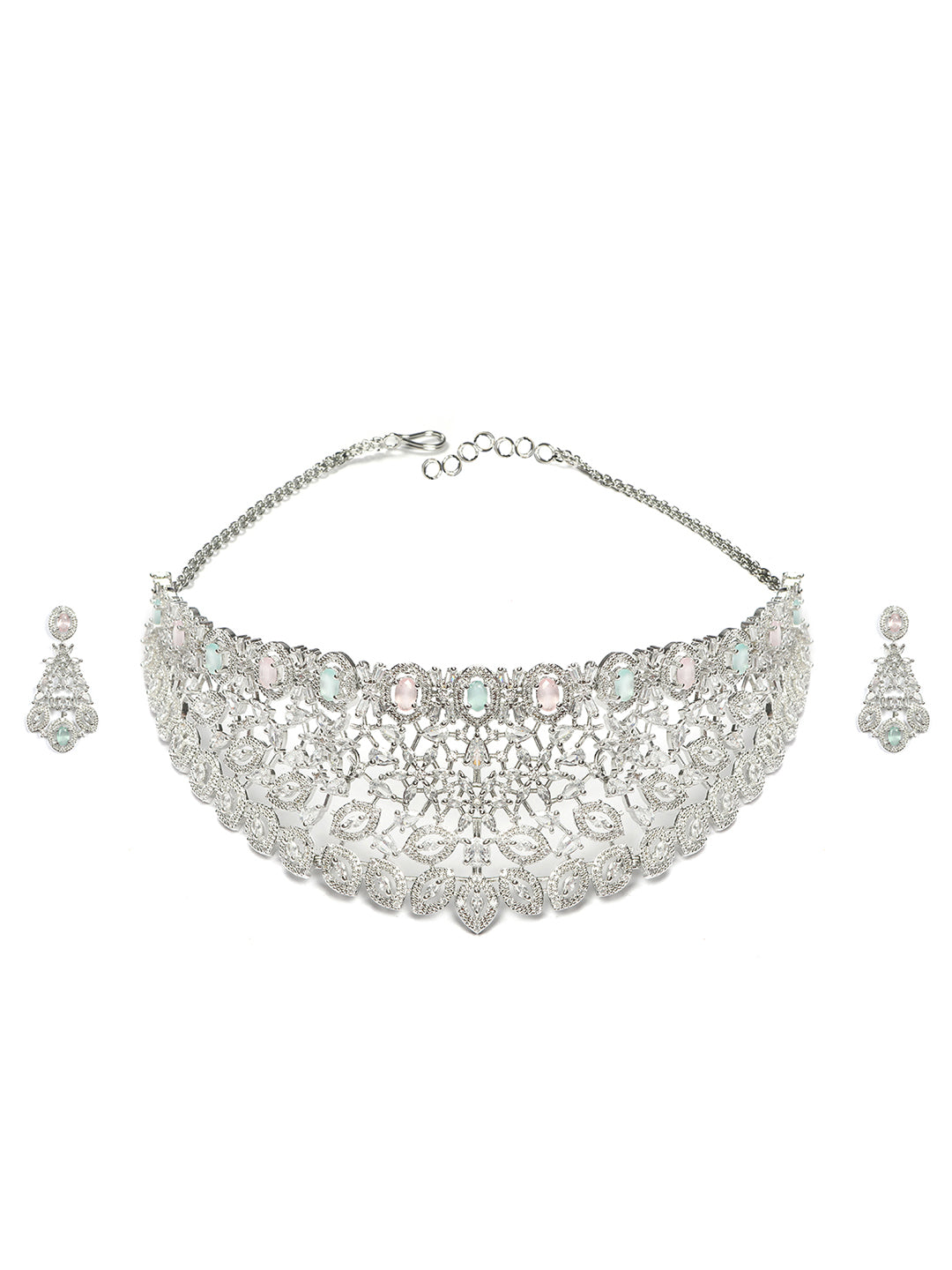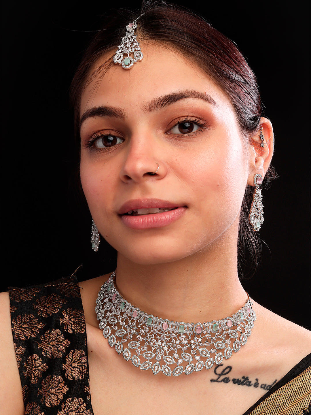 Silver Plated Multicolor Cubic Zirconia Bridal Necklace Set | Exquisite Wedding Jewellery Set