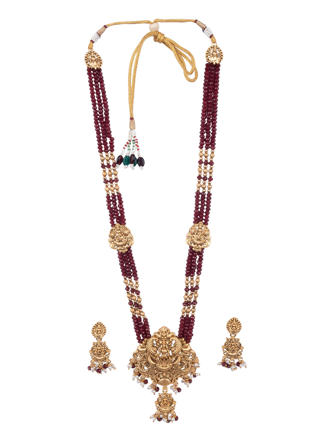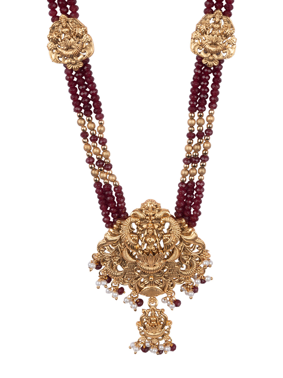 This exquisite South Indian Bandhai long necklace set features rich maroon beads that beautifully complement traditional attire. Handcrafted with precision, it blends cultural heritage with timeless elegance, making it suitable for festive occasions or sophisticated gatherings. The intricate design and vibrant hues enhance your ensemble with subtle grandeur.