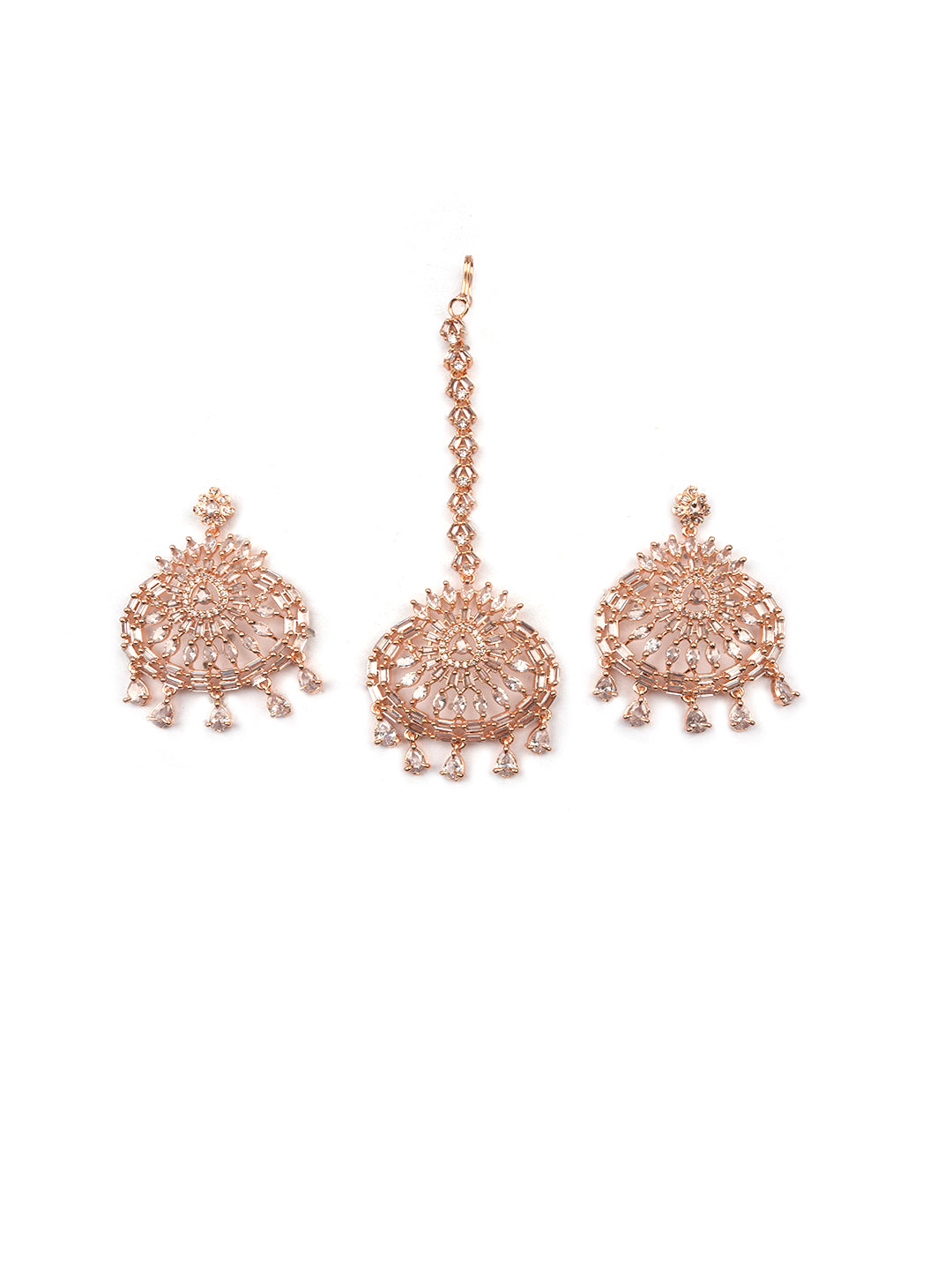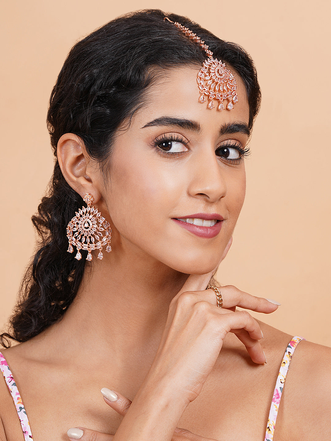 Enhance your elegance with StileAdda's CZ Studded Drop Style Earrings and Maangtika Set. Crafted with precision and adorned with sparkling rose gold CZ stones, this set offers a perfect blend of sophistication and charm. Elevate any outfit with this exquisite accessory set. Shop now to add a touch of sparkle to your ensemble.