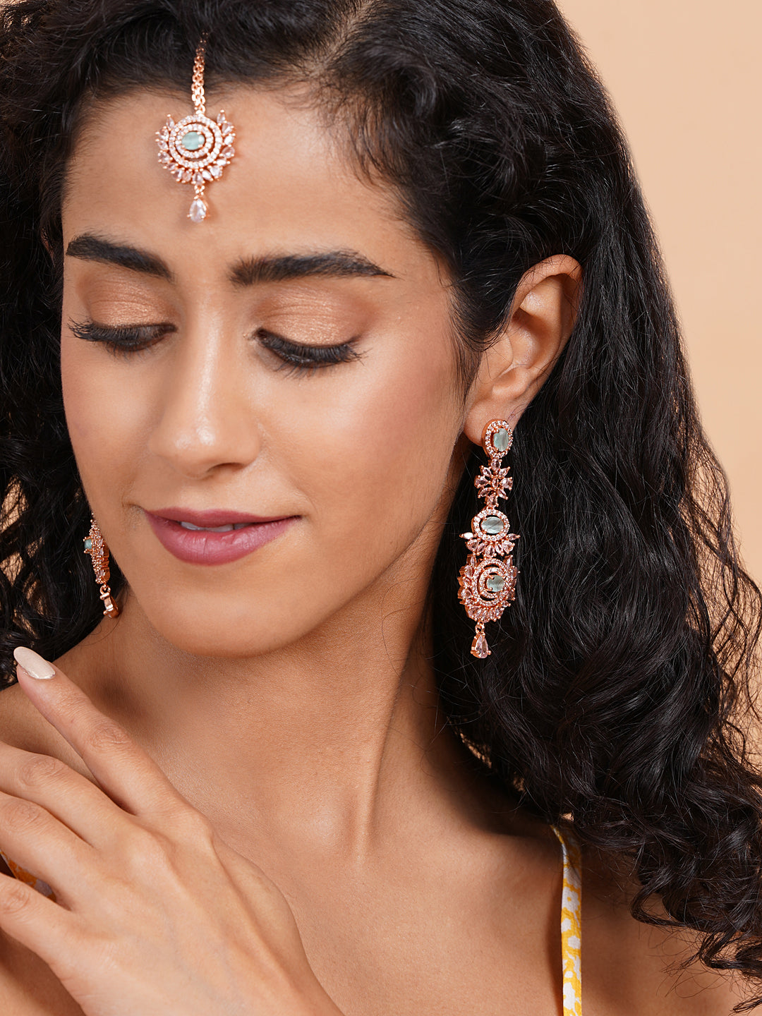 Elevate your look with StileAdda's stunning rose gold plated CZ Studded Long Drop Earrings and Mangtika set. Crafted with precision and adorned with sparkling CZ stones, these elegant accessories add a touch of glamour to any outfit. Shop now for timeless sophistication and irresistible style.