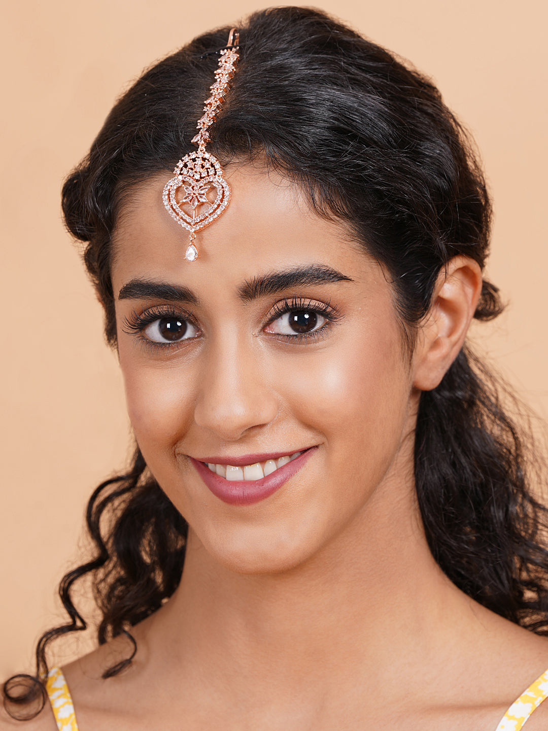 Elevate your ethnic look with StileAdda's exquisite CZ Mangtika in Rose Gold Tone. Handcrafted to perfection, our English CZ Mangtika adds a touch of elegance to any attire. Shop now for the perfect accessory!