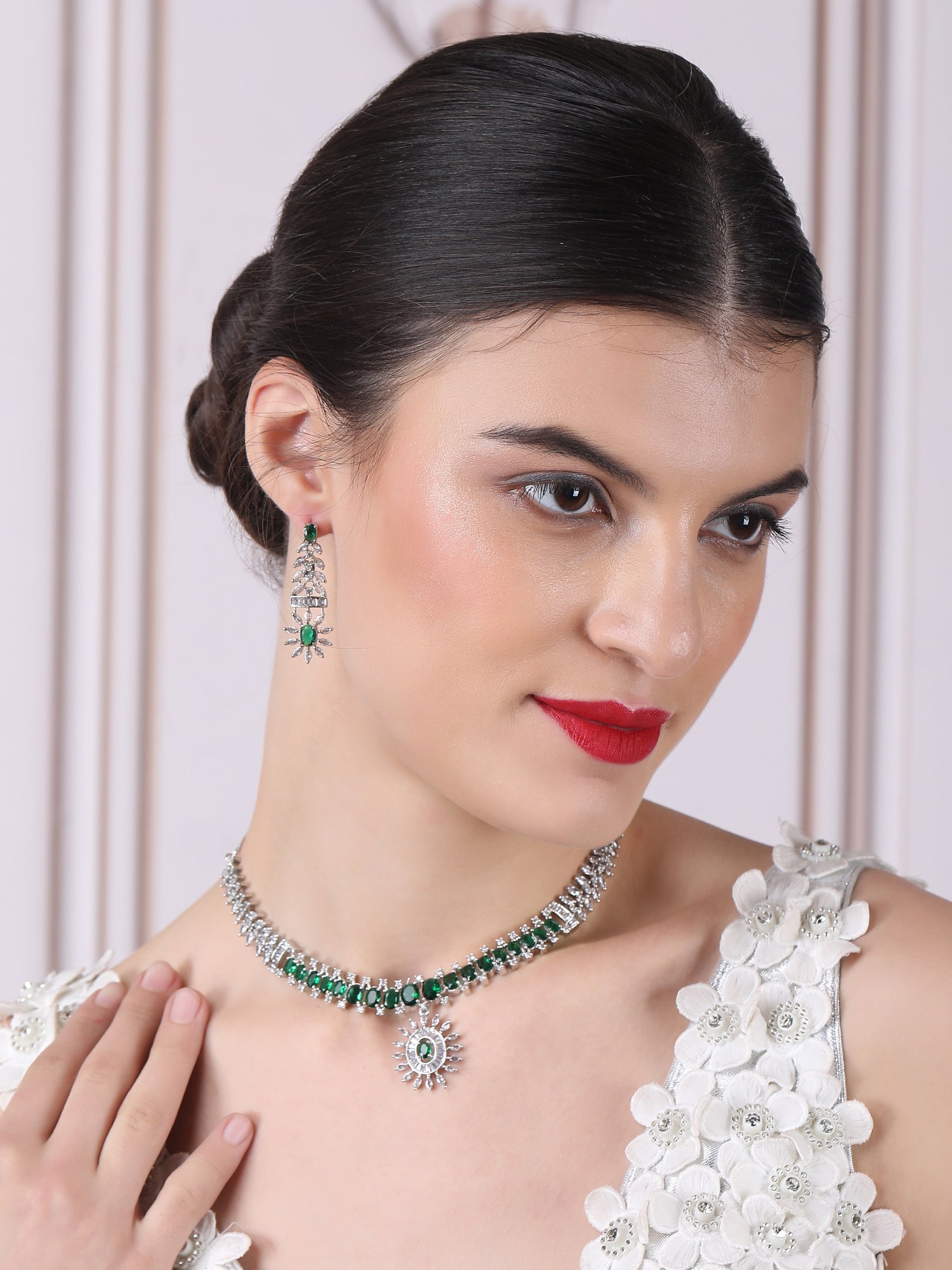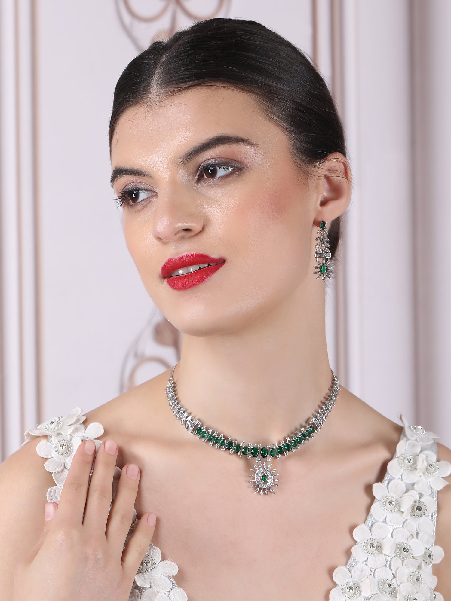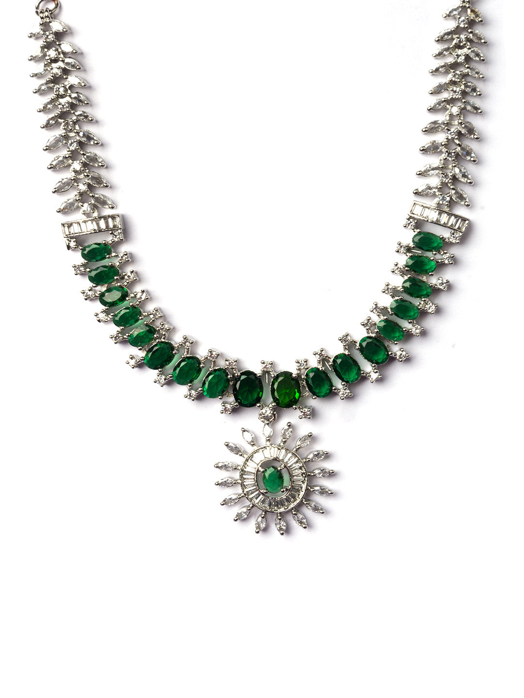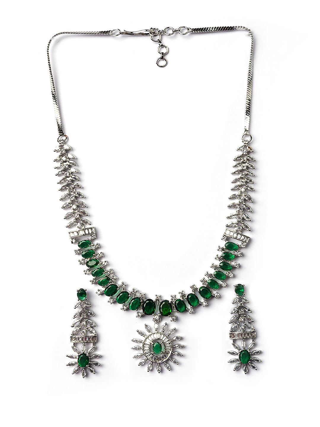 This necklace set features elegant, designer cubic zirconia stones in a dual shade design. Handcrafted with precise detail, this necklace is a timeless addition to any jewelry collection. Experience the luxury of high-quality materials and expert craftsmanship with this must-have accessory.