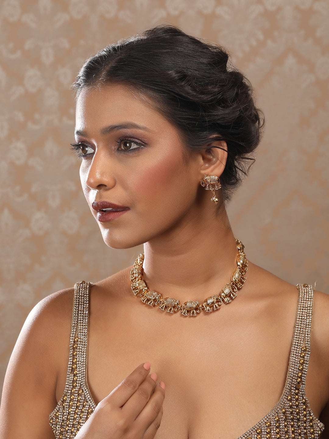 Inspired by royal heritage, this Ethnic Gold Plated Necklace Set features intricate elephant motifs that symbolize strength and grace. The antique gold finish adds a traditional charm, making it perfect for weddings, temple functions, and festive celebrations.