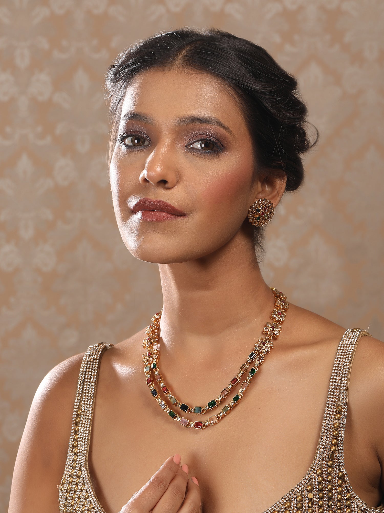 This Dual Line Necklace Set by StileAdda features a graceful floral design adorned with multi-colored Kemp stones. The vibrant hues and antique gold finish bring a rich, traditional appeal—perfect for festive wear, weddings, or cultural celebrations.