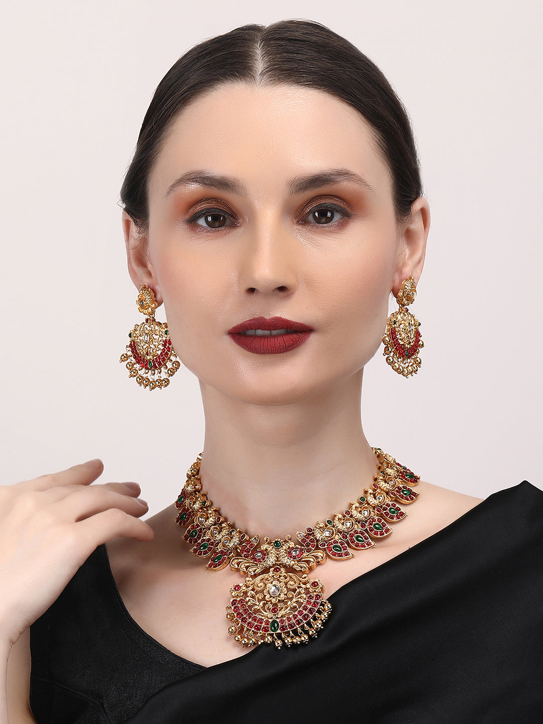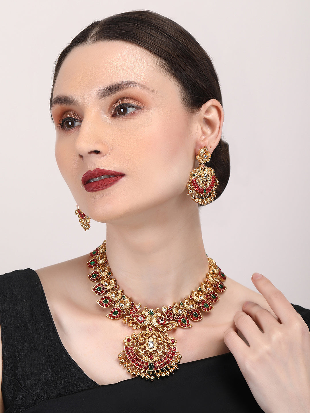 Elevate your style with StileAdda's stunning gold plated temple necklace set. Crafted with precision and adorned with intricate designs, this exquisite jewelry piece adds a touch of timeless elegance to any ensemble. Shop now for the perfect blend of tradition and sophistication.