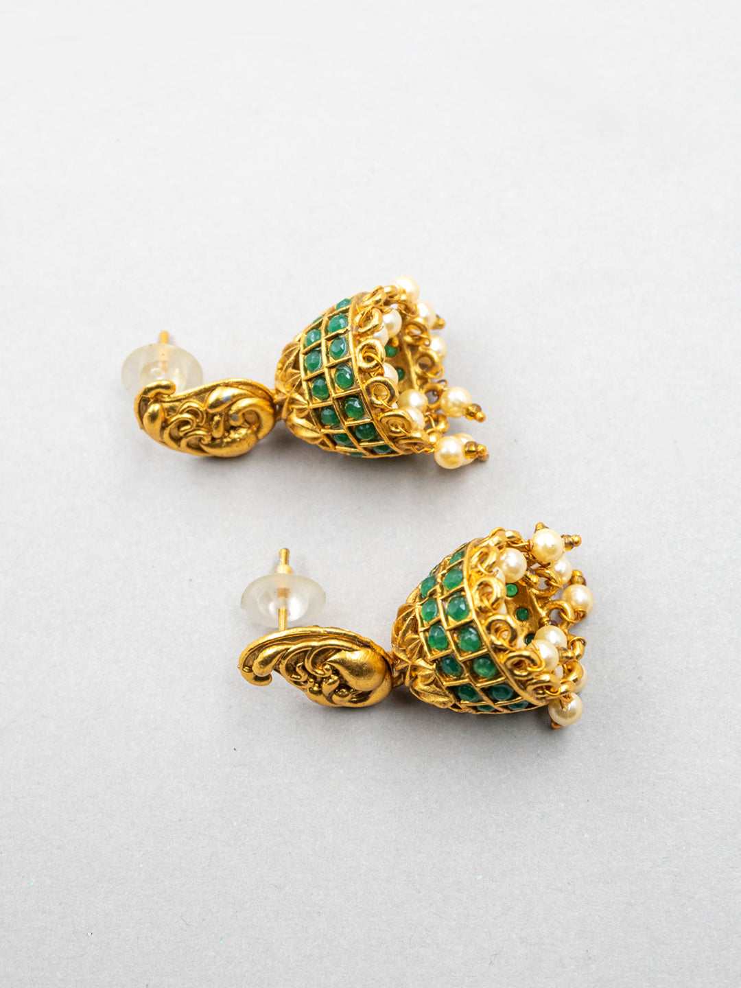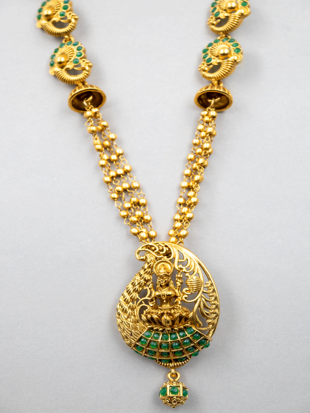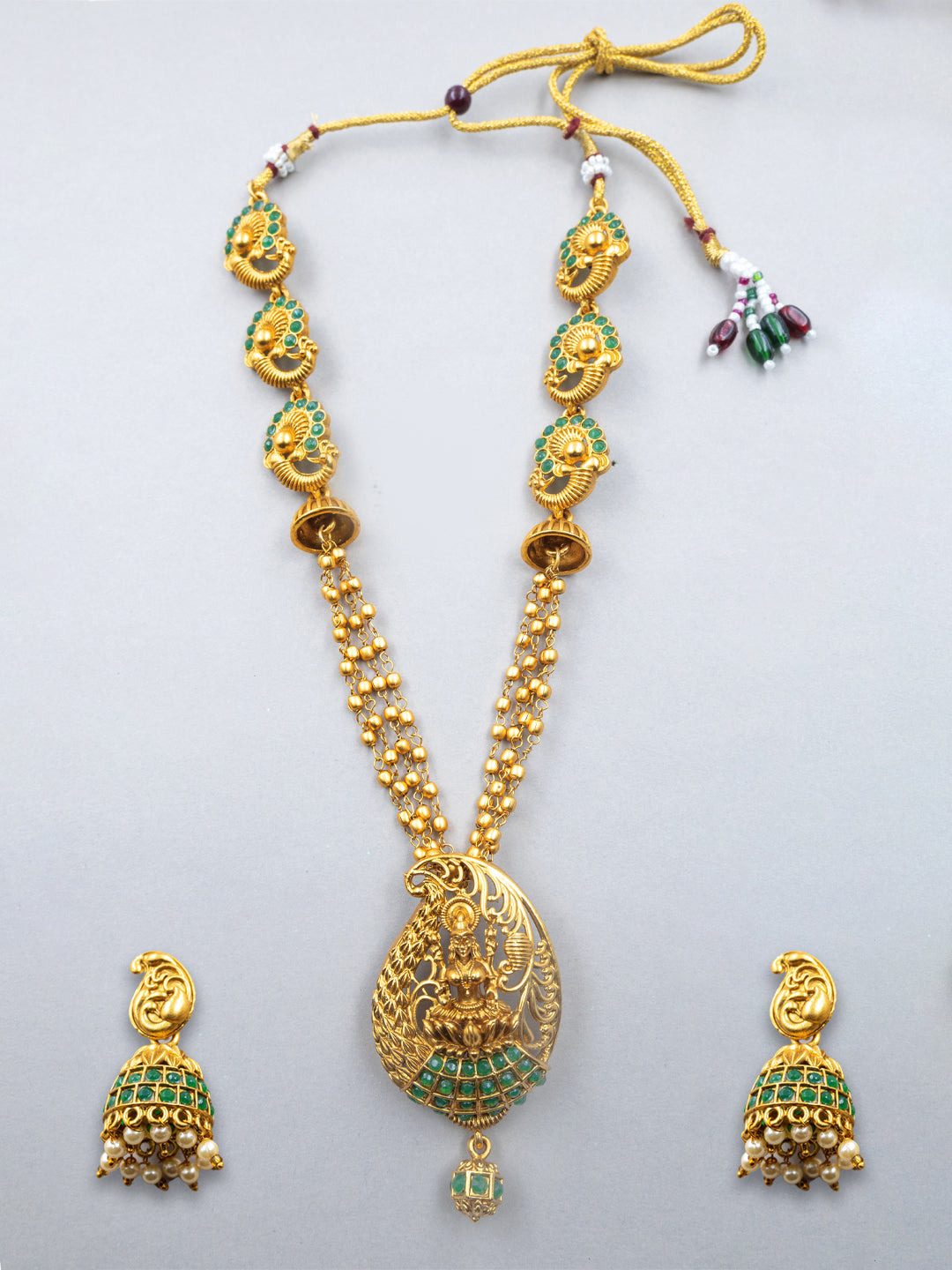 Introducing StileAdda's Luxurious Kemp Paan Pendant Set. This set exudes opulence and charm with its stunning Kemp stones and intricately designed paan-shaped pendant with Goddess Laxmi Design over it. Perfect for adding a touch of regal elegance to your attire, whether it's a festive occasion or a special event, this pendant set is sure to dazzle and delight.