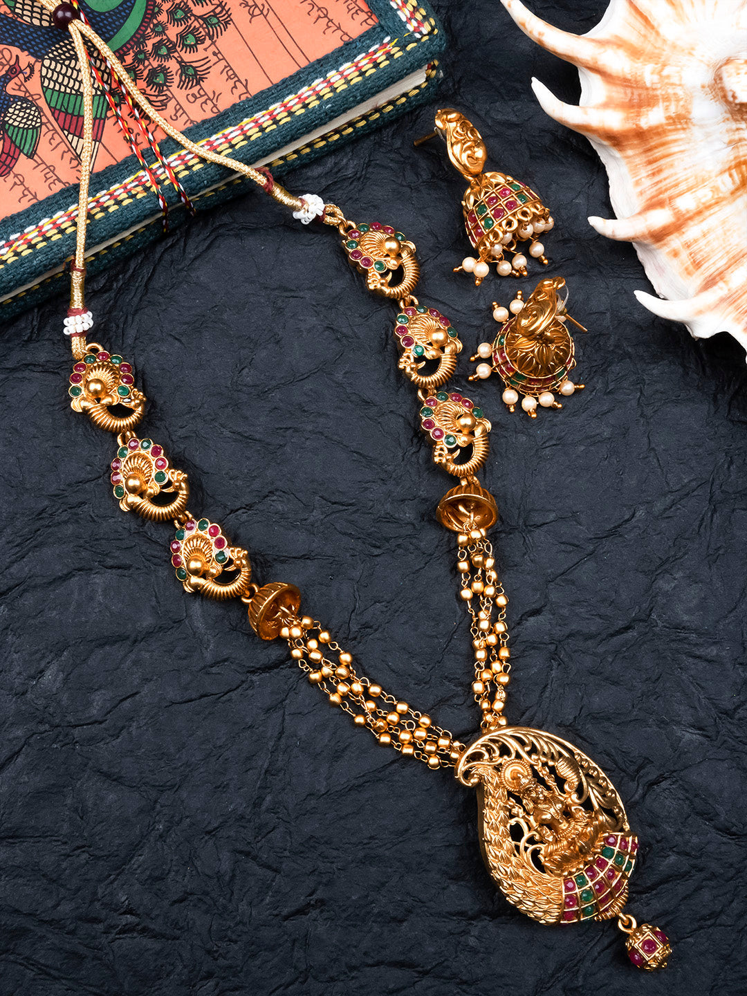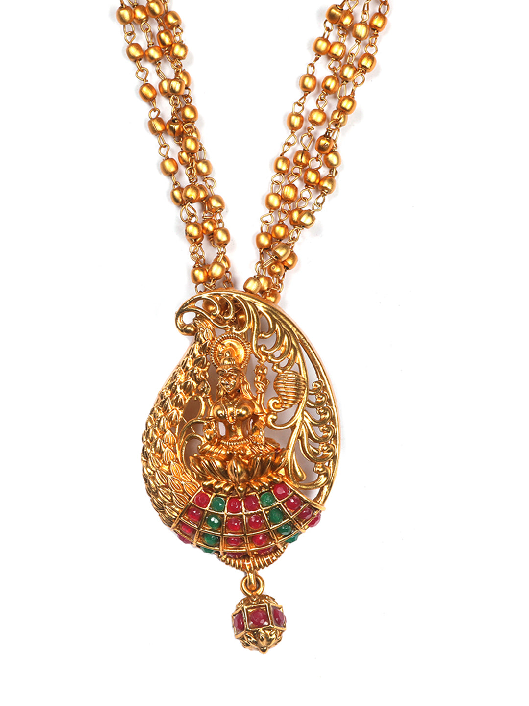 Introducing StileAdda's Luxurious Kemp Paan Pendant Set. This set exudes opulence and charm with its stunning Kemp stones and intricately designed paan-shaped pendant with Goddess Laxmi Design over it. Perfect for adding a touch of regal elegance to your attire, whether it's a festive occasion or a special event, this pendant set is sure to dazzle and delight.