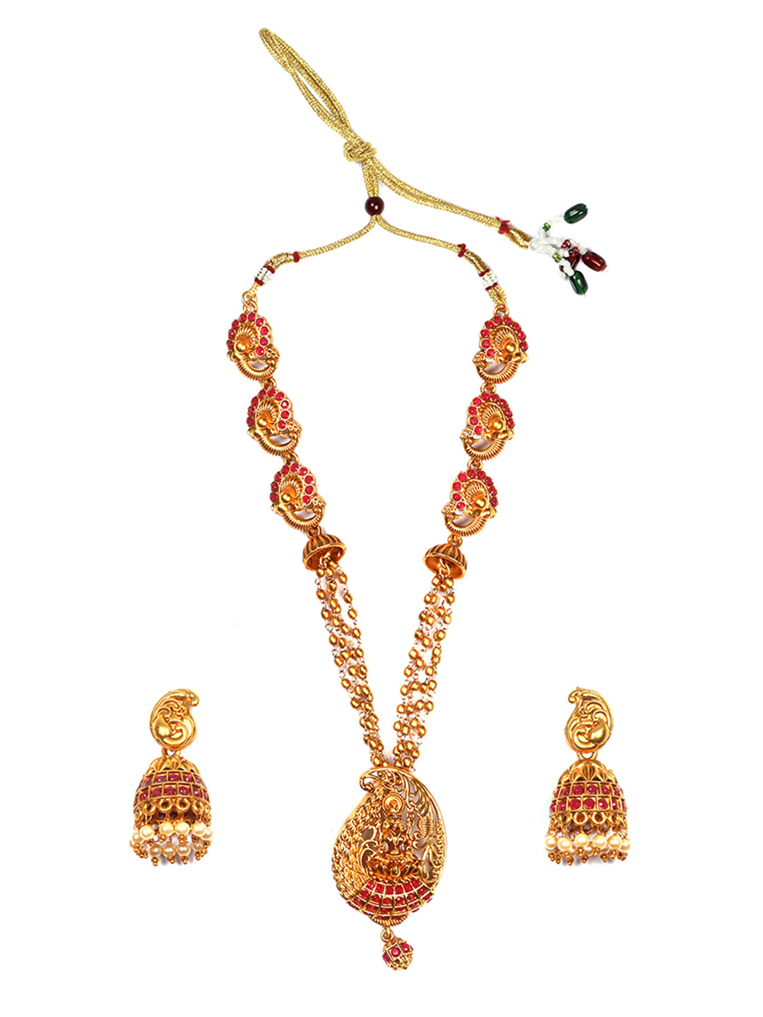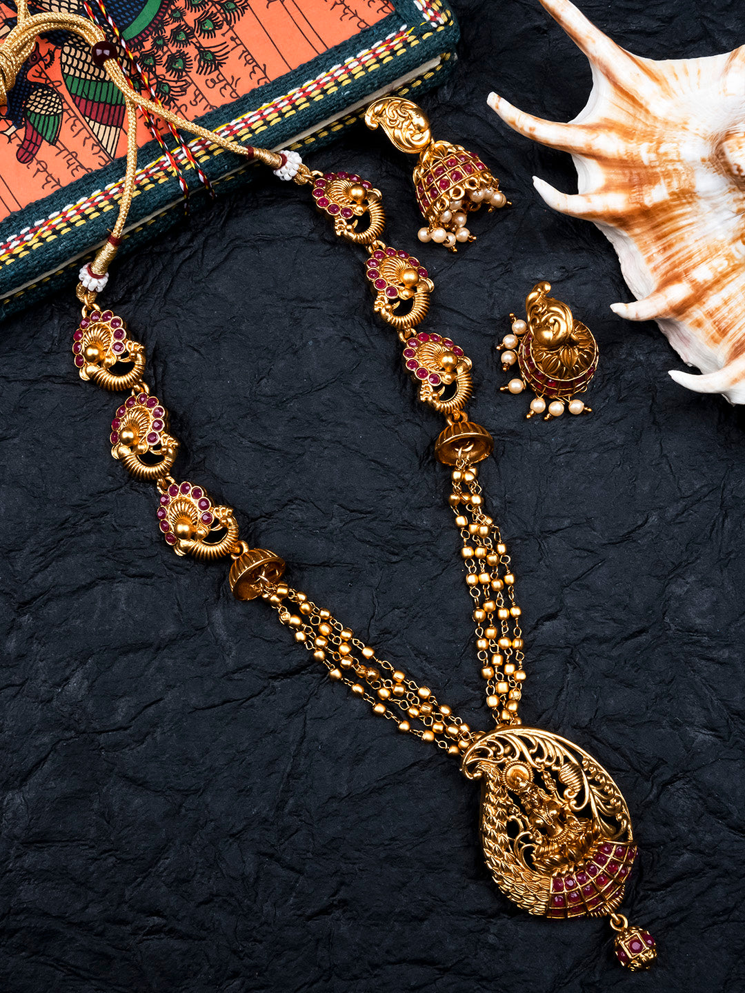 Introducing StileAdda's Luxurious Kemp Paan Pendant Set. This set exudes opulence and charm with its stunning Kemp stones and intricately designed paan-shaped pendant with Goddess Laxmi Design over it. Perfect for adding a touch of regal elegance to your attire, whether it's a festive occasion or a special event, this pendant set is sure to dazzle and delight.