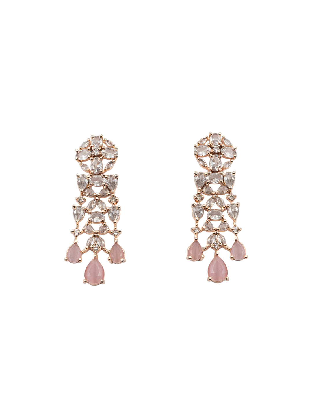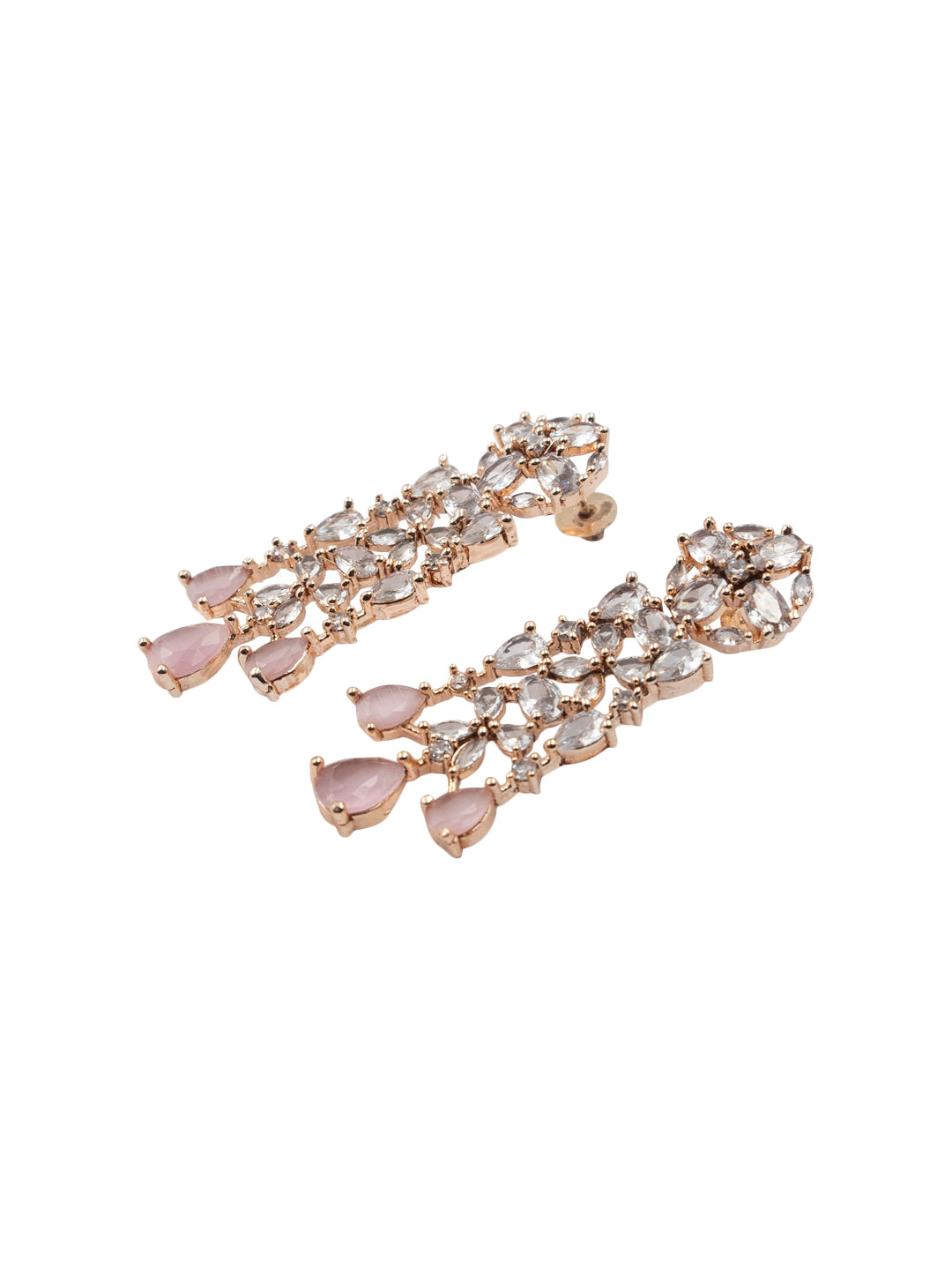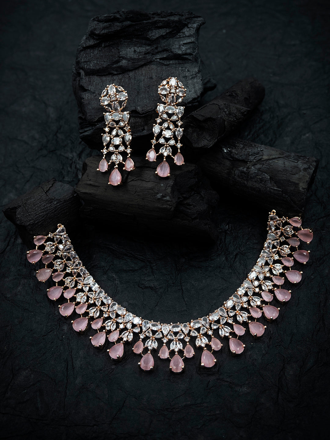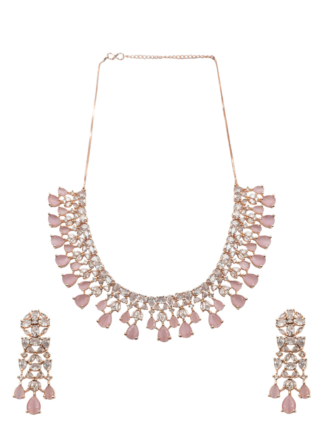 This StileAdda's stunning Rose Gold Plated AD and CZ Studded Flower Motif Bridal Necklace Set adds an elegant touch to any bridal ensemble. The intricate flower design, adorned with sparkling AD and CZ stones, exudes a timeless beauty. Perfect for weddings or special occasions, this necklace set is a must-have for any fashion-forward bride.