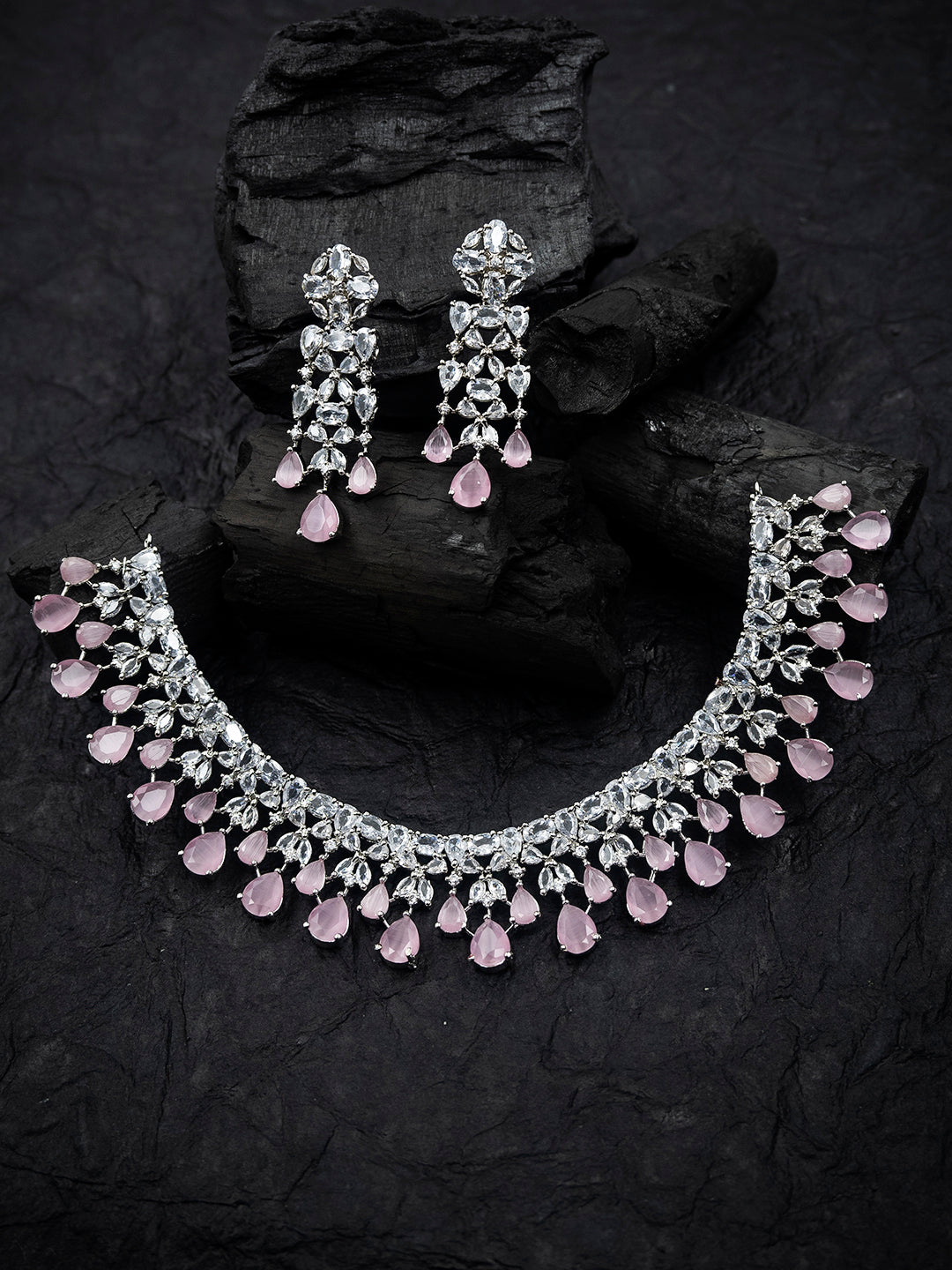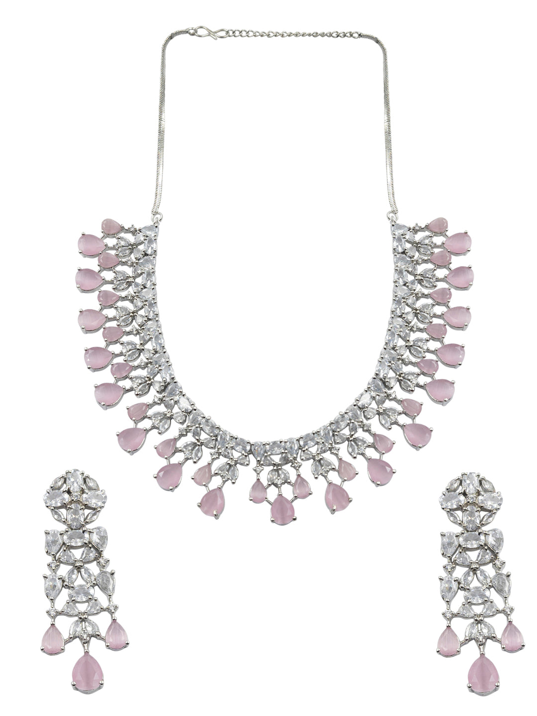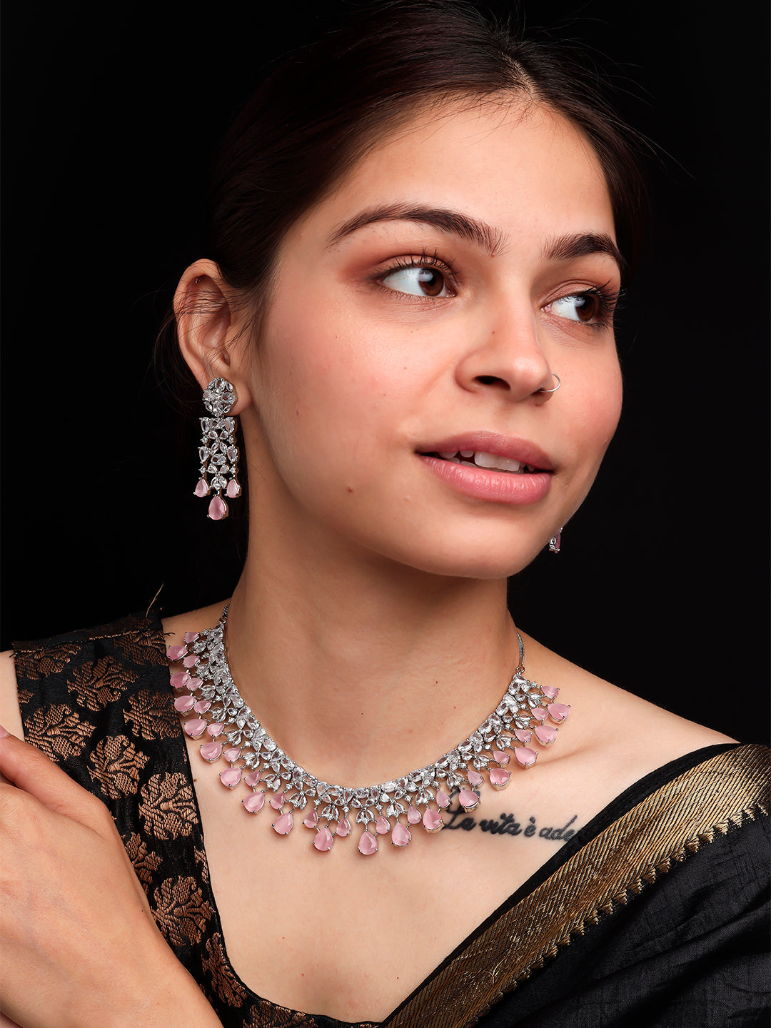 Silver Plated Pink AD and CZ Studded Flower Motif Bridal Necklace Set