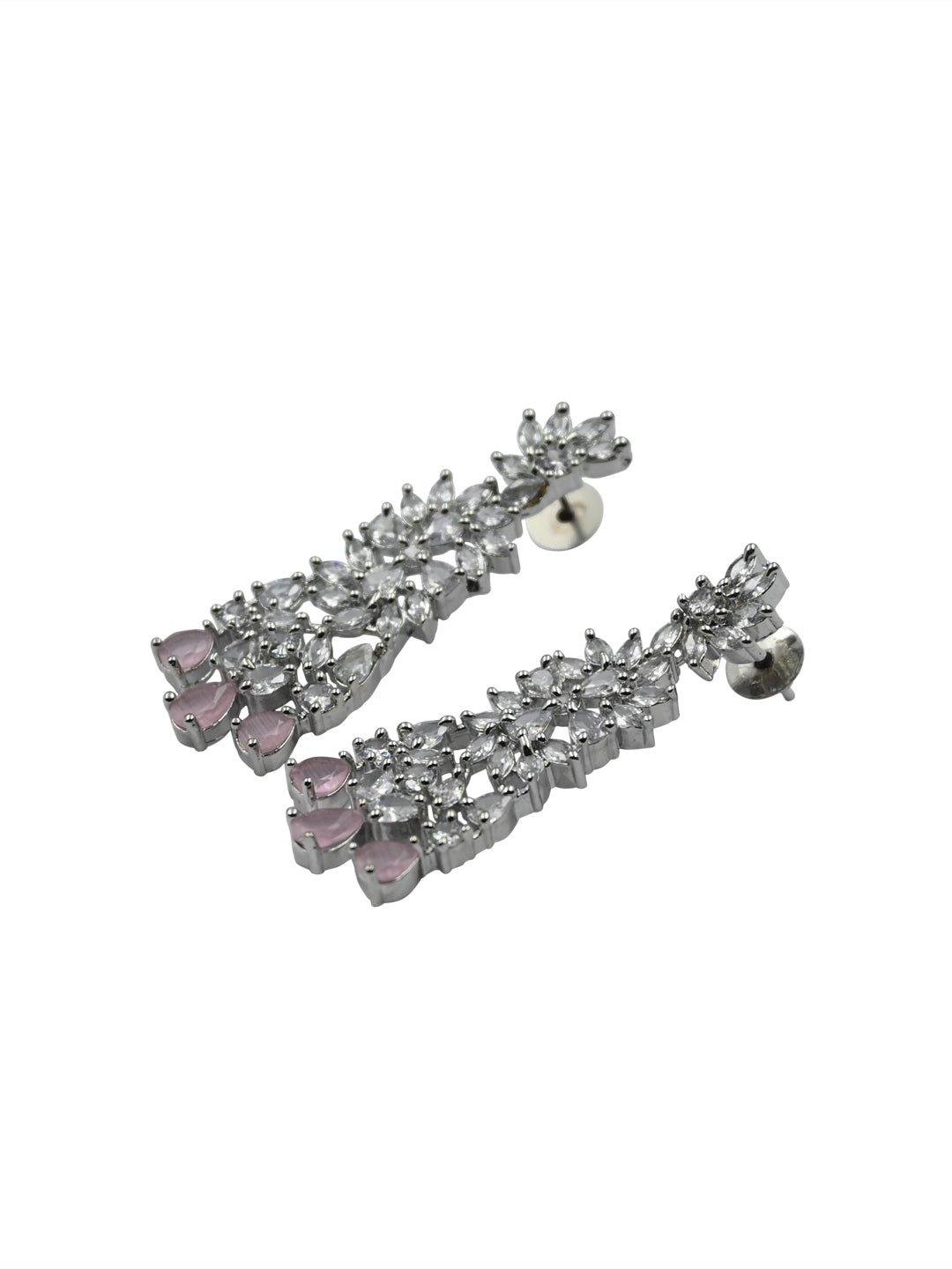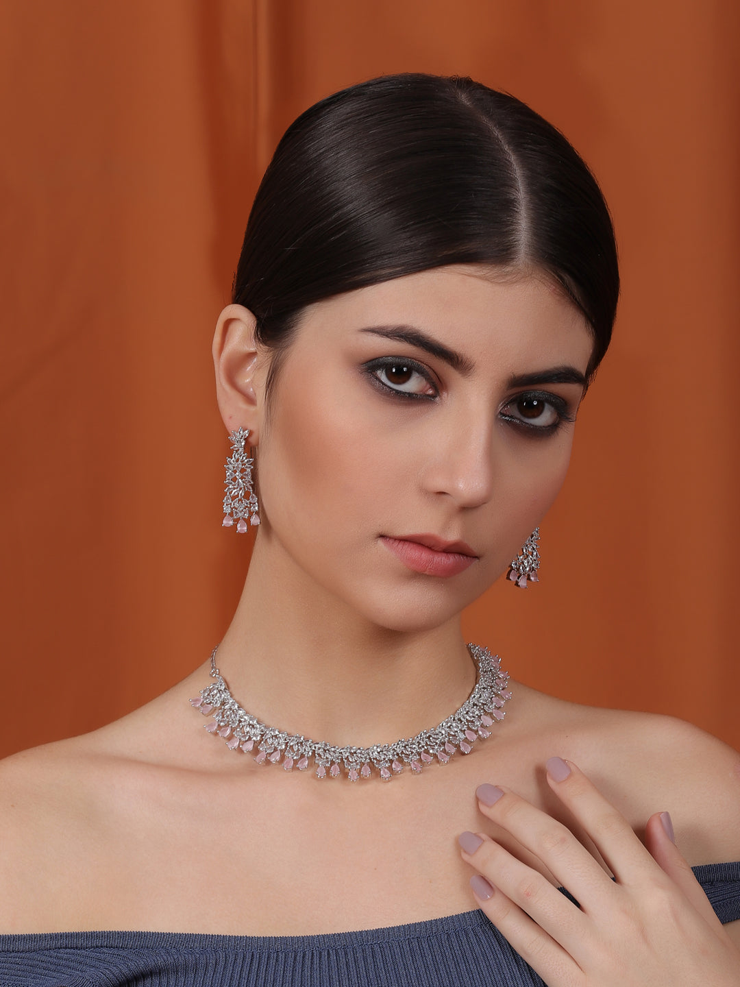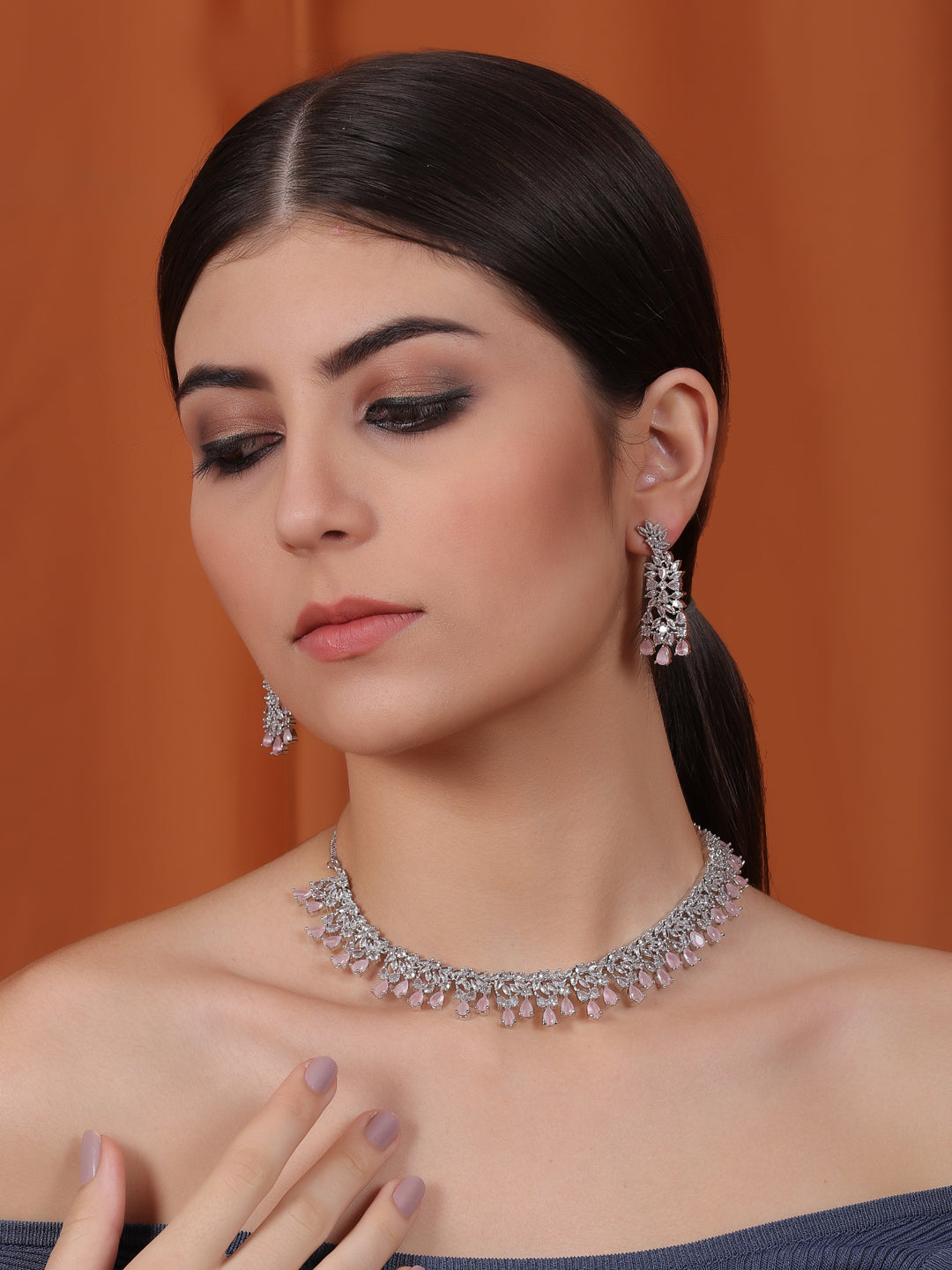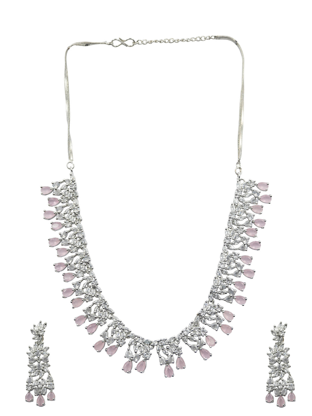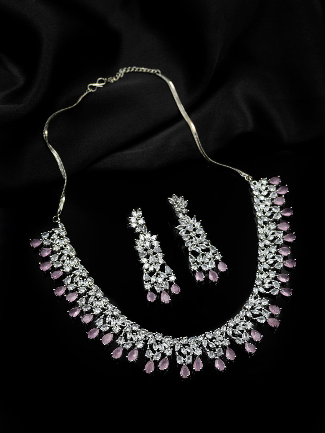 Sleek Elegant Silver Plated Pink AD Studded Designer Necklace Set | Shop Now