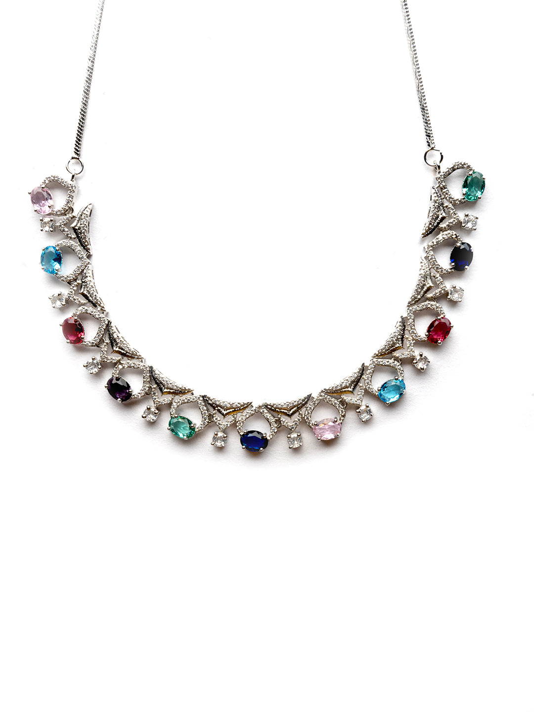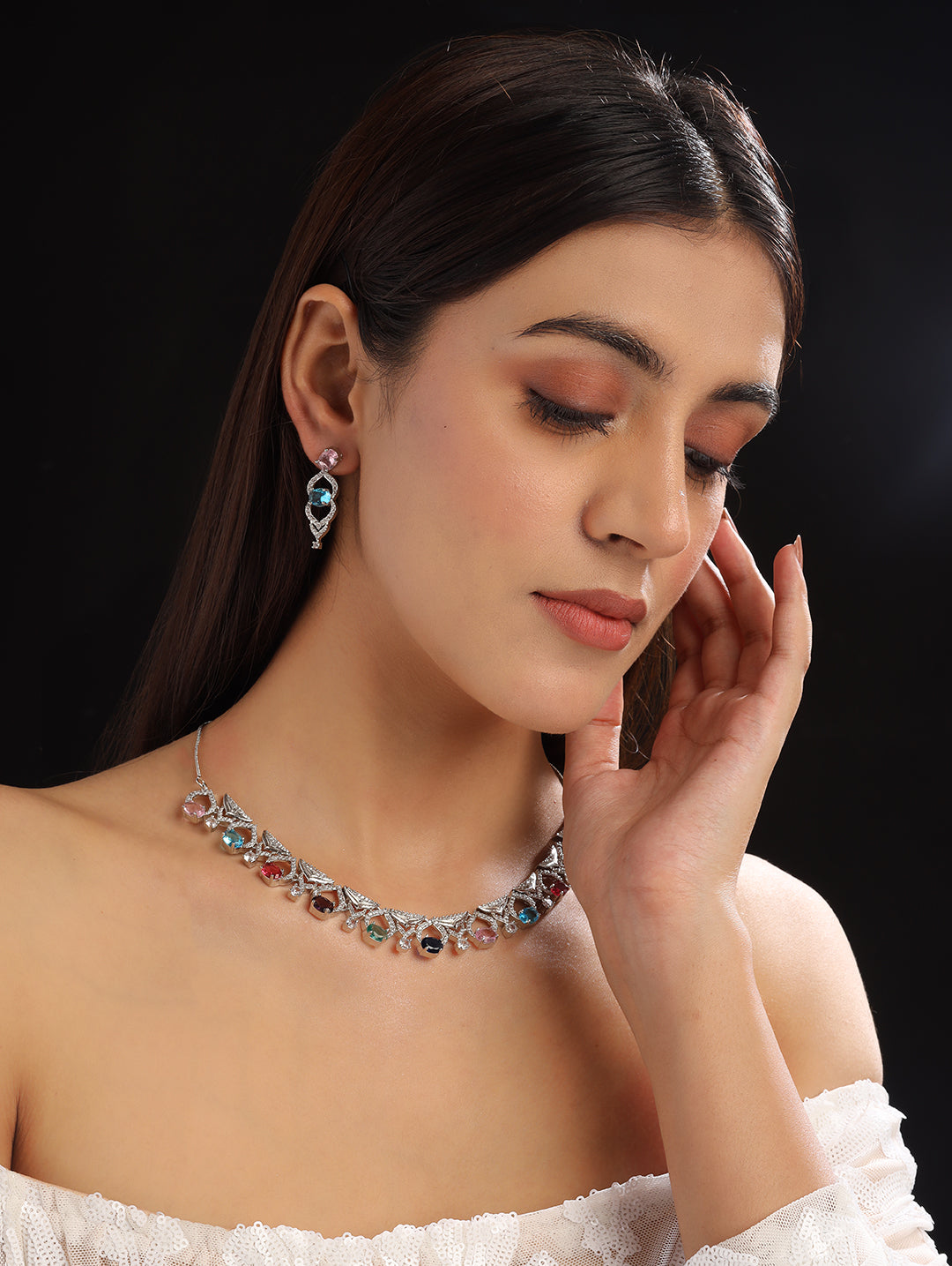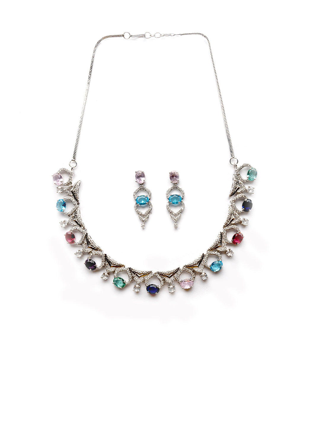 Elevate your party look to a whole new level of glamour with StileAdda's exquisite Designer Sparkling AD Necklace Set. This showstopper ensemble features magnificent tear-shaped AD stones paired with sparkling round CZ stones that are sure to steal the spotlight wherever you go.
