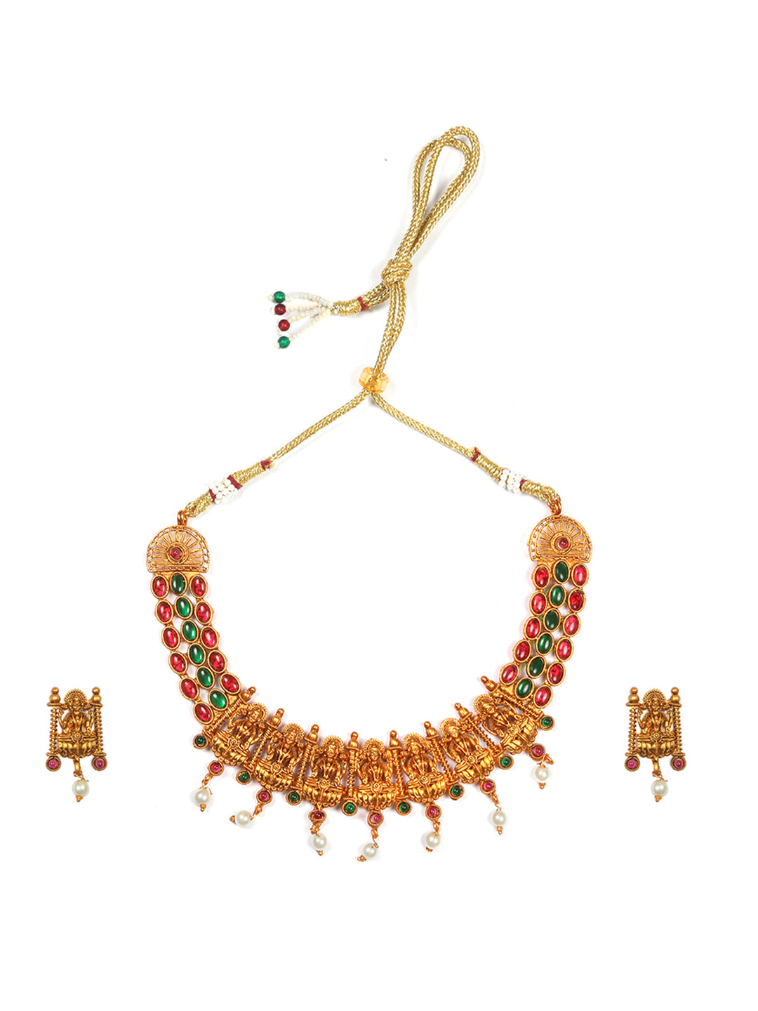 Presenting StileAdda's exquisite Traditional Laxmi Multi Kemp Necklace Set. This set is a celebration of timeless elegance, featuring intricate designs and vibrant Kemp stones that pay homage to the goddess Laxmi. Perfect for traditional events or adding a touch of cultural charm to your look, this necklace set is sure to be the highlight of any occasion.