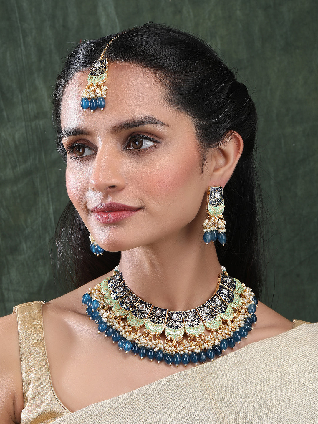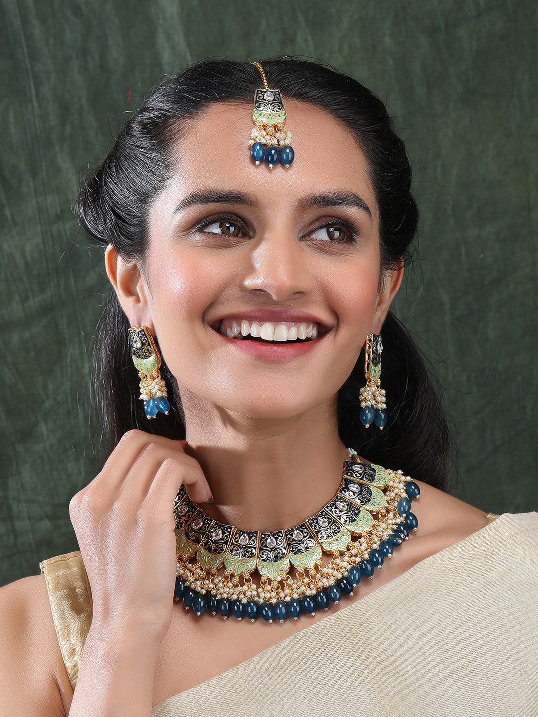 Elevate your style with StileAdda's exquisite Dual Meenakari Kundan Droplet Necklace Set. Handcrafted with intricate Meenakari work and shimmering Kundan stones, this statement piece exudes timeless elegance. Shop now and sparkle with sophistication!