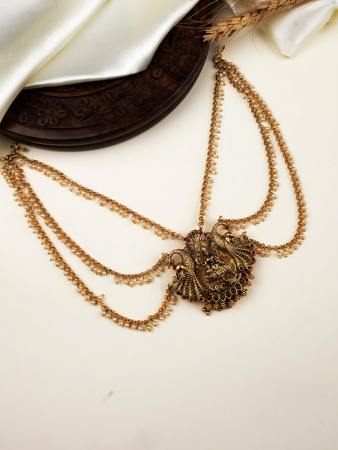 Antique Temple Jada Billa is crafted with intricate temple designs and paired with a delicate mattal. The hair accessory combines traditional craftsmanship with authentic elegance. The ornate detailing catches light beautifully, adding a regal touch to your wedding day ensemble. Perfect for brides seeking to honor cultural heritage while making a sophisticated statement, this piece seamlessly complements traditional sarees and jewelry. An investment in classic bridal beauty that transcends trends.