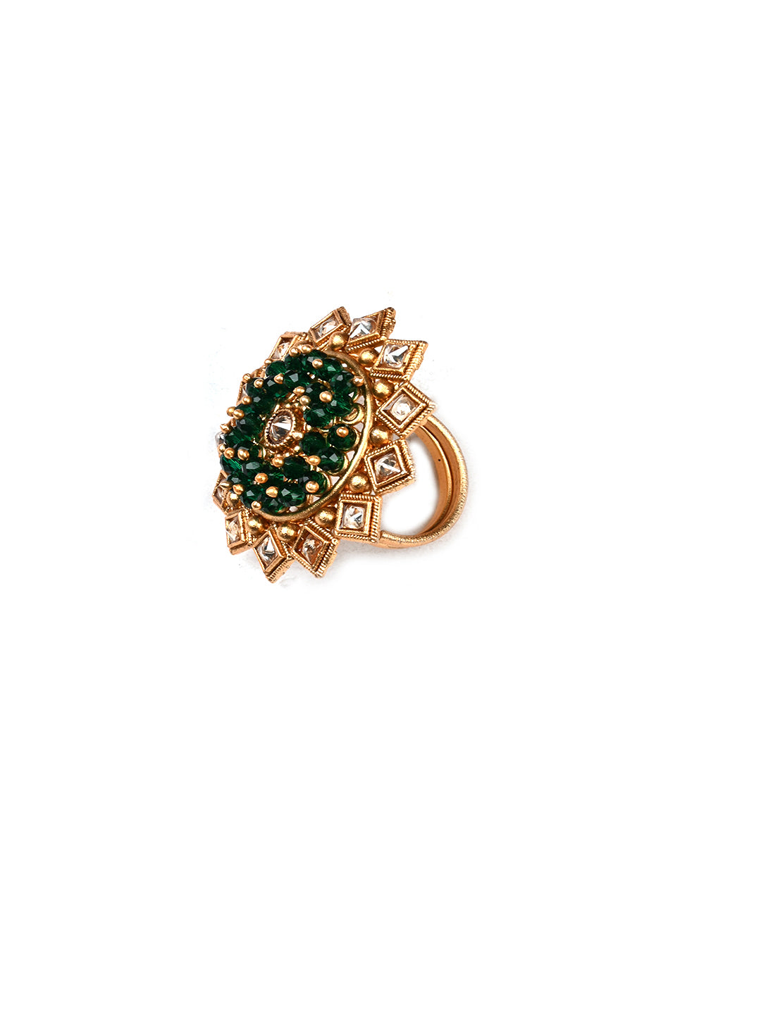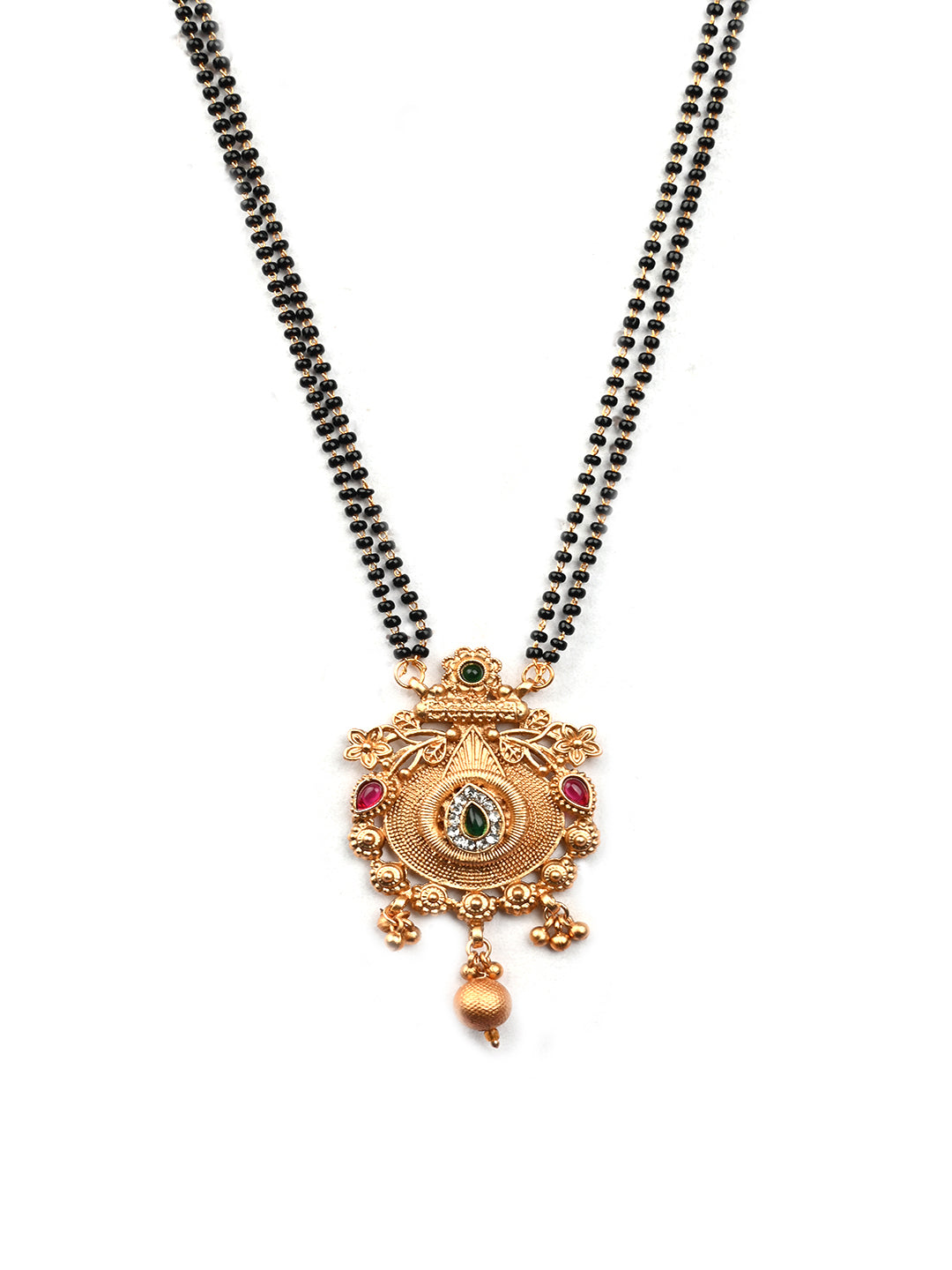 White Stone Mangalsutra With Long Double Line Black Beads Mala and Green Polki Ring