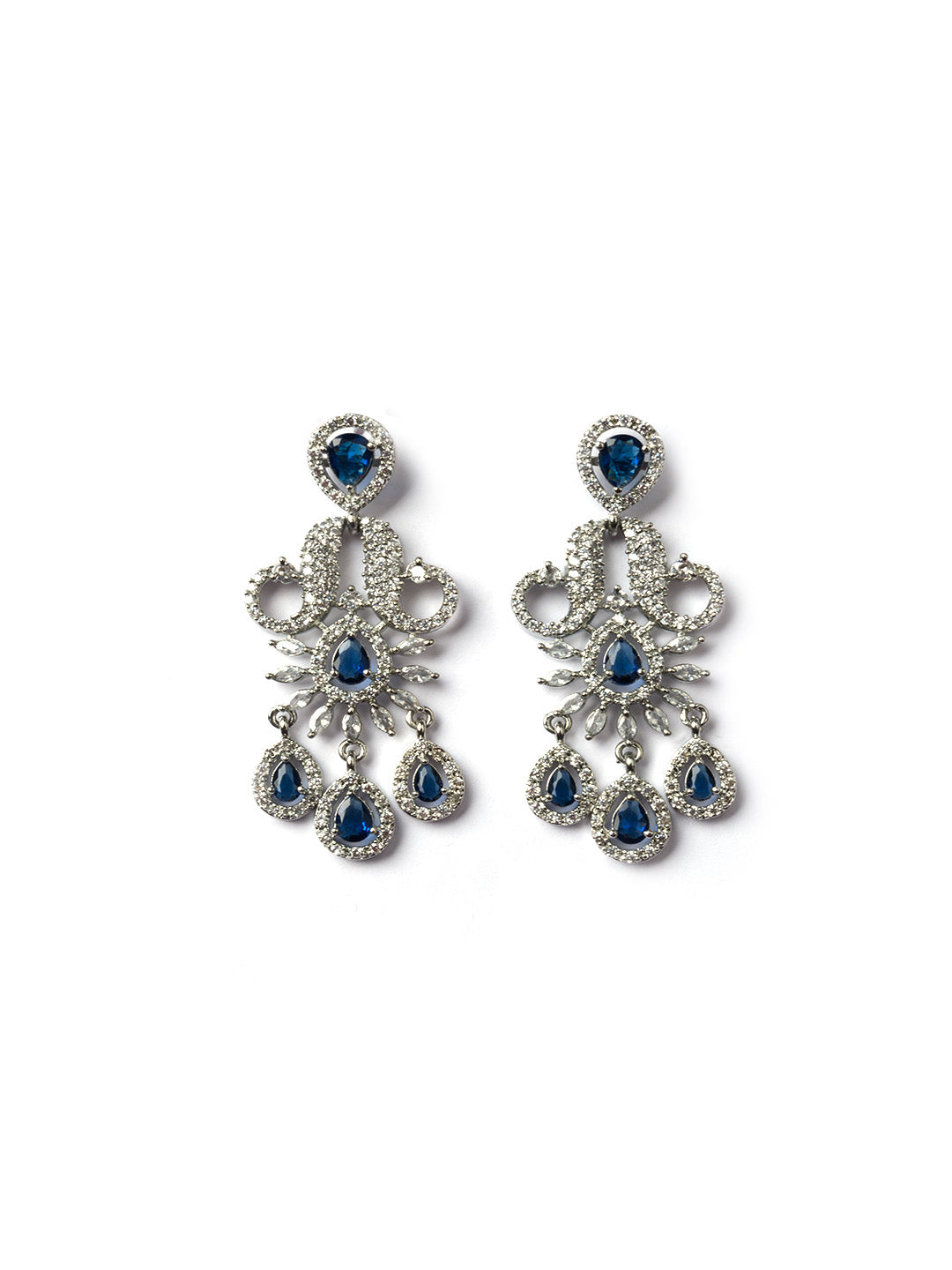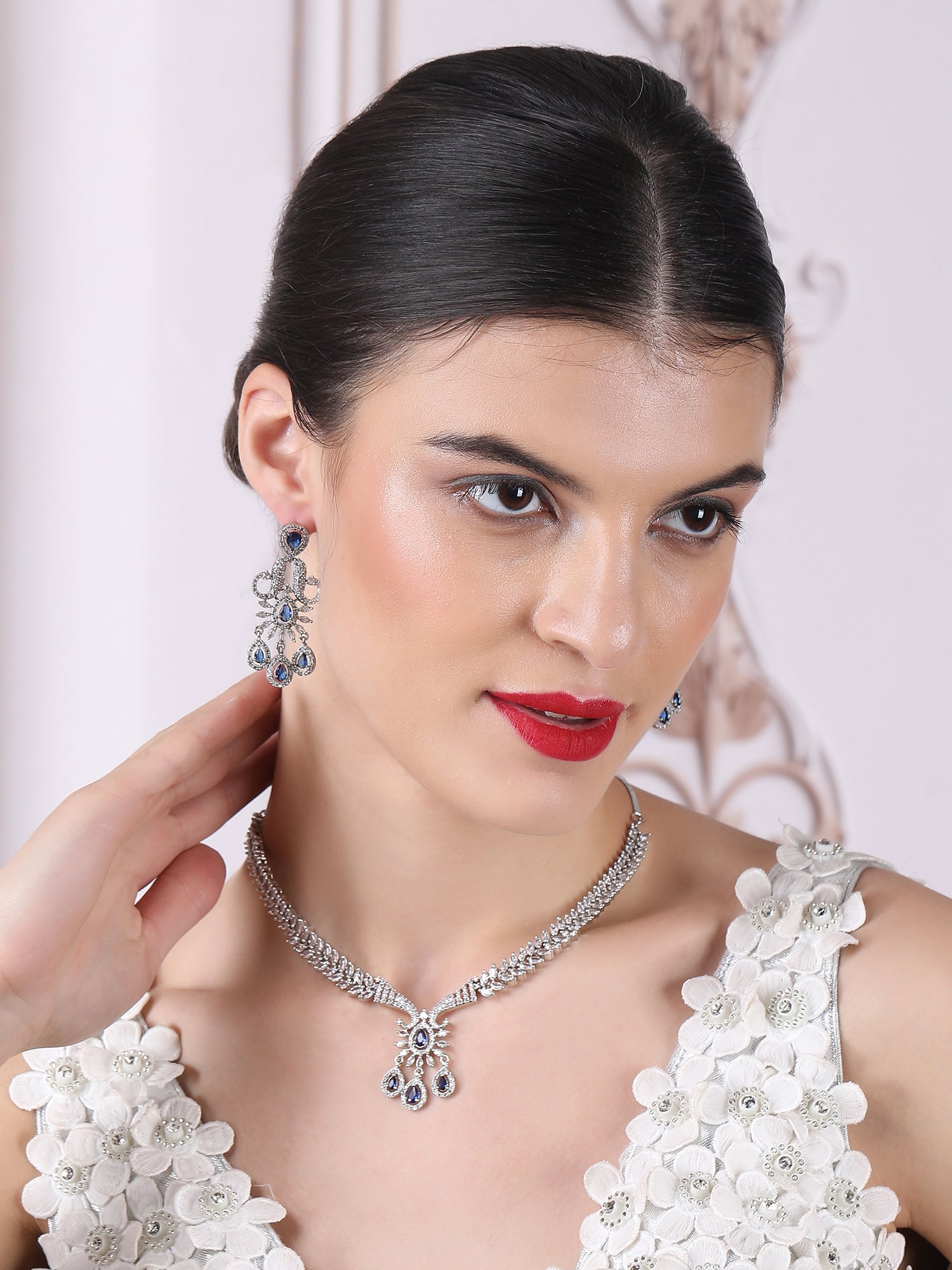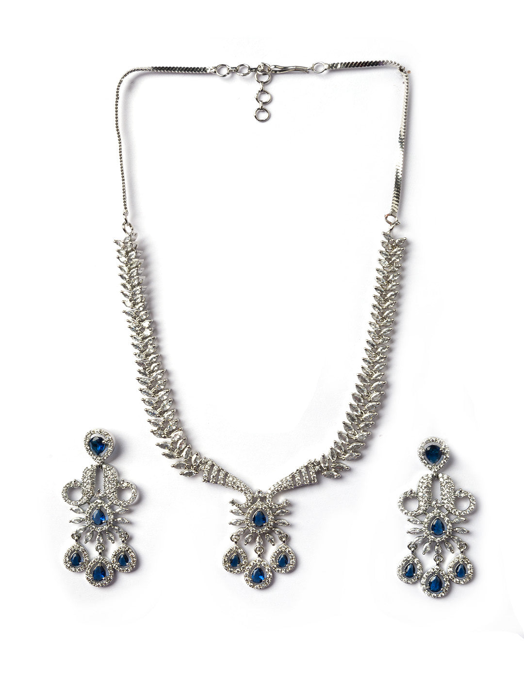 Silver Polished AD Flower Patti Necklace Set - Blue
