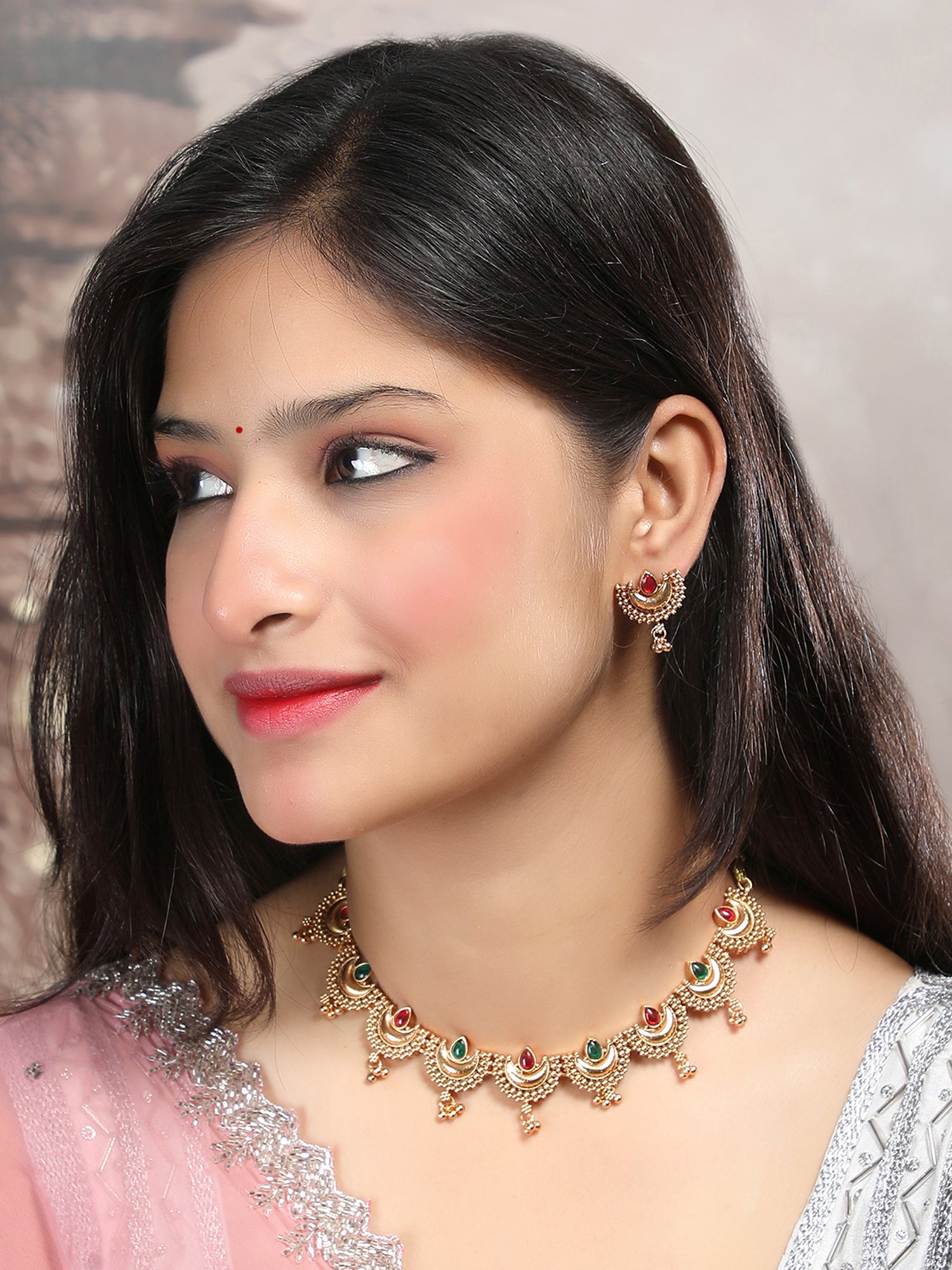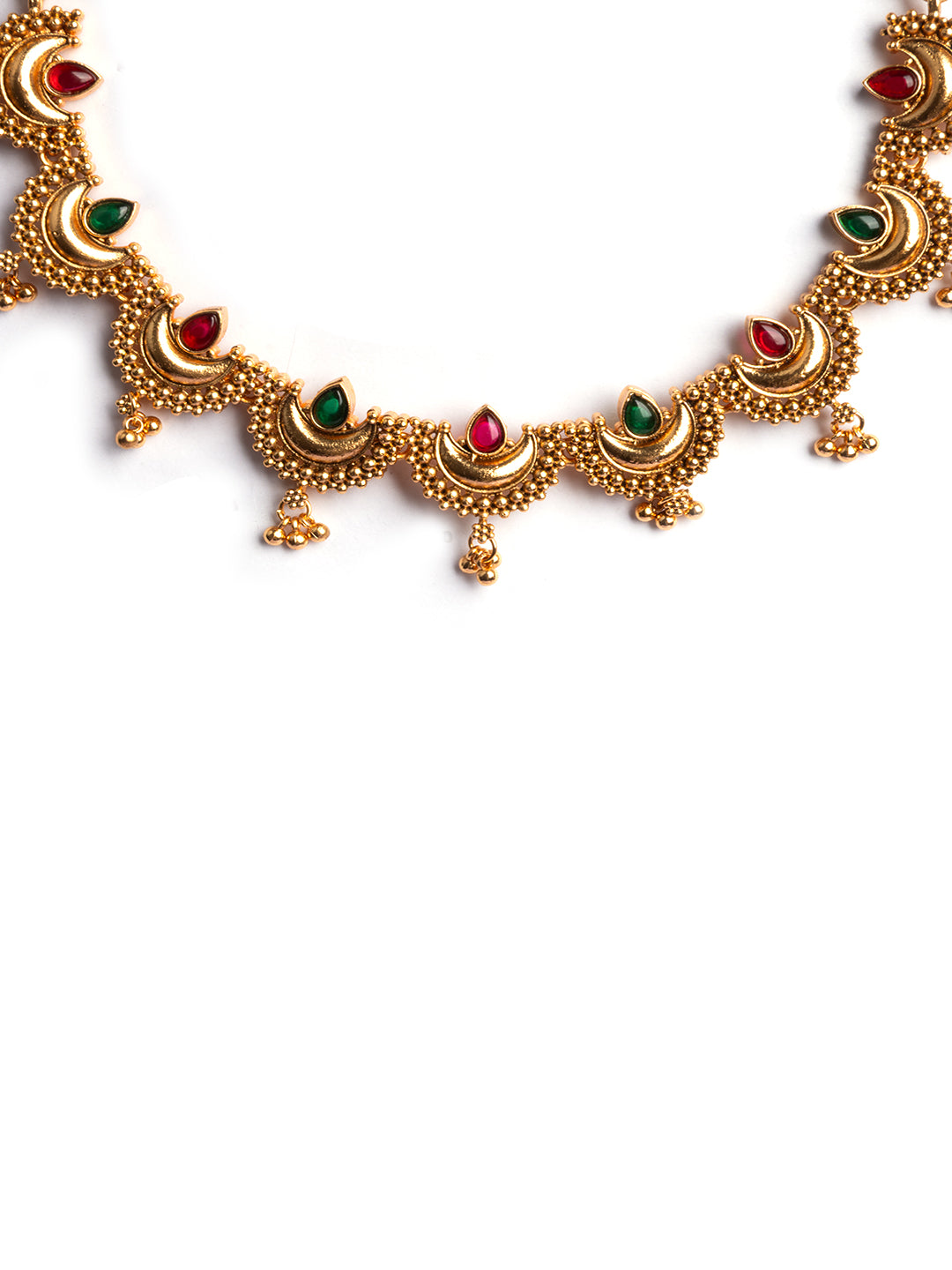 This unique necklace set by StileAdda features a series of half-moon shaped motifs in a radiant gold finish. Its elegant and structured design adds a touch of regal charm, making it perfect for festive wear, weddings, and ethnic celebrations.