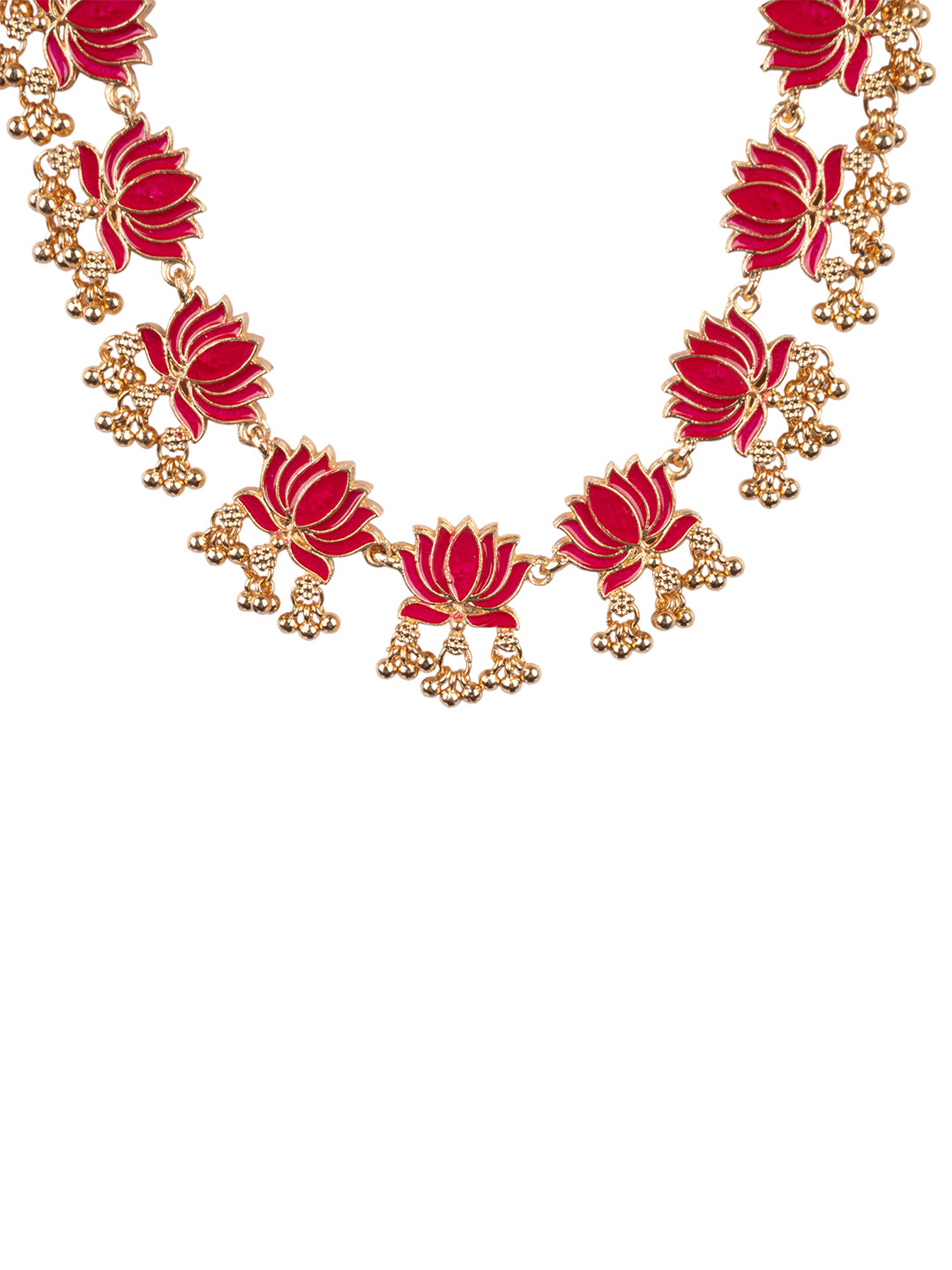 Celebrate tradition with this exquisite meenakari necklace set, where intricate handpainted lotus motifs meet timeless craftsmanship. Each piece features vibrant green enamel work layered over precious metal, creating depth and luminosity that catches light beautifully. The set includes a coordinated necklace and complementary pieces, perfect for weddings, festivals, and special occasions.