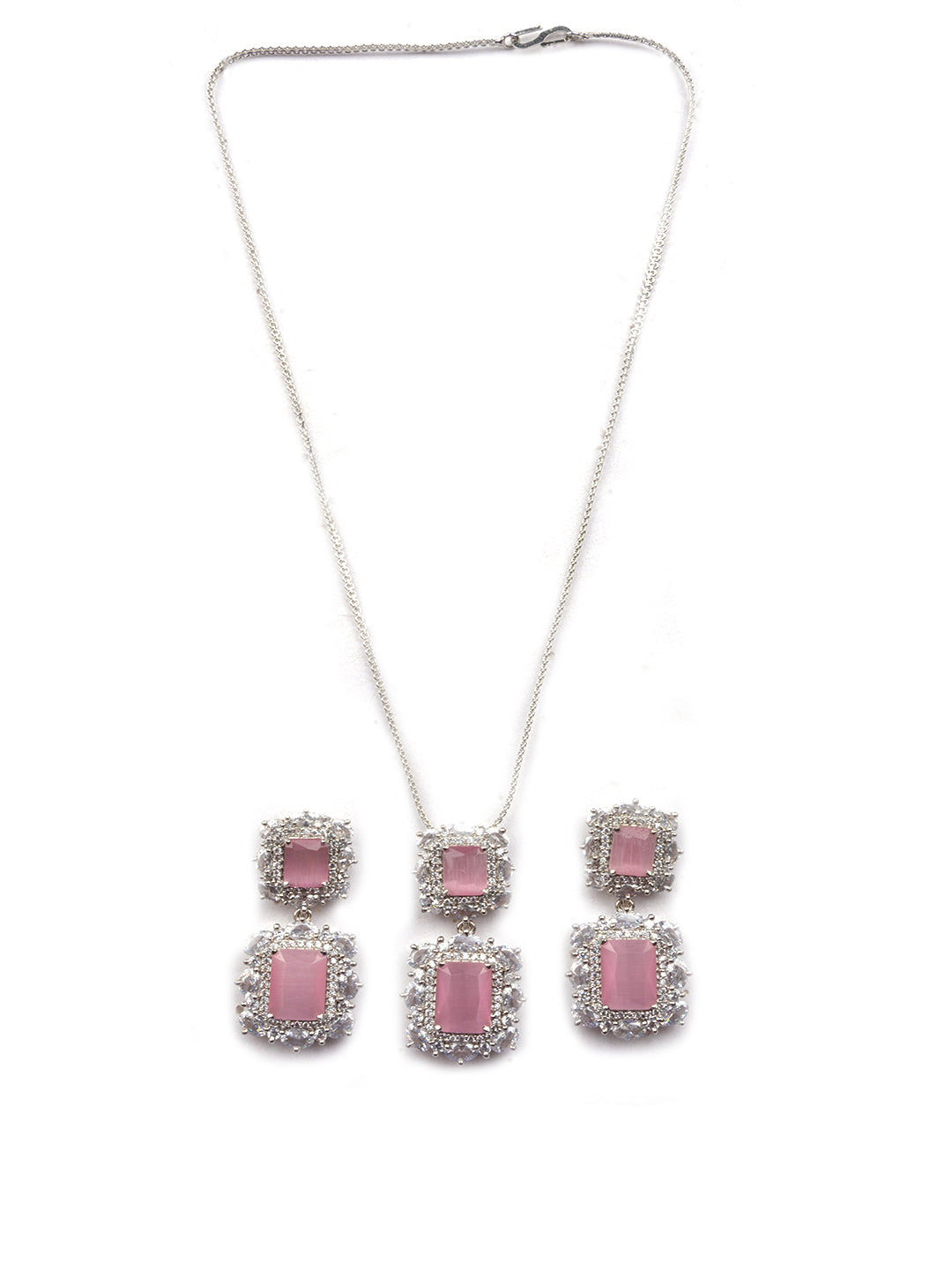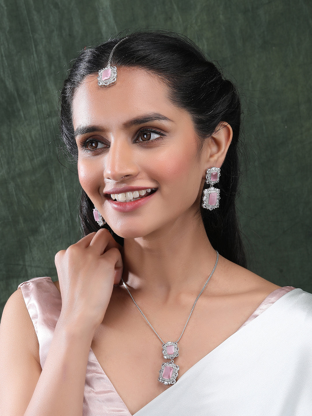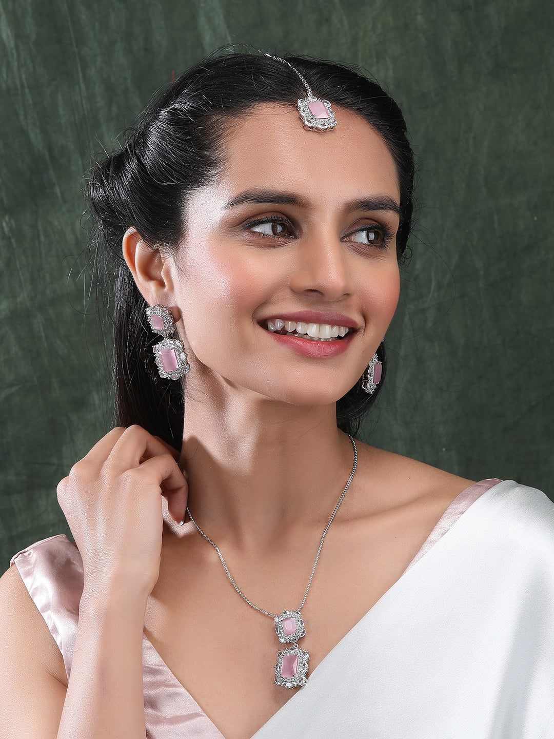 Unleash your inner elegance with our Silver Plated Square CZ Big Pendant Set, complete with matching earrings and maangtika. Crafted with precision and adorned with sparkling cubic zirconia, this set is sure to turn heads and make a statement wherever you go. Elevate your style effortlessly with this stunning jewelry ensemble.