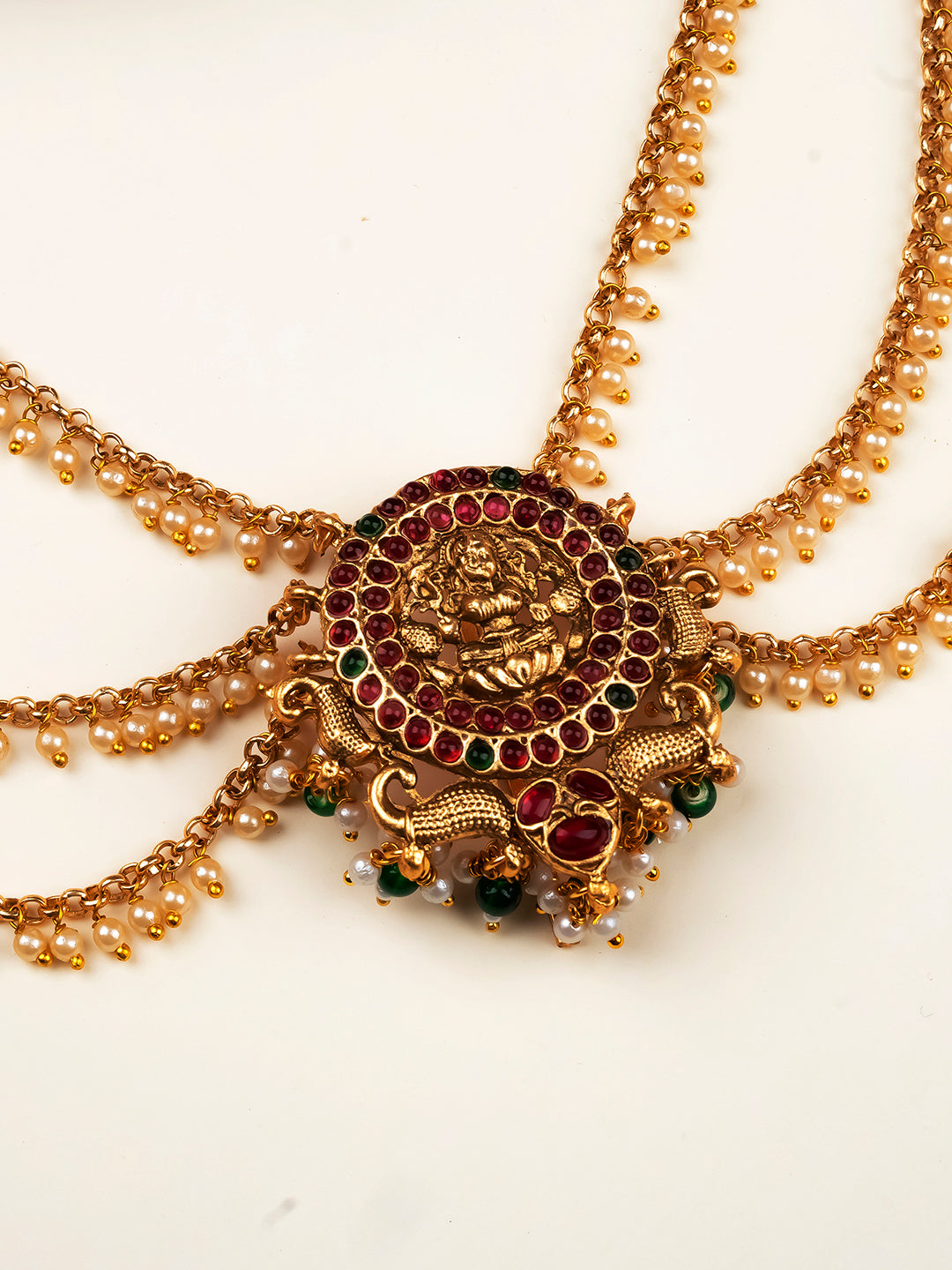 This exquisite handcrafted temple jada billai seamlessly blends heritage craftsmanship with elegant design. Featuring intricate antique detailing and a decorative gold plated brooch, this piece is adorned with a delicate pearl chain that adds sophistication to any hairstyle. Perfect for weddings, festivals, and special occasions, it captures the essence of classical Indian jewelry artistry. Each piece is meticulously crafted to ensure authenticity and durability, making it a cherished addition to your traditional jewelry collection.