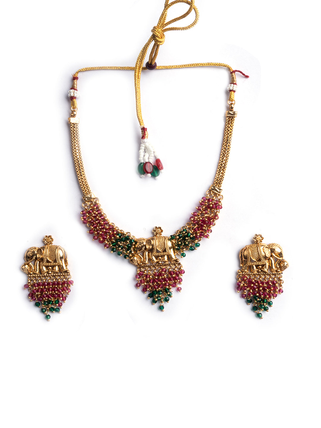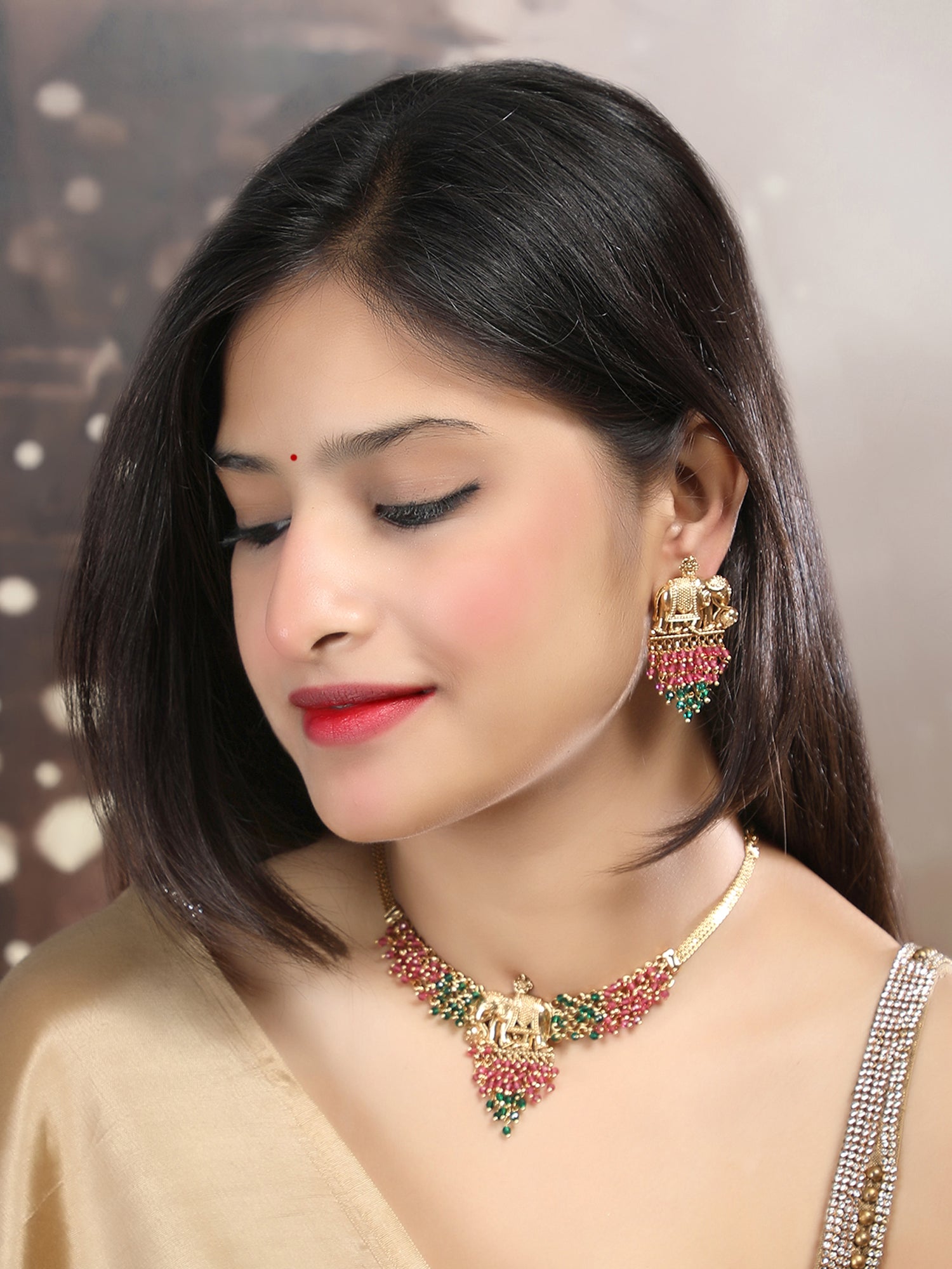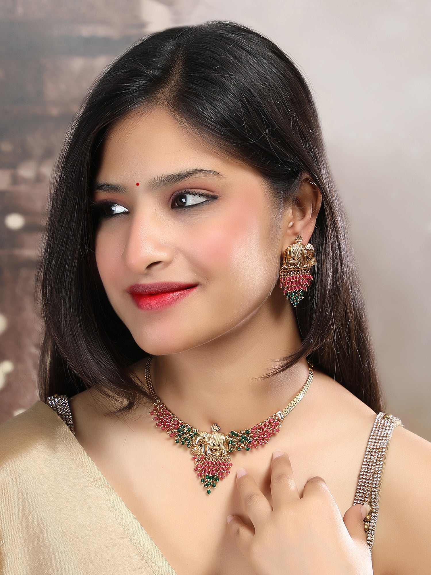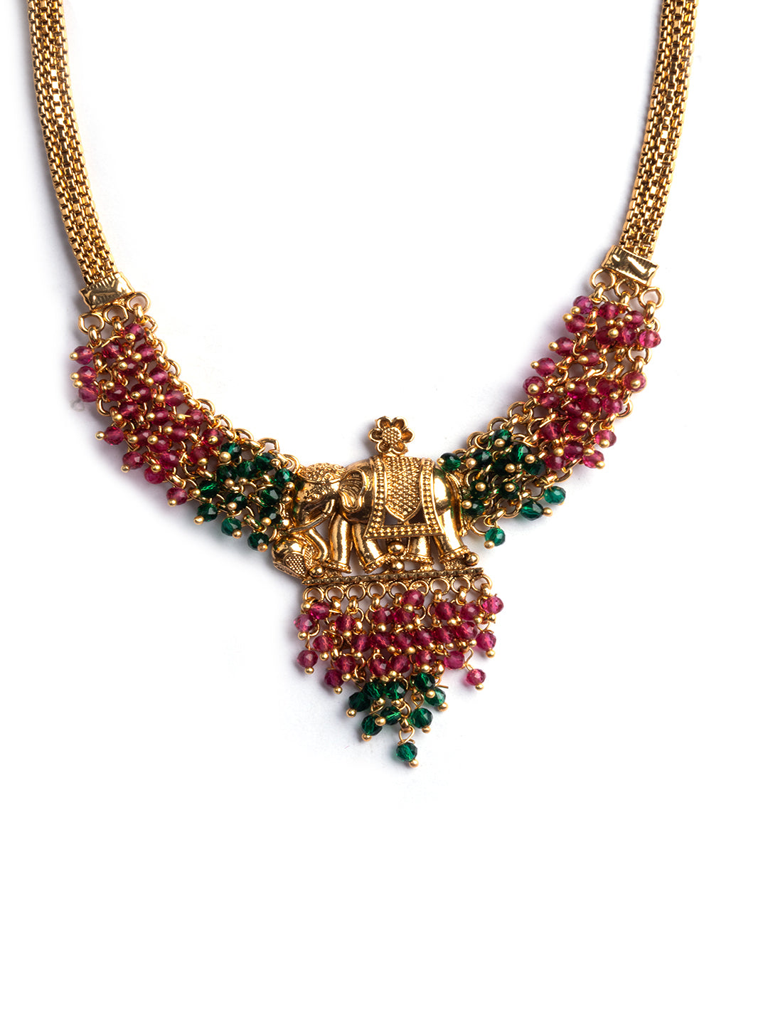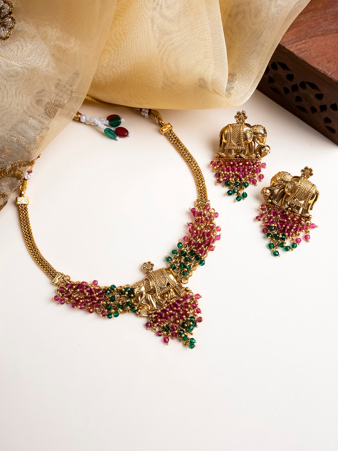 Elevate your elegance with the Unique Green Hydra Beads Gaj Necklace Set. Featuring vibrant green hydra beads intricately arranged for a striking look, this set adds a refreshing splash of color to any outfit. Perfect for special occasions, it combines traditional charm with contemporary style, ensuring you stand out with grace and confidence.