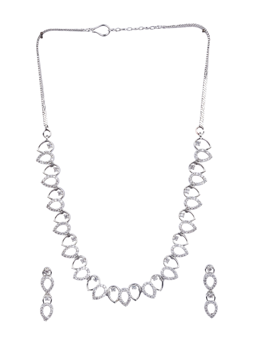 This stunning necklace set showcases intricately cut American diamonds that deliver exceptional brilliance and sparkle. The designer cut work demonstrates superior artisanal craftsmanship, with each facet precisely engineered to maximize light reflection. Paired with sleek, complementary earrings, the set creates a harmonious and refined aesthetic suitable for formal occasions, celebrations, or discerning everyday wear.