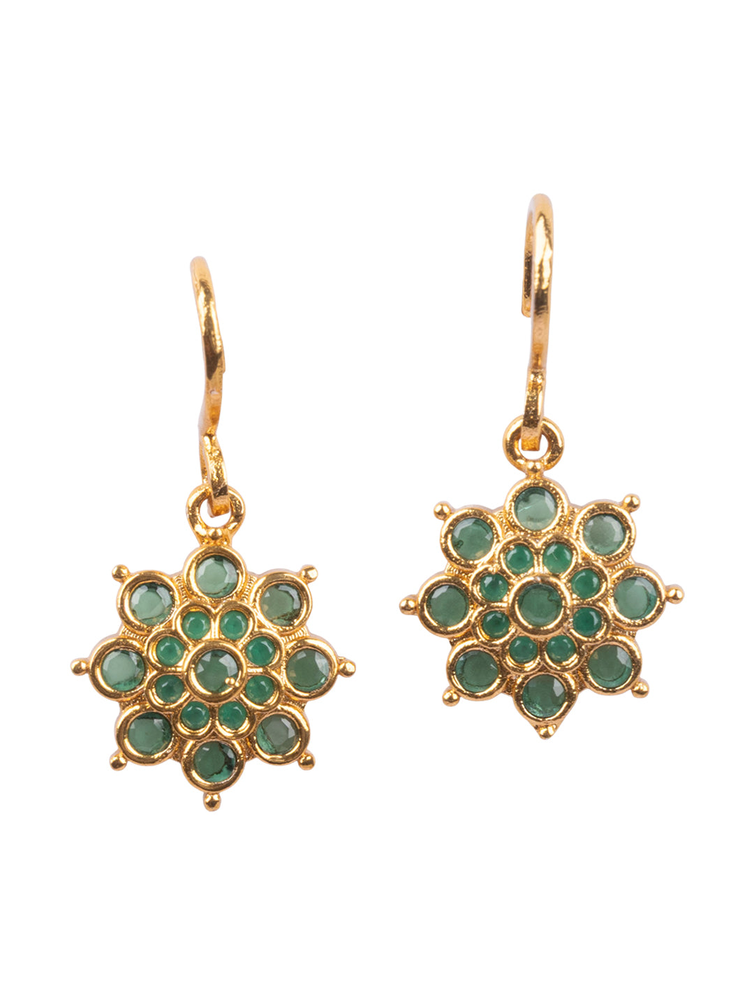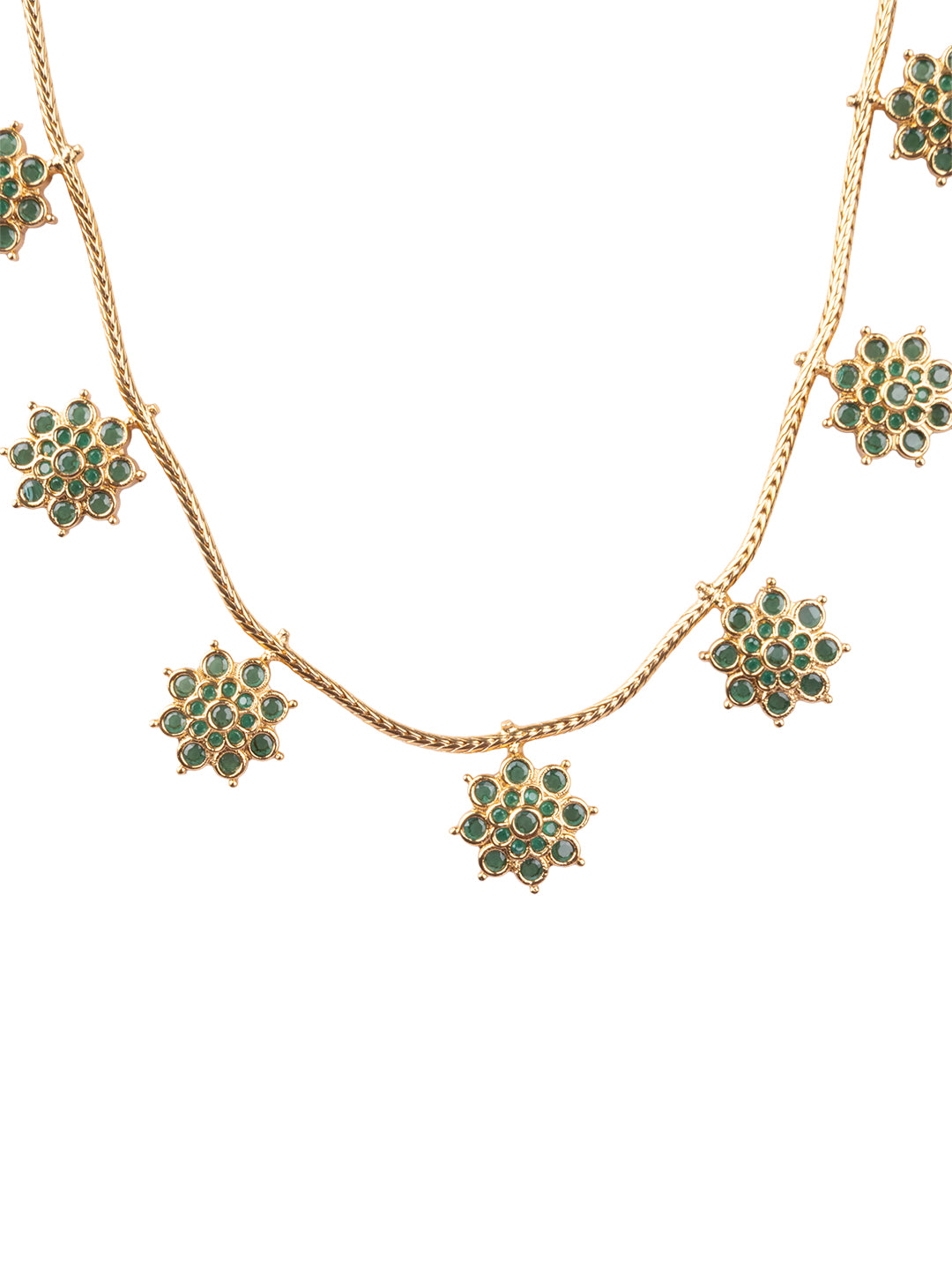 This exquisite necklace set showcases authentic Indian craftsmanship with intricate green floral detailing set against lustrous gold plating. The design draws inspiration from traditional jewelry-making techniques, featuring delicate botanical motifs that reflect timeless elegance. Each element is carefully crafted to balance ornamental beauty with wearable comfort, making it an ideal choice for those who appreciate genuine artisanal jewelry with cultural significance.